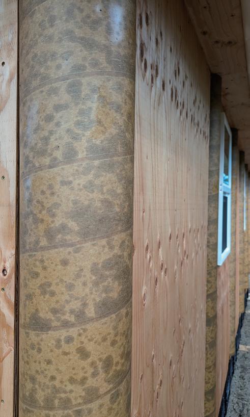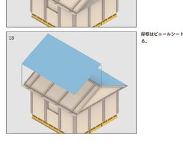 [H]屋根材に断熱材を埋め込み、その上にビニールシートを被せ る。ビニールシートの形を決めておくことで、ビスを撃つのみで 外装が完成する。