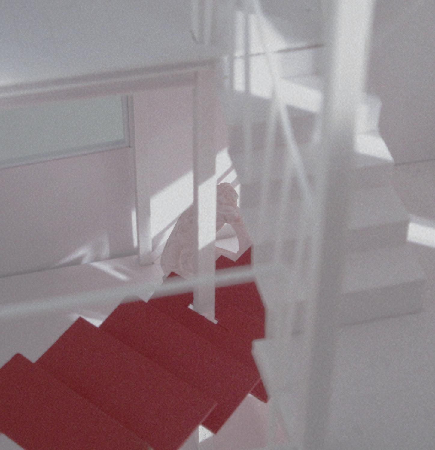 [A]屋上階への幅の広い階段の 間により、自然光が採光層を通 して上部のガラスから<光の間>へと降りそそぐ。