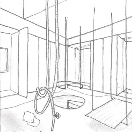 水の出口を1つにまとめたことで、6m四方の2階の居室か ら間仕切り壁は取り払われ、水をためる/様々な行為を許容 する起伏のある床に、天井からフックがたくさん垂れ下がっ ています。
