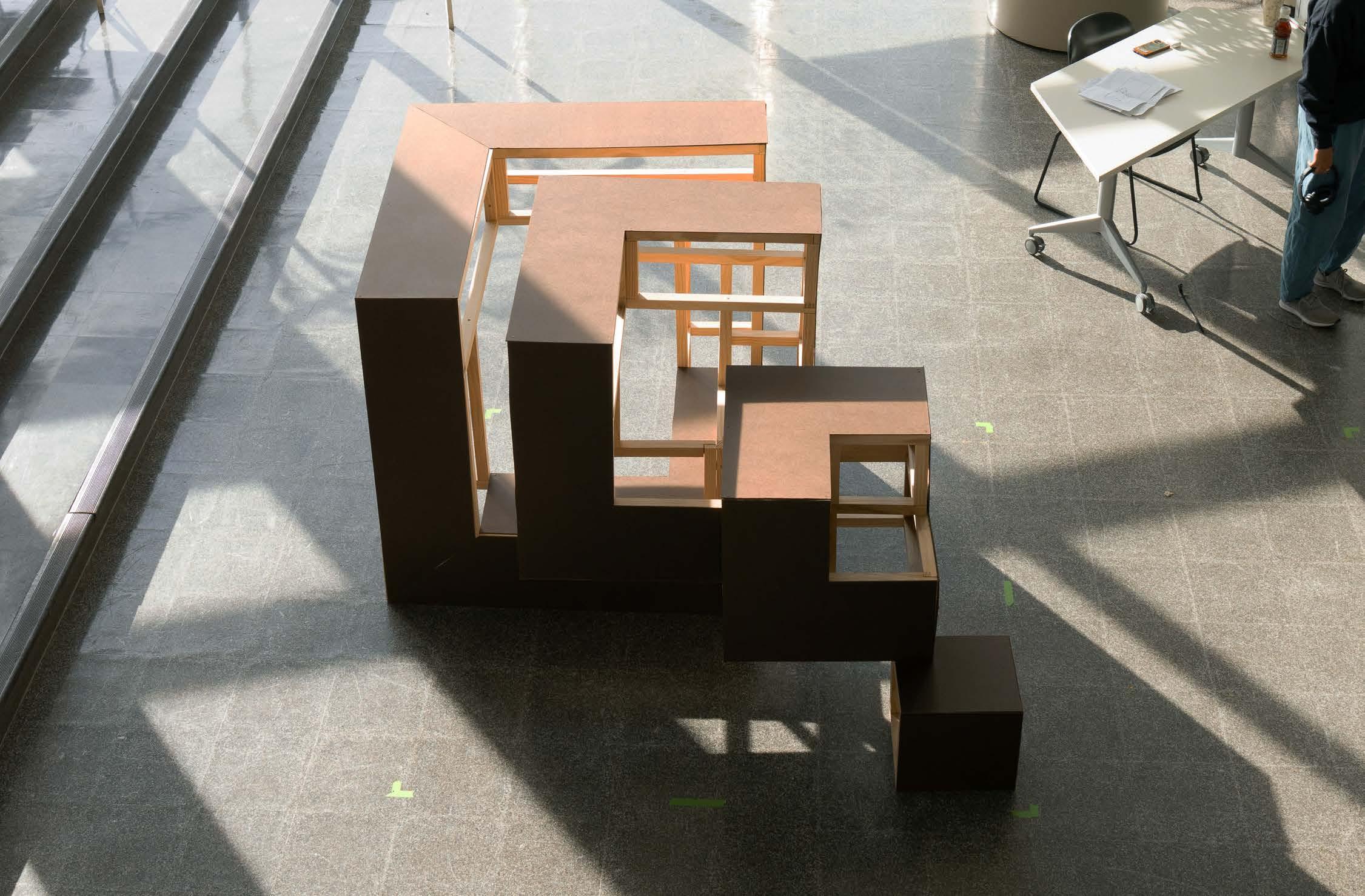 Nest is a multi-scale fabrication project exploring stacking as a structural system. Beginning with a cube, Nest takes inspiration from a Russian Nesting Doll. Each module fits within the next, creating modular agency in complete subtraction. The final small scale artifact was individually fabricated as a 6-inch cube constructed in red oak and serves as both the basis for the larger model and as a stand alone evolving explorative piece. Through an 8-person group project, three weeks were divided into planning, drawing and constructing to develop a 4 foot interactive model. In pine board framing and strategic faces, each module is fully constructed and stands independently, utilizing a cantilever and counterweight. Nest becomes a communicative tool to teach students about physical behavior and spatial relationships.