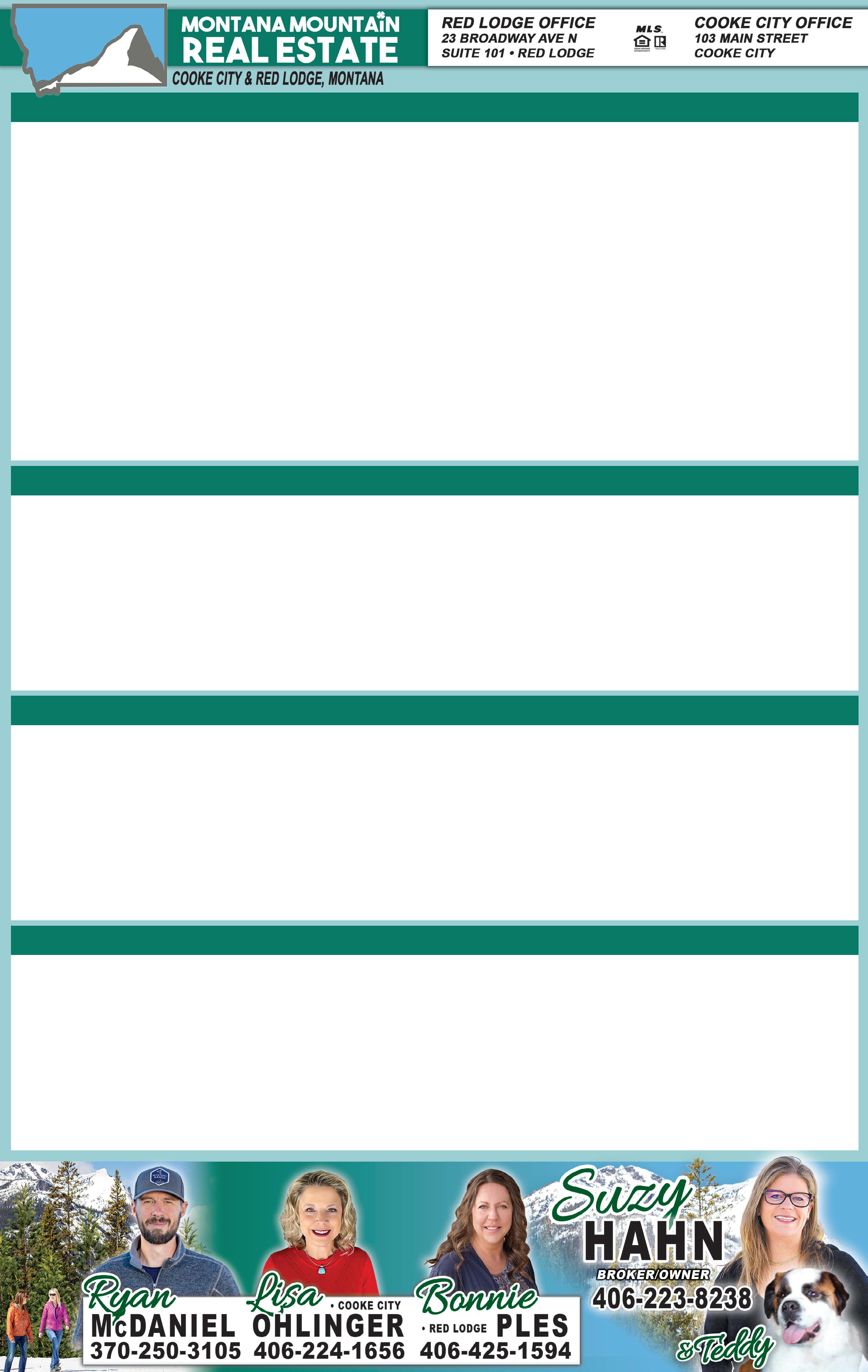 www.BozemanAreaWeeklyRealEstate.com pg. 21 WWW.COOKECITYREALESTATE.COM | WWW.MTMTNREALESTATE. COM SuzyHahnMT@gmail.com 8 LARSON LANE • COOKE