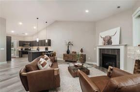 Designed with comfort and modern living in mind, the home features solid-surface countertops, stainless steel appliances, Moen plumbing fixtures, and a gas stove—ideal for everyday cooking or entertaining guests. Custom cabinetry provides ample storage, while the electric fireplace adds warmth and ambiance to the open living area. Stunning lighting selections, a tray ceiling, and durable LVP flooring elevate the style throughout.