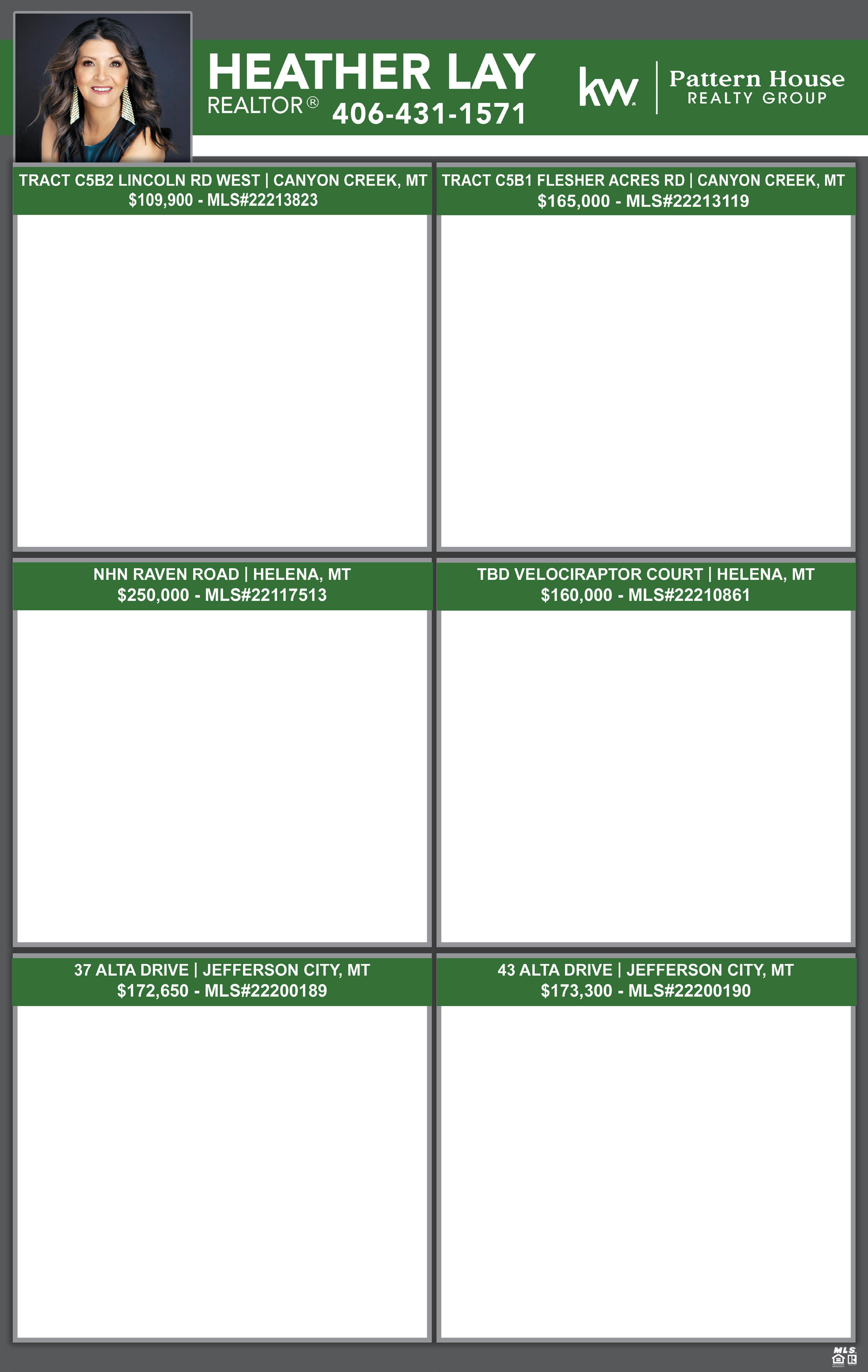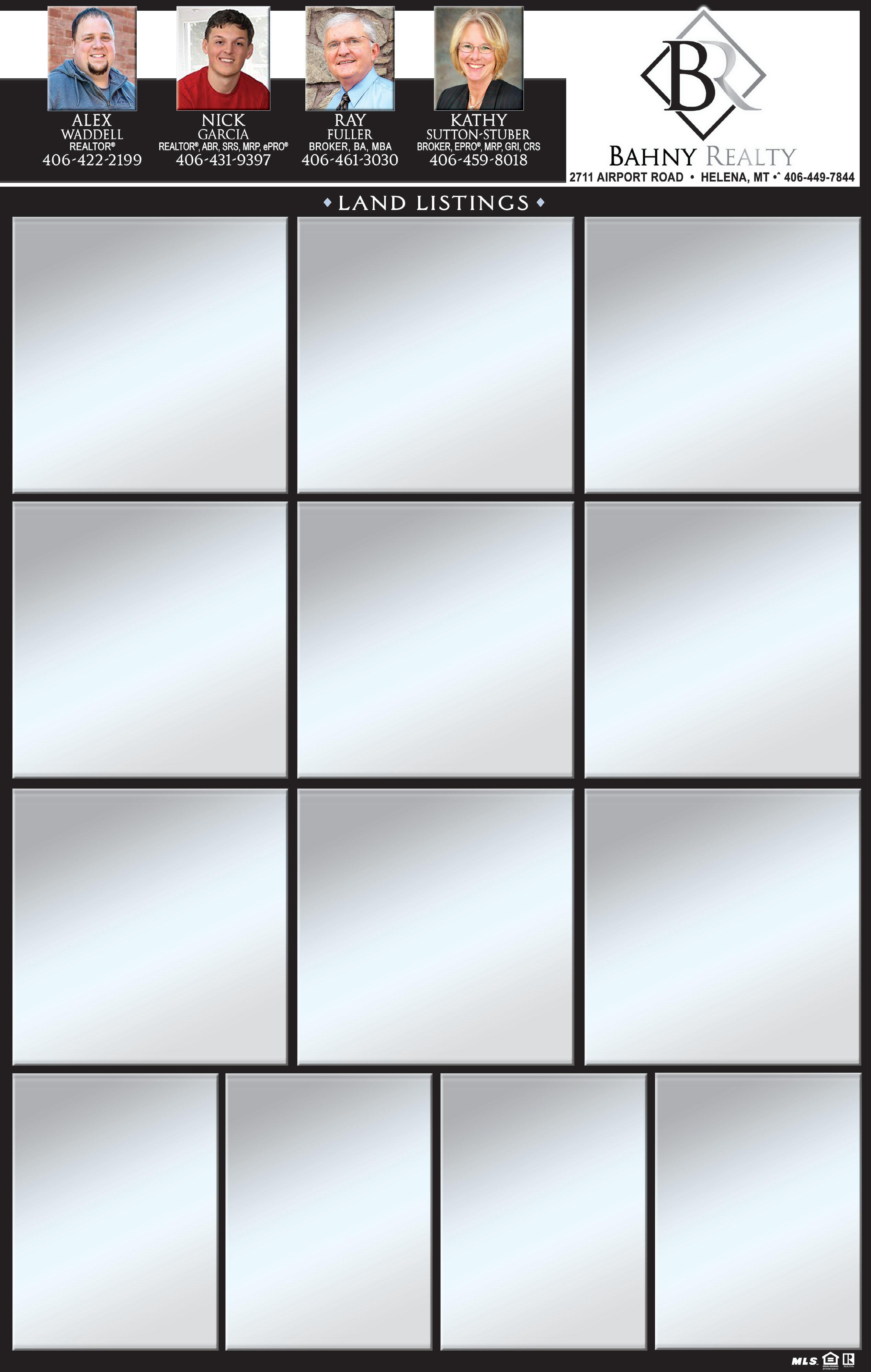 pg.13www.CapitalRealEstateConnection.com Nick@BahnyRealty.com Alex@BahnyRealty.comRay@BahnyRealty.comKathy@BahnyRealty.com ADDITIONAL LISTINGS: www.B ahny R ealty.com TBD THREE MILE ROAD ♦ HELENA, MT MLS#22205661 ♦ $1,100,000 ♦ Stunning 122 acre property with beautiful views. ♦ Build your dream home and enjoy all this property has to offer. ♦ This land has great tree coverage and vantage points. ♦ Numerous building sites, power is to the property. ♦ Access off of Three Mile Road. Recreation in all directions CALL ALEX WADDELL 406-422-2199 8895 APPLEGATE DRIVE ♦ HELENA, MT 4350 SAPPHIRE DRIVE ♦ HELENA, MT MLS# 22206246 • $375,000 ♦ Chance to own your Montana Ranchette just outside of Helena. ♦ Property just under 25 acres & 15 mins to town. ♦ Build your dream home & enjoy the peace of living in Montana. ♦ State land to the west bordering this property allows another 444 acres to hike or ride horses on. CALL CODY BAHNY 406-461-2824 MLS# 22206246 • $375,000 ♦ 12.62 acres with NO COVENANTS ♦ Potential to add additional acreage ♦ Potential to irrigate 12 acres from HVID ♦ Breathtaking panoramic views ♦ Minutes from town or the lake ♦ End of the road privacy CALL CODY BAHNY 406-461-2824 NEW LISTING! MLS#22213198 ♦ 20 ACRES - $275,000 MLS#22213198 ♦ 40 ACRES - $350,000 ♦ Top of the world views with privacy. ♦ Tons of local wildlife ♦ Only a half hour to Helena CALL CODY AT 406-461-2824 OR GREG AT 406-439-6325 TBD QUARTZ CREEK RD ♦ CLANCY, MT SALE PENDING! TBD HAUSER DAM ROAD ♦ HELENA, MT MLS#22211505 ♦ $285,000 ♦ Views! Views! Views! ♦ Almost 17 acre lot with Phenomenal views of the Helena Valley ♦ Several building locations with plenty of trees for privacy. ♦ Borders BLM (Public Land) w/ trails for horses, bikes, four wheelers, etc. CALL CODY BAHNY 406-461-2824 3984 OSPREY RIDGE DR ♦ HELENA, MT MLS#22204850 ♦ $275,000 ♦ 10 Acres with Top of the World views. ♦ Lot has leveled building site, existing septic, power across road & 2 low producing wells. ♦ 5 Minutes to the lake with recreation in every direction. ♦ Build your dream home and enjoy sunsets for a lifetime. CALL ALEX WADDELL 406-422-2199 MLS#22212894 ♦ $225,000 ♦ 20 acres in Eldorado Heights ♦ Great building sites with tons of wildlife ♦ Access to private boat launch and dock CALL ALEX AT 406-422-2199 OR CODY AT 406-461-2824 TBD EMMETT ROAD ♦ HELENA, MT CONFEDERATE GULCH RD ♦ TOWNSEND, MT MLS# 22202237 ♦ $210,000 ♦ 77 Acres located behind a locked USFS gate, it is steeped in Montana history ♦ Confederate Gulch was known for its rich gold mining (mineral rights included) ♦ One-of-a-kind property, remote but still close to Townsend, Helena, & Canyon Ferry Lake. ♦ Cabin sites up on top w/breathtaking views ♦ Unique property bordering BLM property w/opportunities for adventure, hunting, treasure seekers, nearby fishing, & other activities. CALL CODY BAHNY 406-461-2824 OR GREG BAHNY AT 406-439-6325 MLS# 22211374 ♦ $145,000 ♦ Very nice 9,278 SF lot ♦ new neighborhood on a cul-de-sac CALL GREG BAHNY 406-439-6325 MLS#22208391 ♦ $105,000 ♦ Nice level lot end of the road ♦ Views of Canyon Ferry, The Elkhorn & Little Belt Mountains ♦ Great access off of Mt Hwy 12. CALL GREG BAHNY AT 406-439-6325 TBD TARA ♦ TOWNSEND, MT MLS#22214931 ♦ $115,000 ♦ Almost a quarter acre lot with well and sewer ♦ Two car garage with Several attached bonus storage/hobby rooms ♦ Additional storage buildings ♦ Ready for a modular or manufactured home CALL CODY BAHNY 406-461-2824 4433 RED FOX DR • HELENA, MT MLS#22210355 ♦ $60,000 ♦ Welcome to your new home site just minutes from Boulder ♦ NO COVENANTS! mountain views and wildlife in every direction. ♦ Fishing, Hunting, & about any other kind of Montana Recreation within mins ♦ Four miles from Boulder or about a half-hour to Butte or Helena. CALL CODY BAHNY 406-461-2824 436 BOULDER FRONTAGE RD BOULDER, MT TBD WICKES NW ROAD ♦ JEFFERSON CITY, MT MLS#22206743 ♦ $200,000 ♦ Fantastic Mining claim on 12.2 acres. ♦ 2 great building sites w/ 360-degree phenomenal views. ♦ Backed by BLM and US Forest Service land. ♦ Accessible year-round. Fenced on all sides. CALL NICK GARCIA 406-431-9397 315 TAM O’SHANTER CT EAST HELENA, MT NEW LISTING!