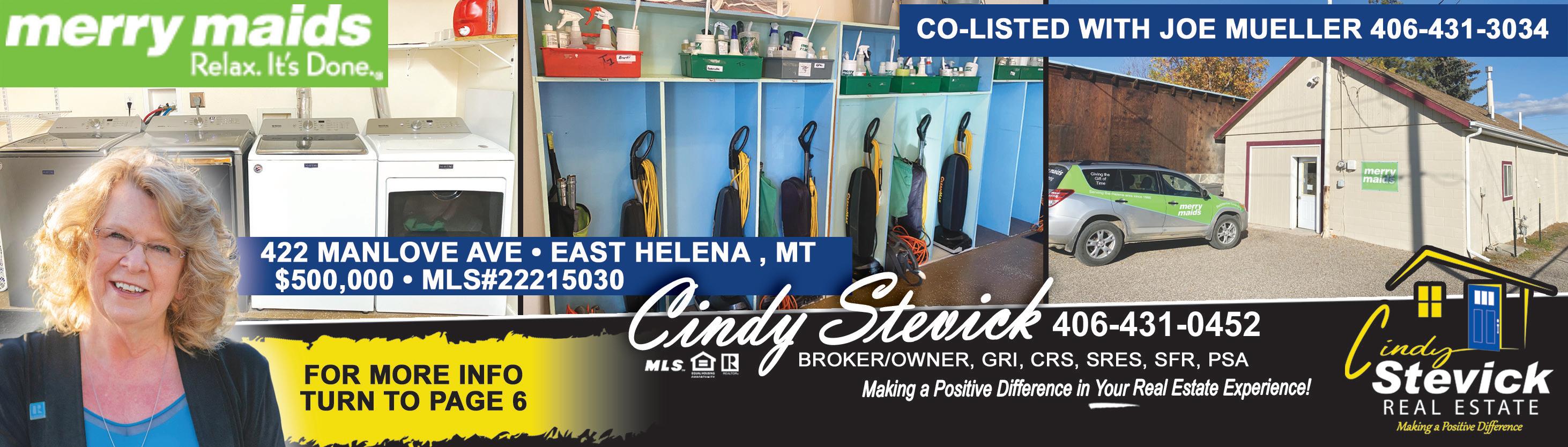 pg.6 www.CapitalRealEstateConnection.com Cindy@CindyStevickRealEstate.com WWW.FACEBOOK.COM/CINDYSTEVICKBROKER www.CindyStevickRealEstate.com • 2 adjoining lots just SW of Whitehall. • Lot 3 & 4, sold together, make up a total of 3.87 Ac. • Power is to the property (each lot). • Nestled in the Jefferson Valley, Deerlodge National Forest. • The area is surrounded by the Tobacco Root & Highland Mountain ranges. • Location on MT Cadastral plat, which show approximate layout of the two lots. www.lot55eldoradoheightshelena.com • 20 Ac prime piece of land. • Easy access to hunting, fishing, hiking & trail riding – plus the Helena National Forest. • Eldorado subdivision boat launch offers private lake access to Hauser Lake • Less than 20 miles from Helena. • Subdivision property owners have access to 200 ac of private mining area so you can dig for sapphires & more. The perfect lot that offers meadows, gentle slopes, hillsides, trees, views, & great building sites to choose from. • 2031 Sqft, 3 Bed, 1 ½ Bath. • Traditional archways, original entry light fixture. • Spacious closets & storage areas. • Lots of other updates including new electric panel. • Private patio features arbor & garden. • Main Bath remodeled & enlarged. • Kitchen remodeled with Custom Cabinets & Granite countertops. www.4207thAveHelena.com • Merry Maids has been operating successfully under the current owner for over 30 years. • Building & Business Opportunity are being sold together. • 1,600 Sqft Office/Warehouse on 8,600 Sqft Lot • Single Garage • Equipment list & Franchise information are available to review Call Cindy or Joe for your personal tour of the property. The current real estate market has seen interest rates climbing and as your realtor, I want to make sure you understand how your buying power has changed. Are you still qualified to purchase your dream home? I asked some mortgage lenders for their input. “Rates have climbed over 2.50% in the past 5 months. Because of the rate increases, the buying power for potential buyers has decreased. For example, in May 2022, the interest rate for a 30-year mortgage was 5.00%. If a buyer was pre-qualified with a lender to borrow $300,000 at 5%, the principal and interest payment would be roughly $1,610 per month. Now interest rates are about 7.25%. That same loan amount at 7.25% is now a payment of $2,047. That’s a $437 per month increase in payment. If a potential buyer was pre-qualified for only a payment of $1,610 per month at 5%, now that potential buyer is only qualified for a loan amount of $235,000.” Please talk with your current lender and verify your level of comfort with your mortgage payment. Talk to them about the current interest rate environment. Then call me!