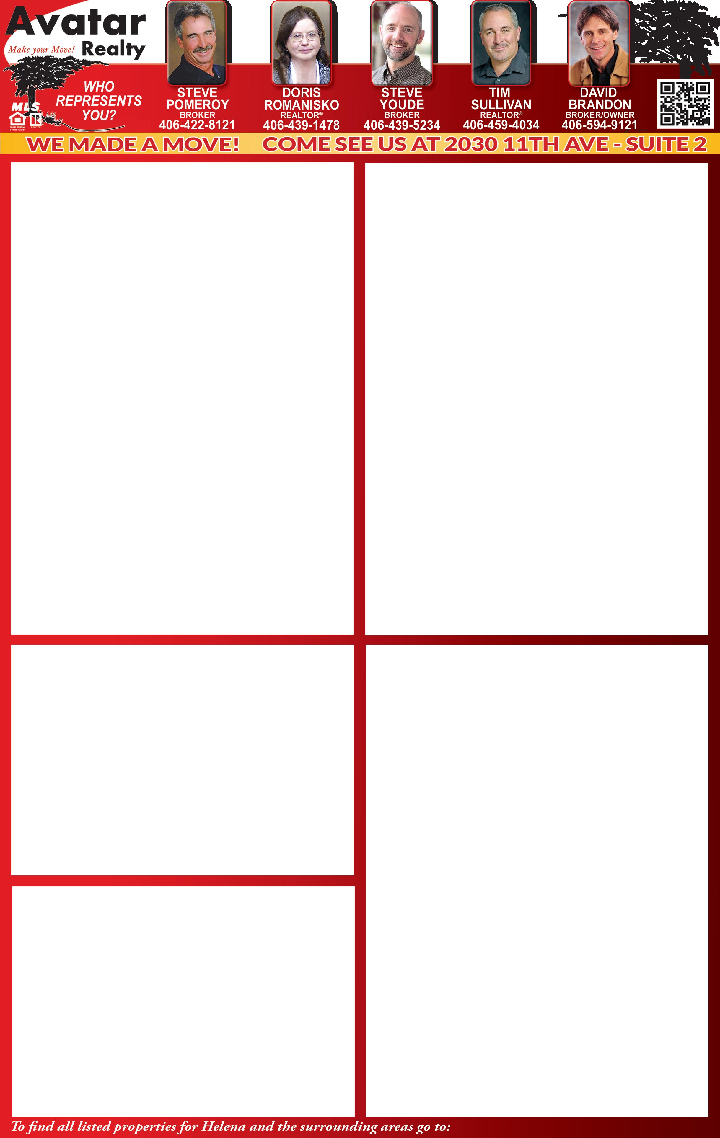 pg.17www.CapitalRealEstateConnection.com WWW. A VATAR R EALTY MT .COM COPPERLINE PASTY COMPANY • HELENA, MT Profitable business w/name recognition & an established clientele. Established in 2013. Business for sale, no real estate. MLS#222214379 │ $59,000 CALL STEVE YOUDE 406-439-5234 311 SUTHERLAND COURT • EAST HELENA High-quality new construction in East Helena set to be complete in May/June. This beautiful, spacious, 4-bed, 2-bath, 2-car home is situated between Prickly Pear Elementary & East Helena High Schools off Valley Drive next to East Valley Fire Department. Located on a cul-de-sac, this home has granite countertops w/undermount sinks, soft-close, full-depth drawers, vaulted great room w/a gas f/p, s.s. appliances, gas air fryer oven, TRANE furnace & AC, tiled baths, tiled master shower, dual sinks, free-standing soaker tub, mudroom/ laundry room w/cabinet & sink. MLS#22203065 │ $489,900 CALL STEVE YOUDE 406-439-5234 8380 ORDWAY DRIVE HELENA Great view lot, water access, gentle slope for walk out basement design. Very close to Holter Lake on the Missouri just south of Gates of the Mountains. Community and private docks available. Endless recreational opportunity! MLS#22214663 $200,000 CALL DAVID BRANDON 406-594-9121 1414 EUCLID AVENUE • HELENA Great Retail/Professional location on Helena’s busy west side. Approximately 1200 sf, $1500/mo plus CAMs. MLS#22213107 │ $1,500 FOR LEASE CALL DAVID BRANDON 406-594-9121 1530 PROSPECT AVENUE #2 • HELENA Great Location on Prospect Avenue across from the Old Mall and the NEW developments going in. 1900+ sf retail space. MLS#22214666 │ $2,400 FOR LEASE CALL DAVID BRANDON 406-594-9121 SUPER PRICE REDUCTION! FOR LEASE! FOR LEASE!