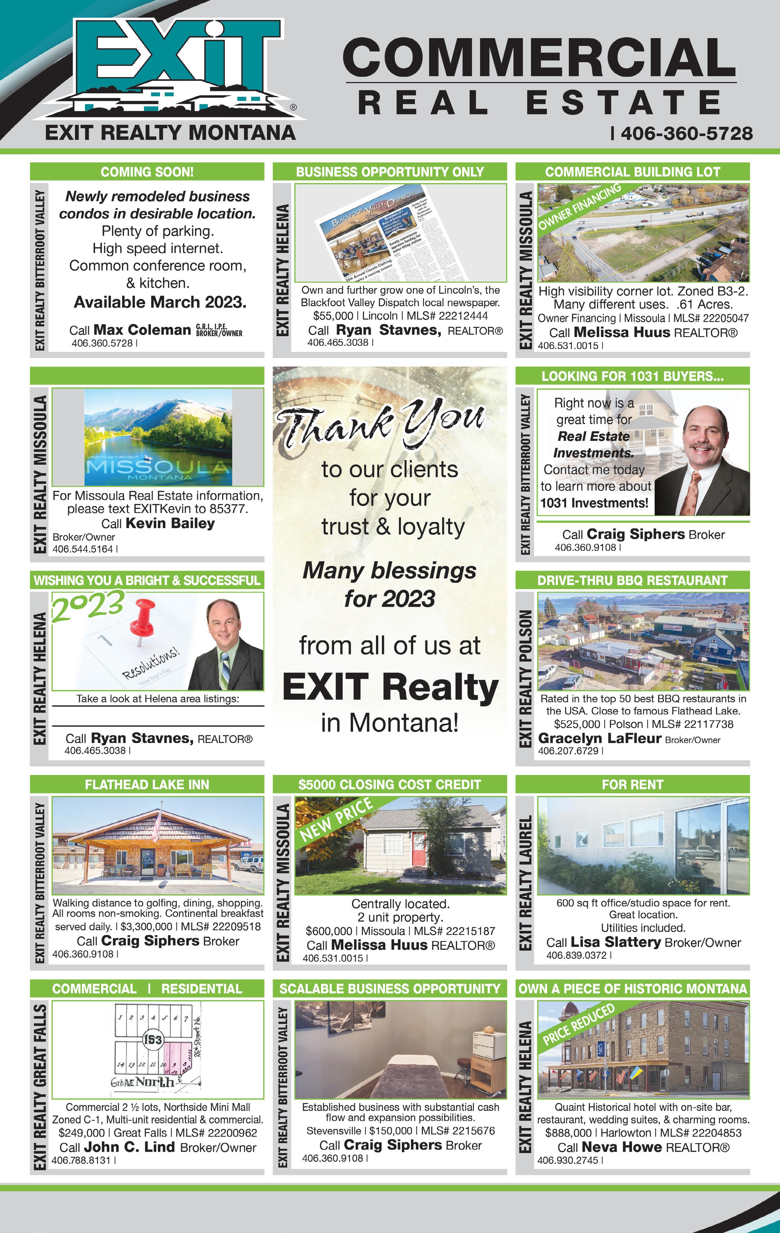 pg.19 www.CapitalRealEstateConnection.com www.EXITrealtymontana.com Max@EXITrealtybv.com Craig@EXITrealtybv.com WWW.MISSOULAREALTY.COM Melissa@EXITrealtymsla.com RYAN.EXITREALTYHELENA.COM Ryan.EXITrealtyhelena.com Gracelyn@EXITrealtypolson.com Kevin@EXITrealtymsla.com Ryan.EXITrealtyhelena.com Craig@EXITrealtybv.com Melissa@EXITrealtymsla.com John@EXITRealtyGreatFalls.com Craig@EXITrealtybv.com Neva@EXITrealtyhelena.com www.EXITRealtyLaurel.com