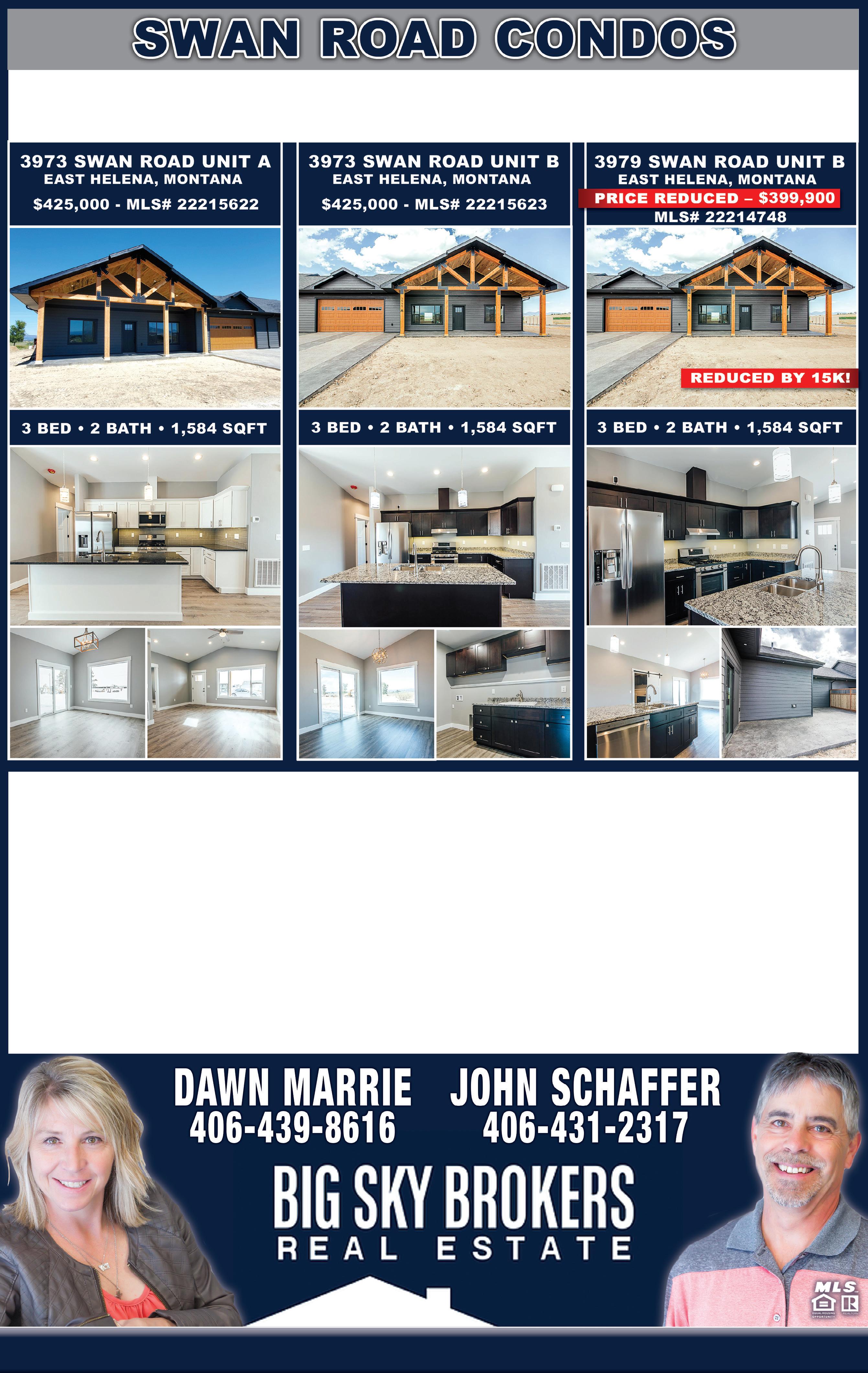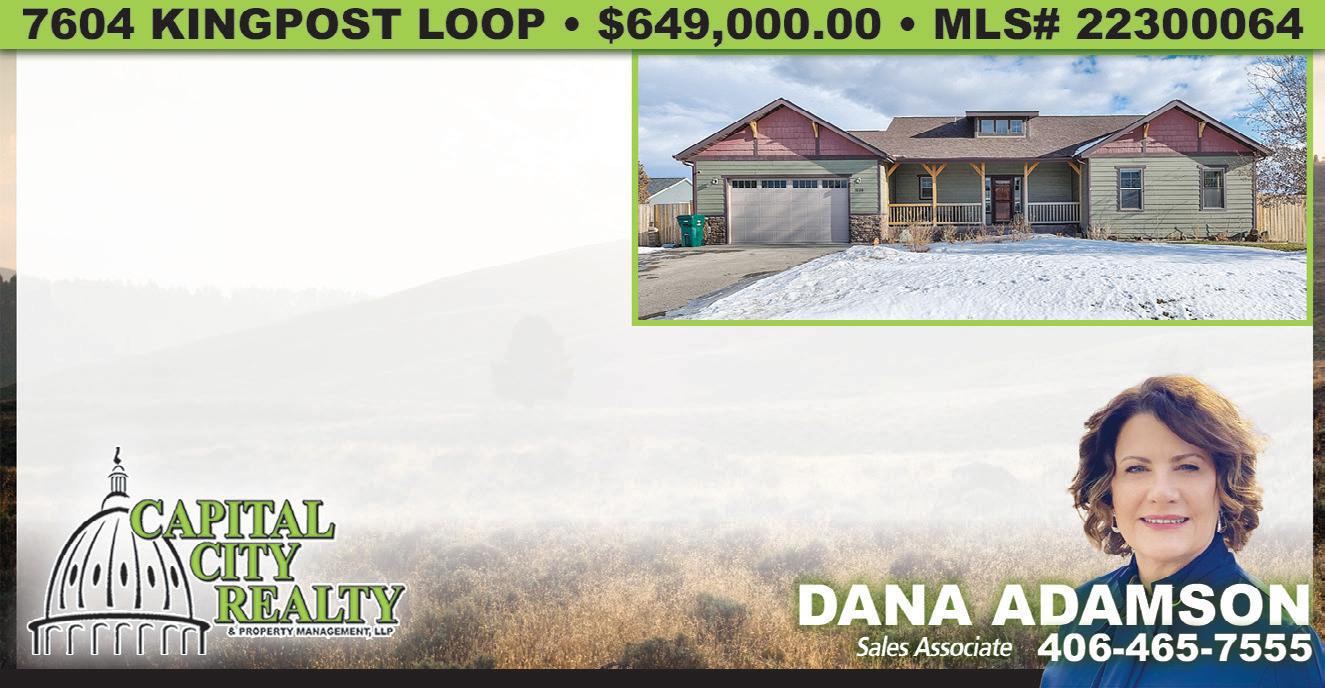 pg.3 www.CapitalRealEstateConnection.com Dawn@dawnandjohn.com John@dawnandjohn.com WWW. B IG S KY B ROKERS .COM 9 SACAJAWEA LOOP • TOWNSEND, MT The lush landscaped yard is well maintained w/mature trees and is fully irrigated. The views of Canyon Ferry Lake & the Big Belt mountain range greet you from the quiet covered deck. The main floor boasts a lg private master ste that includes a soaking tub, lg double shower, & walk-in closet. Main level guest bed & bath, add’l 3 bsmt beds for lg gatherings on the lake. Large kitchen that includes a gas cooktop, dual wall ovens, new refrigerator & adjacent lg pantry. The well-equipped laundry room is a one stop shop w/ample cabinets & a spacious counter w/bonus sink. The walk-out bsmt includes 3 nice sized beds, a full bath, lg family room w/cozy gas stove & storage. Don’t forget the 3-car garage to store your toys w/depth for your boat. MLS#22213650 • $779,900 Don’t miss out on these fantastic condos. Timber framing outside beckons you into these beautiful homes that are ready for you to make them your own. Large 2 car garage leads you into the laundry room. As soon as you walk into the home you can feel the quality throughout. 3 full bedrooms, 2 bathrooms, and an open concept living area make for easy living. Call today to come out and see these spectacular places. REDUCED BY 20K!