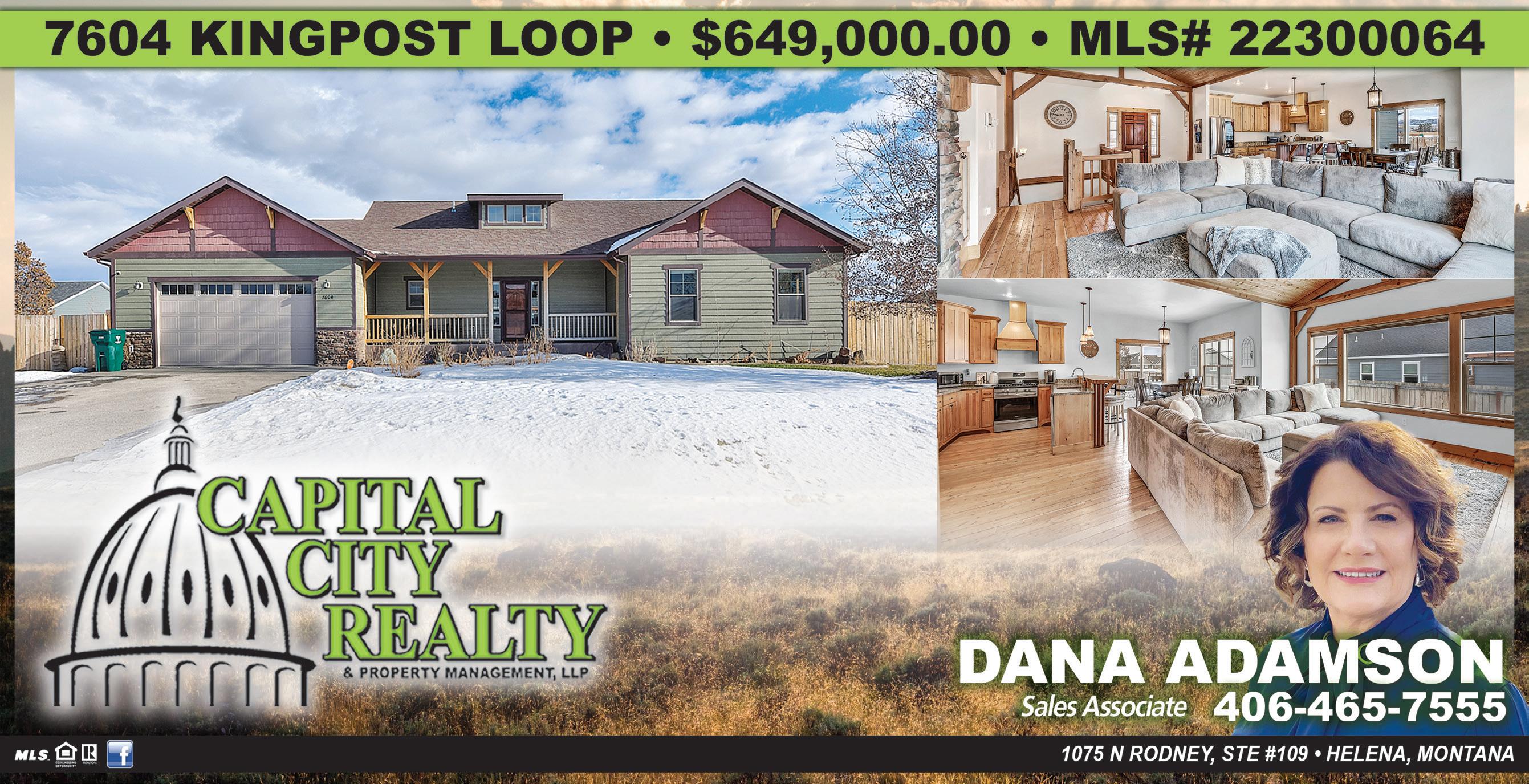 Sitting on a landscaped, fenced, 1/2 ac lt w/ stamped concrete patio, children’s playset & mountain views..this Montana-style gem won’t last long! Call Dana Adamson at 406-465-7555 or your real estate professional 7604 KINGPOST LP - HELENA, MT $649,000.00 | MLS#22300064 NEW LISTING!