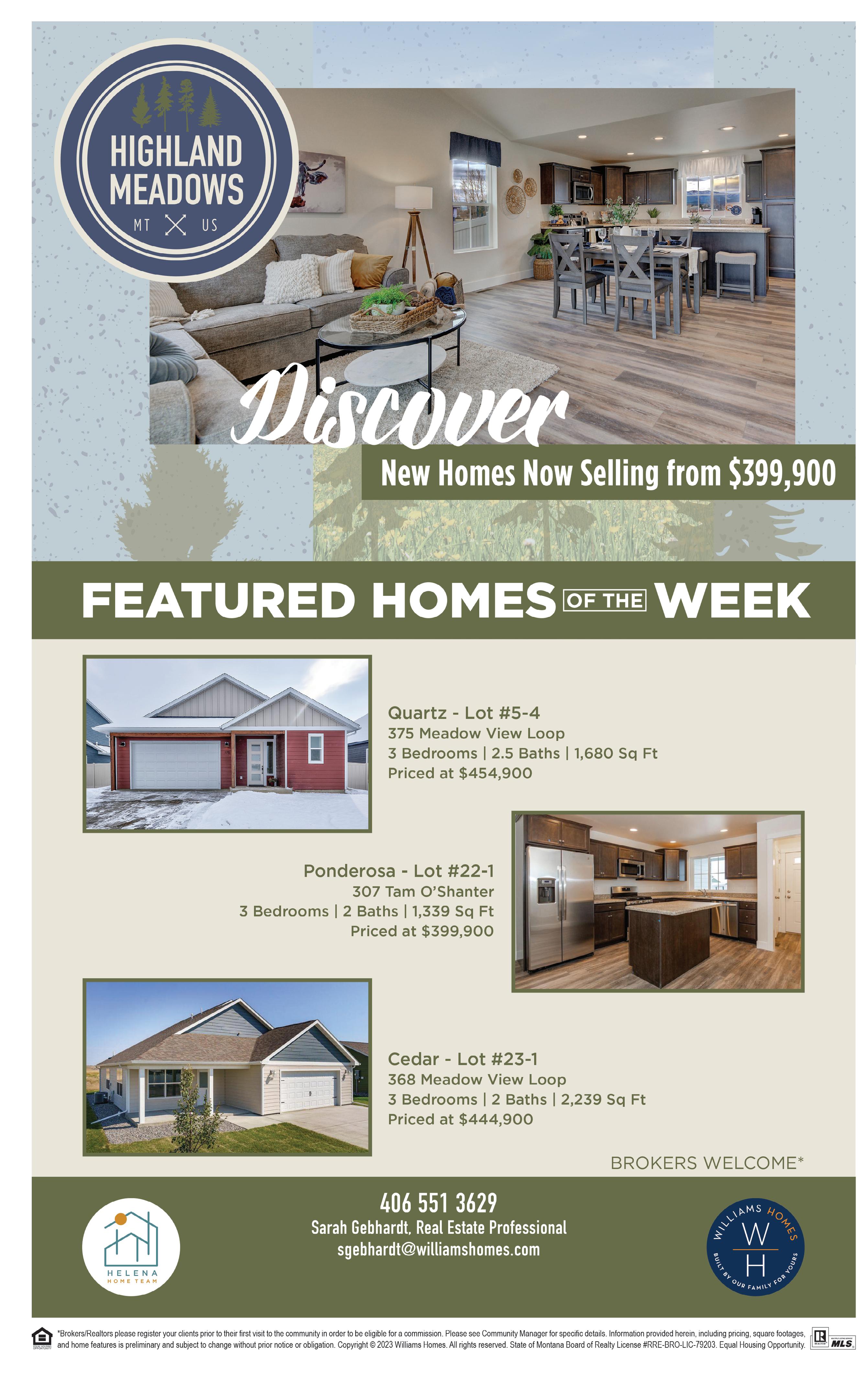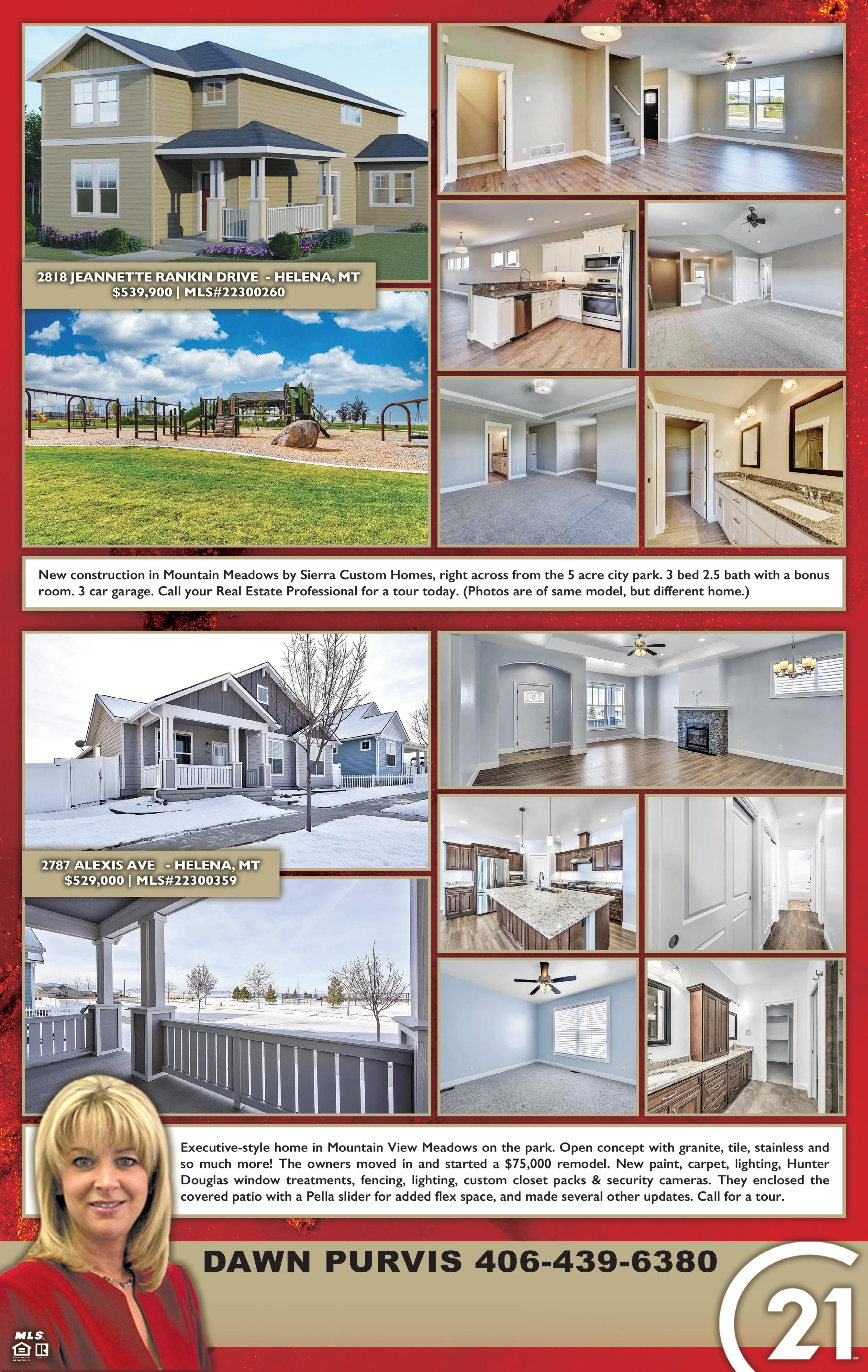 Currently off street parking. Centrally located near shopping, schools & courthouse. • Natural gas & electricity are hooked up. • Insulation installed under mobile De-titled for taxes & lending purposes. • Move in ready! Contact Laurie Koutnik 406-439-9184 or your real estate professional. 117 S ADAMS ST - HELENA, MT $269,000.00 | MLS#22212856 NEW LISTING! • One level 2,264 sqft home. • High-end finishes throughout this 3 bds, 2.5 bths home + dedicated office, w/granite, new hardware & fixtures, vaulted ceilings & 2 gas f/p, hickory hardwood & tile floors. Covered redwood deck, beautifully landscaped yd w/UGSP, a pergola, a potting station & raised garden beds & a privacy fence. • Att oversized heated dbl car gar w/multiple perks to include work bench w/LED lighting, shelving galore, 220 wiring. Plenty of storage in the 10x14 shed & parking pad for your boat & RV w/hookups. Call Laurie Koutnik at 406-439-9184 & Jadean O’Neil at 406-438-7446 or your real estate professional. 3851 FOXTAIL LN - HELENA, MT $614,900.00 | MLS#22215846 BEAUTIFUL HOME NEW PRICE!