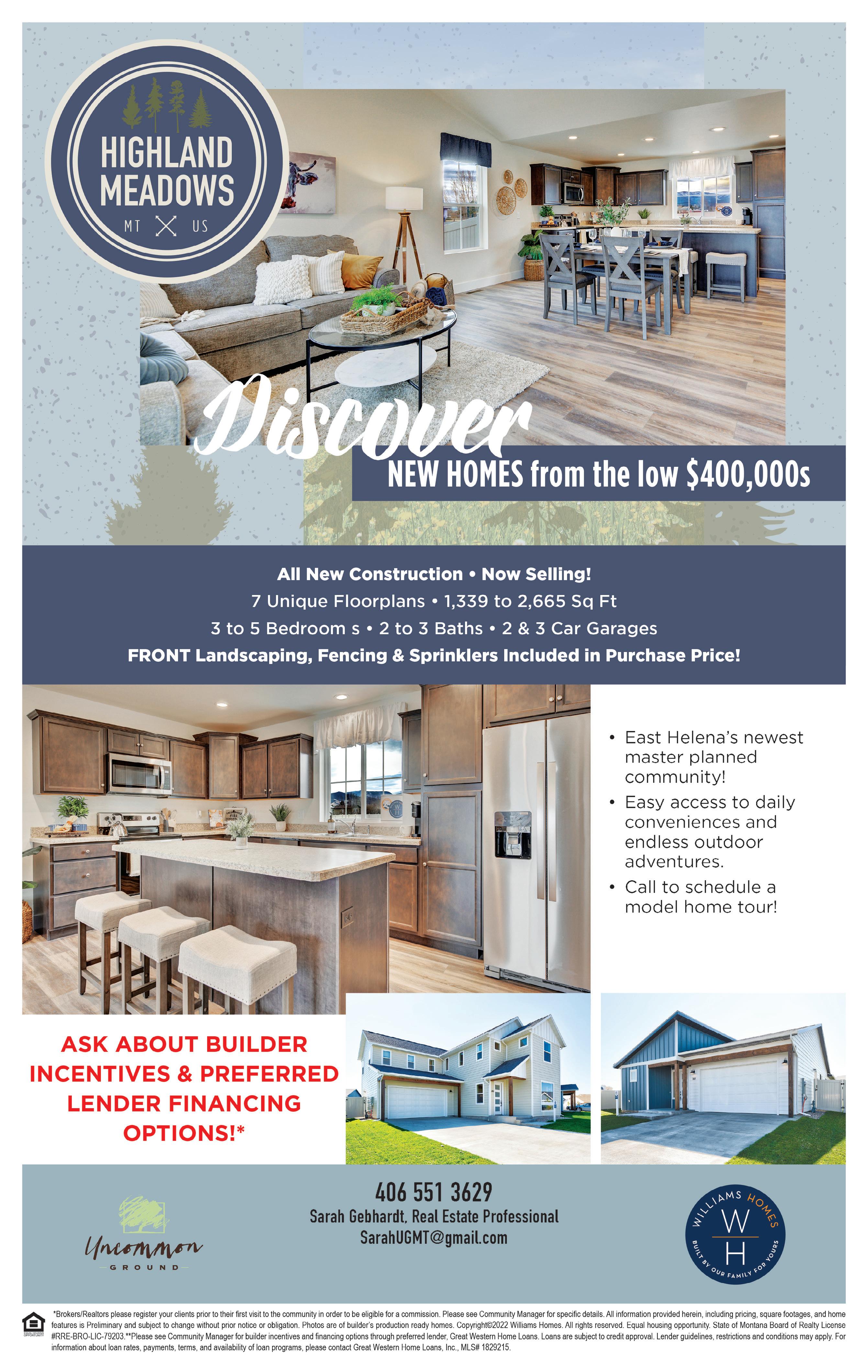 pg.3 www.CapitalRealEstateConnection.com Dawn@dawnandjohn.com John@dawnandjohn.com WWW. B IG S KY B ROKERS .COM 9 SACAJAWEA LOOP • TOWNSEND, MT The lush landscaped yard is well maintained w/mature trees and is fully irrigated. The views of Canyon Ferry Lake & the Big Belt mountain range greet you from the quiet covered deck. The main floor boasts a lg private master ste that includes a soaking tub, lg double shower, & walk-in closet. Main level guest bed & bath, add’l 3 bsmt beds for lg gatherings on the lake. Large kitchen that includes a gas cooktop, dual wall ovens, new refrigerator & adjacent lg pantry. The well-equipped laundry room is a one stop shop w/ample cabinets & a spacious counter w/bonus sink. The walk-out bsmt includes 3 nice sized beds, a full bath, lg family room w/cozy gas stove & storage. Don’t forget the 3-car garage to store your toys w/depth for your boat. MLS#22213650 • $779,000 Don’t miss out on these fantastic condos. Timber framing outside beckons you into these beautiful homes that are ready for you to make them your own. Large 2 car garage leads you into the laundry room. As soon as you walk into the home you can feel the quality throughout. 3 full bedrooms, 2 bathrooms, and an open concept living area make for easy living. Call today to come out and see these spectacular places.