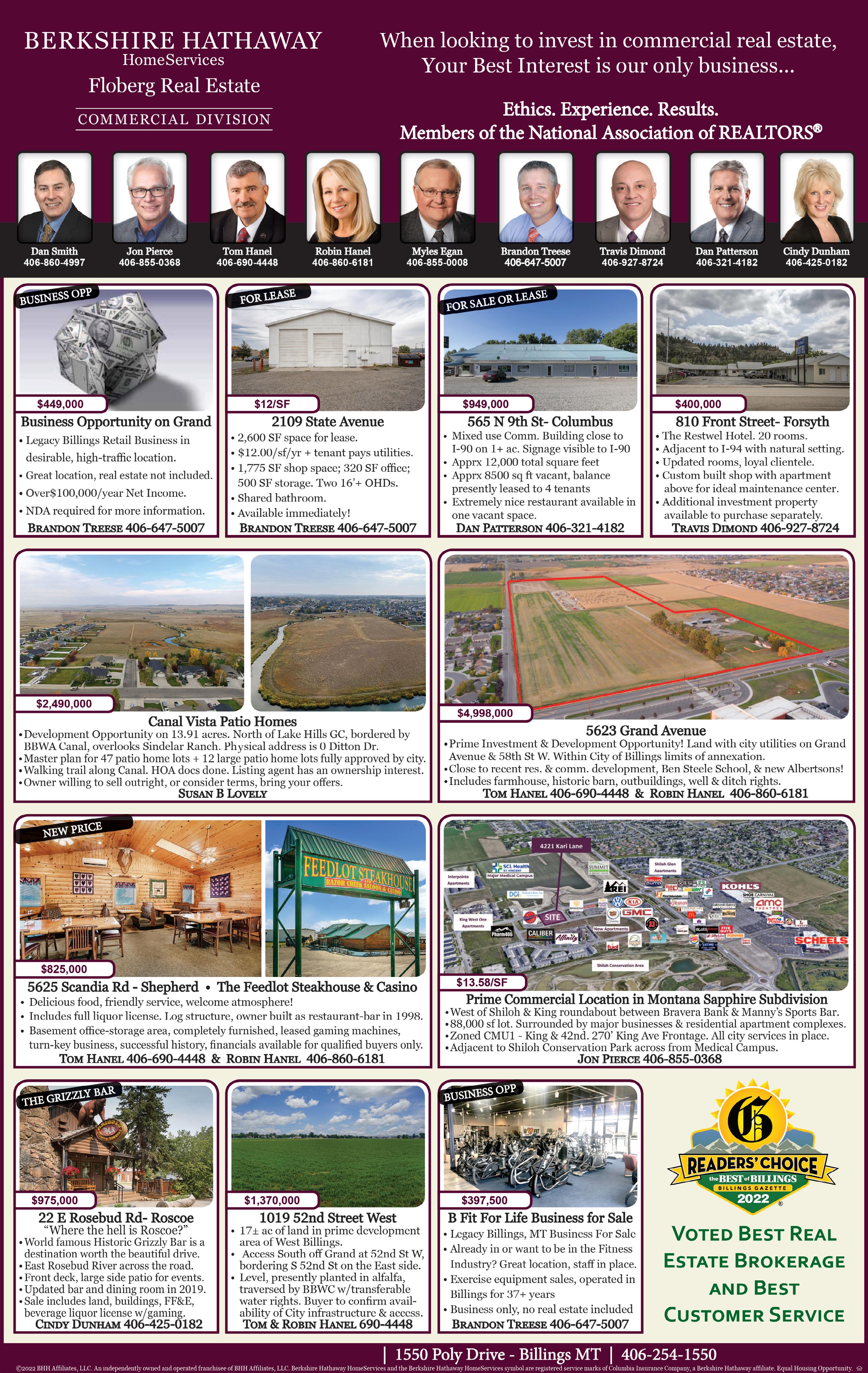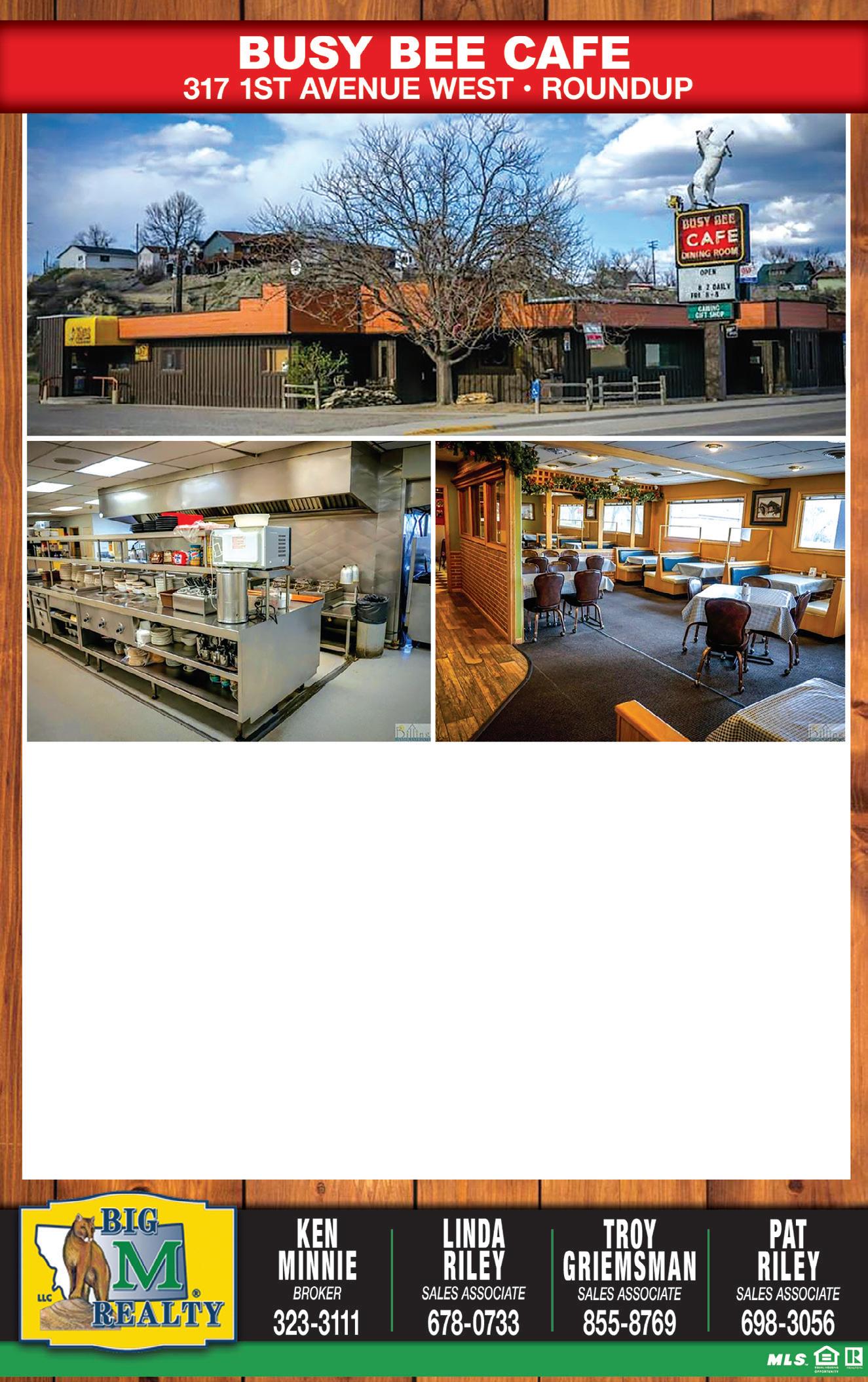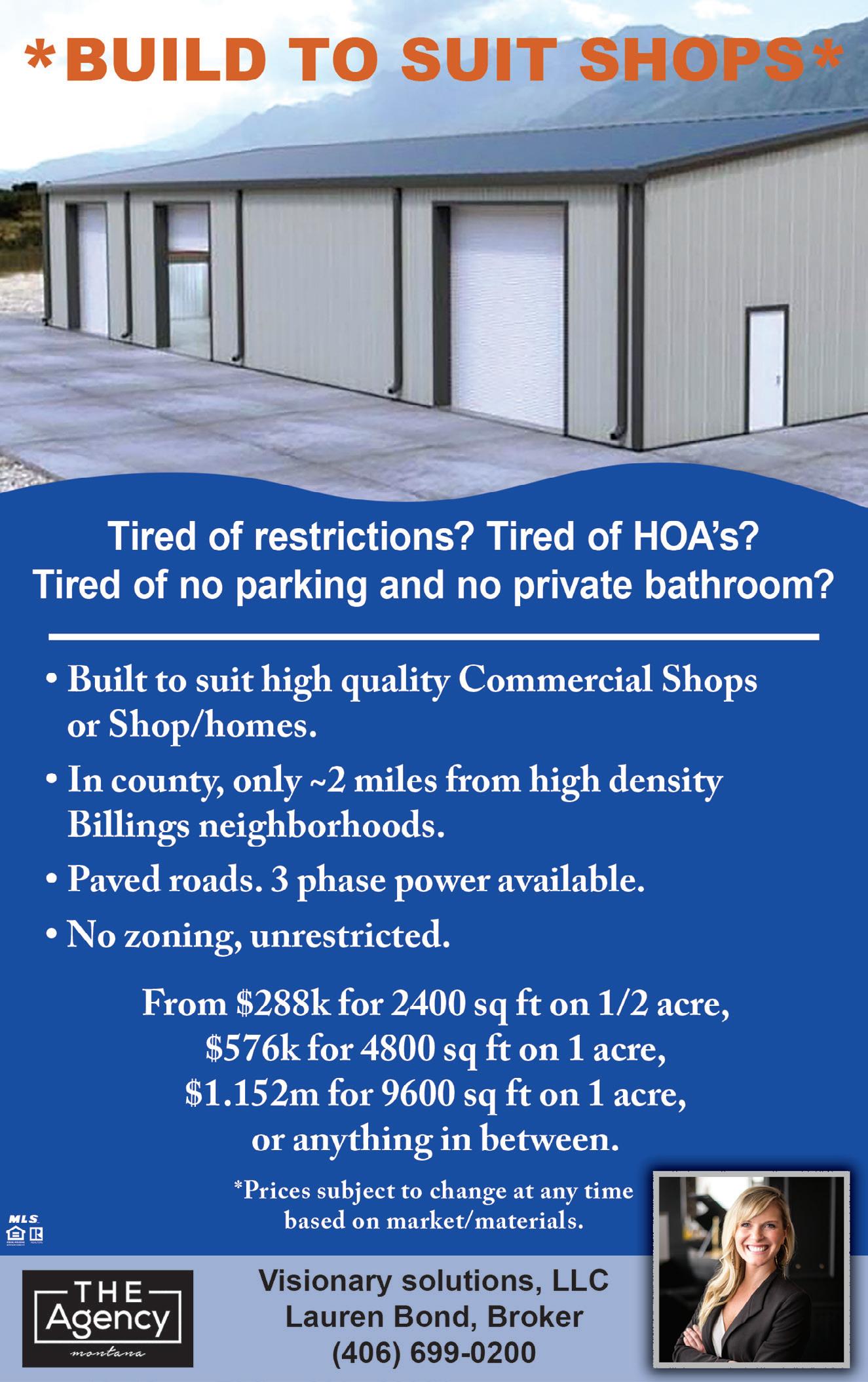 p 11 kelly@eecmt.com www.platinumpropertybrokers.com $694,900 • MLS#329693 NEW LOWER PRICE - PRICED TO SELL - A Montana Landmark, the Busy Bee Cafe established in 1945, located in Roundup, Mt. The Busy Bee Cafe has been in operation by the same family for over 50 years, MUST SELL FOR HEALTH REASONS. The Busy Bee Cafe has an outstanding reputation as the one place to stop and eat, The Busy Bee Cafe has a high traffic count located on HWY 87N, HWY 12E. Extra Large parking spaces including 10 full lots to accommodate even large trucks. Comes complete with older gambling, beer & wine license. all fixtures including walk in cooler, cold storage, Full Kitchen. The business is ready to go, just order your inventory and open up for business. Call for an appointment for a showing. WE WILL CONSIDER ALL OFFERS - WILL CONSIDER CONTRACT FOR DEED. CONSIDERING ALL THE OPTIONS AND AMENITIES, THE BUSY BEE CAFE IS AN OUTSTANDING VALUE AND OPPERTUNITY FOR A NEW AMBIOUSE BUYER. www.BigMRealty.com Great things can happen when you make space for them! 50’ x 72’ 3 bay shop. 14’ doors, 90,000 BTU heater, LED lights, 50-watt amp, paved road, HOA includes snow & road maintenance, 2 public bathrooms, Security cameras to the exterior, currently leased for up to 1 year lease, high speed internet for as low as $35 a month. Bay A & B are prewired for a split a/c unit, building is ready to be condo’d. Similar properties also available. $475,000 | MLS#335707 8050 Workshop Ave | Billings MT Great things can happen when you make space for them! 50’ x 72’ 3 bay shop. 14’ doors, 90,000 BTU heater, LED lights, 50-watt amp, paved road, HOA includes snow & road maintenance, 2 public bathrooms, Security cameras to the exterior, currently leased for up to 1 year lease, high speed internet for as low as $35 a month. Similar properties also available. $475,000 | MLS#335708 8142 Workshop Ave | Billings MT Great things can happen when you make space for them! Build your own 50’ x 72’ 3 bay shop. 14’ doors, 90,000 BTU heater, LED lights, 50-watt amp, paved road, HOA includes snow & road maintenance, 2 public bathrooms, Security cameras to the exterior, currently leased for up to 1 year lease, high speed internet for as low as $35 a month. Similar properties also available. ***Price is subject to building specifications. $475,000 | MLS#335712 8134 Workshop Ave | Billings MT Great things can happen when you make space for them! 50’ x 72’ 3 bay shop. 14’ doors, 90,000 BTU heater, LED lights, 50-watt amp, paved road, HOA includes snow & road maintenance, 2 public bathrooms, Security cameras to the exterior, currently leased for up to 1 year lease, high speed internet for as low as $35 a month. Similar properties also available. $475,000 | MLS#335706 8040 Workshop Ave | Billings MT particularealestate@gmail.com hreno@kw.com