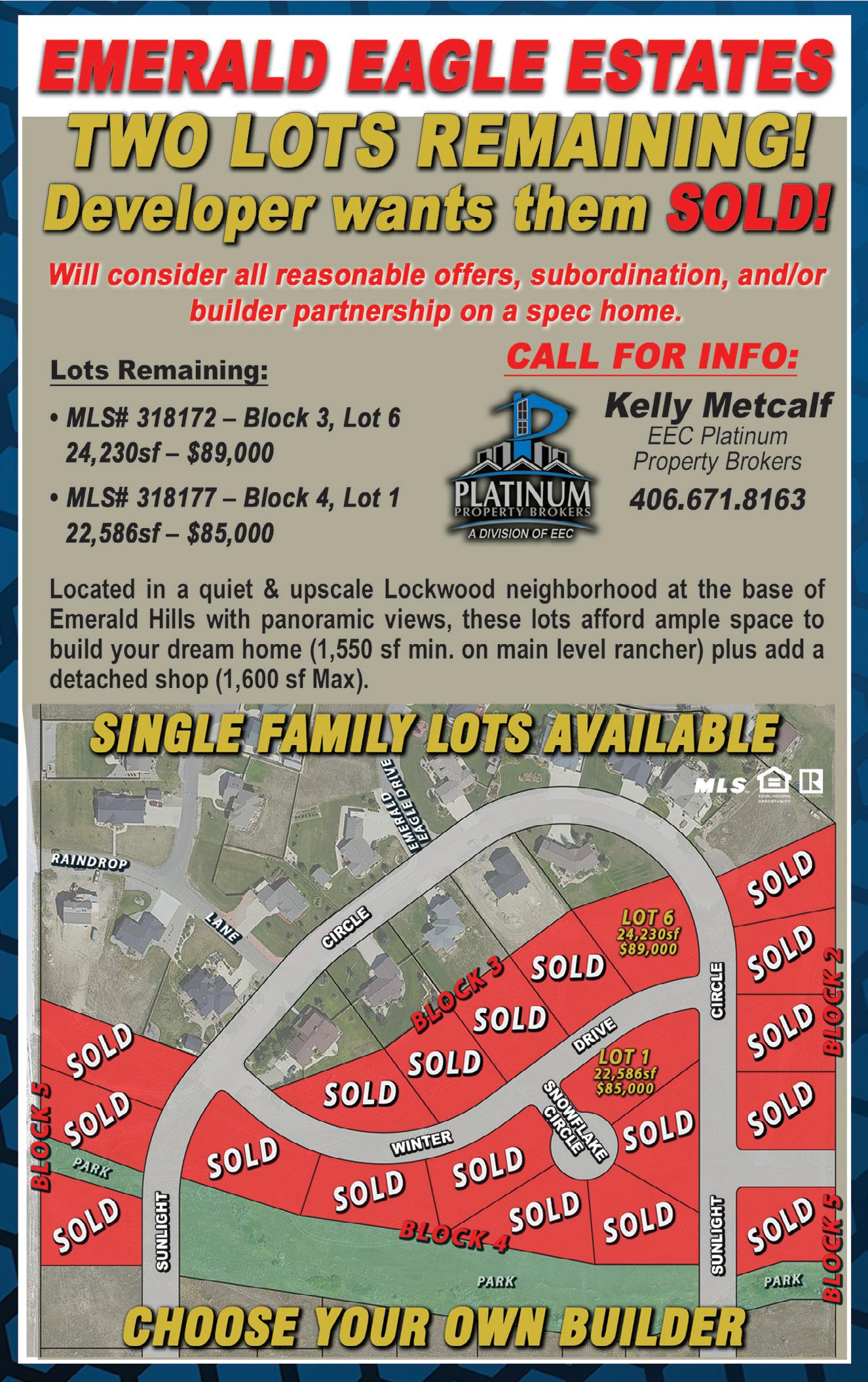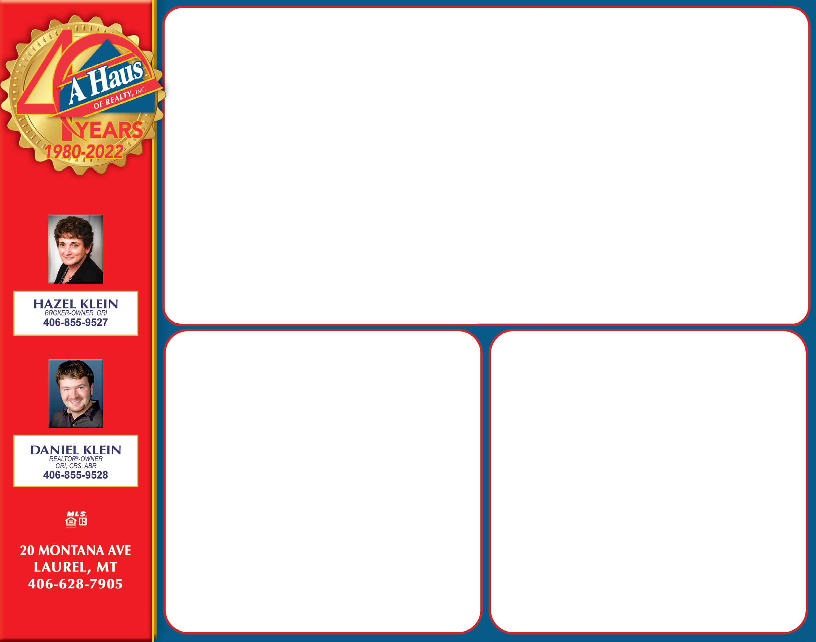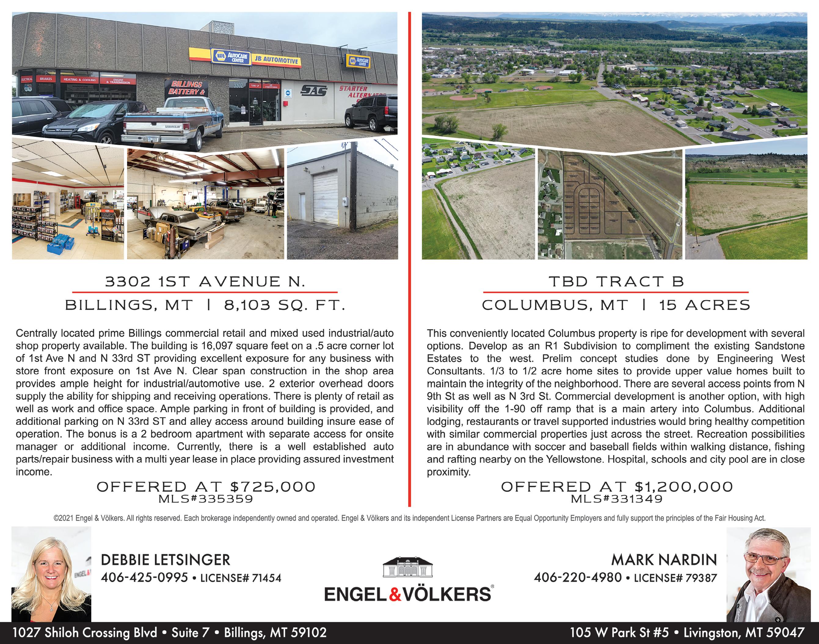 p 11 kelly@eecmt.com www.platinumpropertybrokers.com $694,900 • MLS#329693 NEW LOWER PRICE - PRICED TO SELL - A Montana Landmark, the Busy Bee Cafe established in 1945, located in Roundup, Mt. The Busy Bee Cafe has been in operation by the same family for over 50 years, MUST SELL FOR HEALTH REASONS. The Busy Bee Cafe has an outstanding reputation as the one place to stop and eat, The Busy Bee Cafe has a high traffic count located on HWY 87N, HWY 12E. Extra Large parking spaces including 10 full lots to accommodate even large trucks. Comes complete with older gambling, beer & wine license. all fixtures including walk in cooler, cold storage, Full Kitchen. The business is ready to go, just order your inventory and open up for business. Call for an appointment for a showing. WE WILL CONSIDER ALL OFFERS - WILL CONSIDER CONTRACT FOR DEED. CONSIDERING ALL THE OPTIONS AND AMENITIES, THE BUSY BEE CAFE IS AN OUTSTANDING VALUE AND OPPERTUNITY FOR A NEW AMBIOUSE BUYER. www.BigMRealty.com Great things can happen when you make space for them! 50’ x 72’ 3 bay shop. 14’ doors, 90,000 BTU heater, LED lights, 50-watt amp, paved road, HOA includes snow & road maintenance, 2 public bathrooms, Security cameras to the exterior, currently leased for up to 1 year lease, high speed internet for as low as $35 a month. Bay A & B are prewired for a split a/c unit, building is ready to be condo’d. Similar properties also available. $475,000 | MLS#335707 8050 Workshop Ave | Billings MT Great things can happen when you make space for them! 50’ x 72’ 3 bay shop. 14’ doors, 90,000 BTU heater, LED lights, 50-watt amp, paved road, HOA includes snow & road maintenance, 2 public bathrooms, Security cameras to the exterior, currently leased for up to 1 year lease, high speed internet for as low as $35 a month. Similar properties also available. $475,000 | MLS#335708 8142 Workshop Ave | Billings MT Great things can happen when you make space for them! Build your own 50’ x 72’ 3 bay shop. 14’ doors, 90,000 BTU heater, LED lights, 50-watt amp, paved road, HOA includes snow & road maintenance, 2 public bathrooms, Security cameras to the exterior, currently leased for up to 1 year lease, high speed internet for as low as $35 a month. Similar properties also available. ***Price is subject to building specifications. $475,000 | MLS#335712 8134 Workshop Ave | Billings MT Great things can happen when you make space for them! 50’ x 72’ 3 bay shop. 14’ doors, 90,000 BTU heater, LED lights, 50-watt amp, paved road, HOA includes snow & road maintenance, 2 public bathrooms, Security cameras to the exterior, currently leased for up to 1 year lease, high speed internet for as low as $35 a month. Similar properties also available. $475,000 | MLS#335706 8040 Workshop Ave | Billings MT particularealestate@gmail.com hreno@kw.com