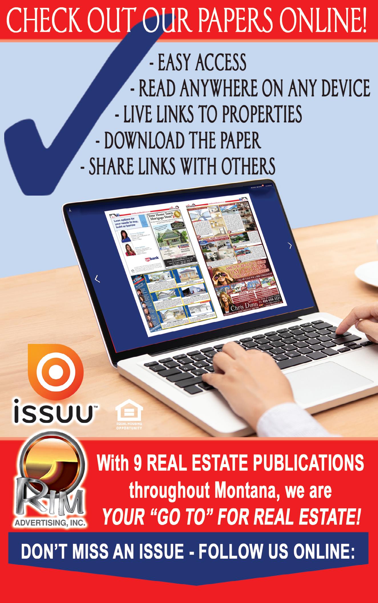 p 27 Flooring & Design Commercial Flooring Division • The Area’s Exclusive Carpet Recycling Program • Your local specialist for all commercial flooring projects large and small www.PierceFlooring.com 406 727 3832 Mike Chouinard Commercial Division Manager mchouinard@pierce.biz 2950 King Ave West • Billings 406 652 4666 Jeff Anderson janderson@pierce.biz To Advertise Your Listing Contact: Don Kuntz 406-656-0608 Rim@montana.net www.MontanaCommercialRealEstate.com www.montana-commercial.com Attention Farm & Ranch Licensed Real Estate Agents of Montana Check out our database of some of Montana’s Finest Farms, Ranches,& Recreational Land! u Search for Farms & Ranches throughout Montana, Wyoming, Idaho, North Dakota & South Dakota ! u 44,000 printed copies at over 2,200 locations! u WORLDWIDE EXPOSURE to prospective buyers! u Upload, update, & modify your listings. u Email other members! u Your ad linked to your homepage u Log on for more details. u View our selection of Ranches, Ranchettes, Farms & other beautiful properties! u Coverage, Convenience, Affordability, are smart reasons for you to choose this more effective alternative to advertising in the daily paper. For Sale Call or E-Mail: Don Kuntz at 406-656-0608 Rim@montana.net www.MontanaFarMsandranches.coM