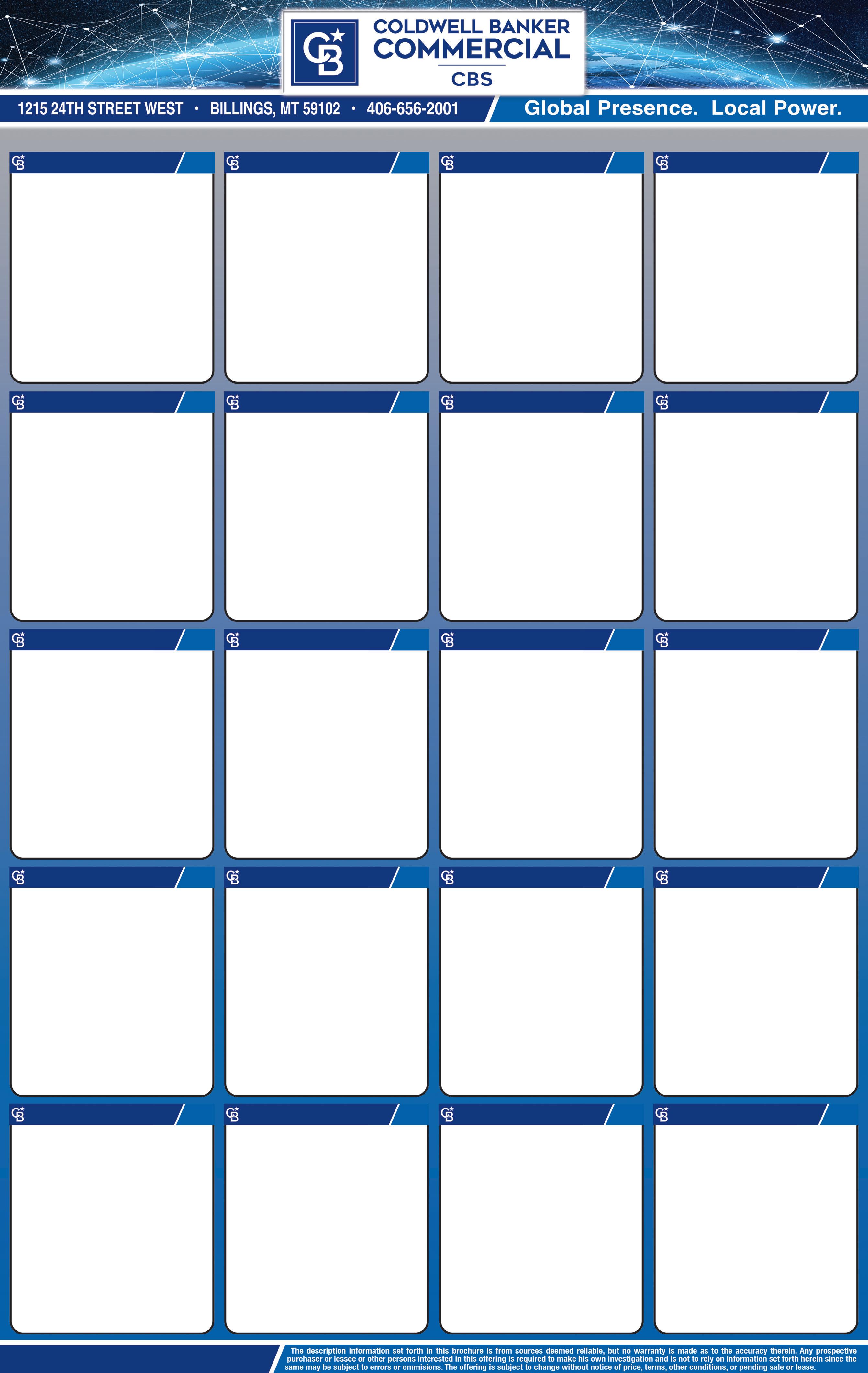 p 3 www.CBCMontana.com OFFICE SPACE & OFFICE BUILDINGS - FOR SALE OR FOR LEASE 45 BASIN CREEK ROAD BUTTE, MT FOR SALE $1,615,000 FOR LEASE $9 PSF NNN Almost 25,000 SF Office Building Nathan Matelich 406-781-6889 10 CENTRAL AVENUE W HARLEM, MT FOR SALE $100,000 Historic 15,930 SF brick hotel Todd Sherman 406-570-8961 209 1ST AVENUE • LAUREL, MT FOR SALE $882,000 FOR LEASE $9.50 SF NNN 8,400 SF retail shell in prime corridor with over 13,000 cars per day George Warmer 406-855-8946 Kyle Schlichenmayer 406-698-1899 NEW LISTING! 1215 24TH STREET • BILLINGS, MT FOR LEASE $11 SF NNN 3 High Visibility Office Spaces 400 SF, 809 SF, and 1,122 SF David Mitchell 406-794-3404 3225 1ST AVE N • BILLINGS, MT FOR SALE $450,000 FOR LEASE $12/SF NNN 2,546 SF Office building remodeled in 2016. George Warmer 406-855-8946 3DTOUR: https://tinyurl.com/yyaxzhxp 2950 KING AVENUE W • BILLINGS, MT FOR SALE $297,000-$799,000 FOR LEASE $14-$18 SF NNN 1,800-5,488 SF w/premium visibility George Warmer 406-855-8946 Todd Sherman 406-570-8961 2600 MONTANA AVE BILLINGS, MT FOR SALE $2,300,000 19 Units LEED Green Certified George Warmer 406-855-8946 1629 AVE D SUITE C1 • BILLINGS, MT FOR LEASE $675/MO 527 SF Midtown Office Space David Mitchell 406-794-3404 P R I C E D R O P Lorem ipsum 3013 MONTANA AVE • BILLINGS, MT FOR LEASE Tenant Build out or Build to Suit 2,500 to 16,000 SF retail or office Zoned CBD. Nathan Matelich 406-781-6889 3DTOUR: https://tinyurl.com/2p93vcmt 1202 & 1212 CENTRAL AVE • BILLINGS, MT FOR LEASE $11 PSF NNN 1,395 SF and 3,200 SF Office Spaces. Todd Sherman 406-570-8961 NEW LISTING! NEW LISTING! 413 SE 4TH ST • LAUREL, MT FOR LEASE $1,630/MO + UTIL. 1,000 SF Class A Retail Space on most desirable retail corridor in Laurel. Nathan Matelich 406-781-6889 206 NORTH 29TH • BILLINGS, MT FOR LEASE $200 /MO 120-130 SF Downtown Offices David Mitchell 406-794-3404 Kyle Schlichenmayer 406-698-1899 3D TOUR: https://tinyurl.com/y2dug6rz NEW LISTING! 2525 6TH AVENUE N • BILLINGS, MT FOR LEASE $450/MO UTIL. INCLUDED 2 shared conference rooms Nathan Matelich 406-781-6889 Mike Bruschwein 406-697-6176 2376 MAIN ST • BILLINGS, MT FOR LEASE $8.50-$9.50 SF NNN 1,820 – 7,000 SF of 2 Retail/Office Spaces Nathan Matelich 406-781-6889 Todd Sherman 406-570-8961 208 N 29TH STREET •BILLINGS, MT FOR LEASE $13 PSF MG 640-2,220 SF - Downtown Office Space. David Mitchell 406-794-3404 Kyle Schlichenmayer 406-698-1899 3D TOUR: https://tinyurl.com/yy945ufg 14 ½ S 27TH ST • BILLINGS, MT FOR LEASE $800/MO 530 SF Retail Space with exposure to over 16,000 cars per day Nathan Matelich 406-781-6889 Mike Bruschwein 406-697-6176 1441 15TH STREET WEST FOR LEASE $8 PSF NNN 4,366 SF of retail/office in the highly frequented West Park Promenade area Mike Bruschwein 406-697-6176 Brian Williams 406-930-1750 NEW LISTING! 1302 AVE D BILLINGS, MT FOR LEASE $1,500/MO UTILITIES INCLUDED 1,200 SF Office with reception, 3 private offices, and bathroom. Mike Bruschwein 406-697-6176