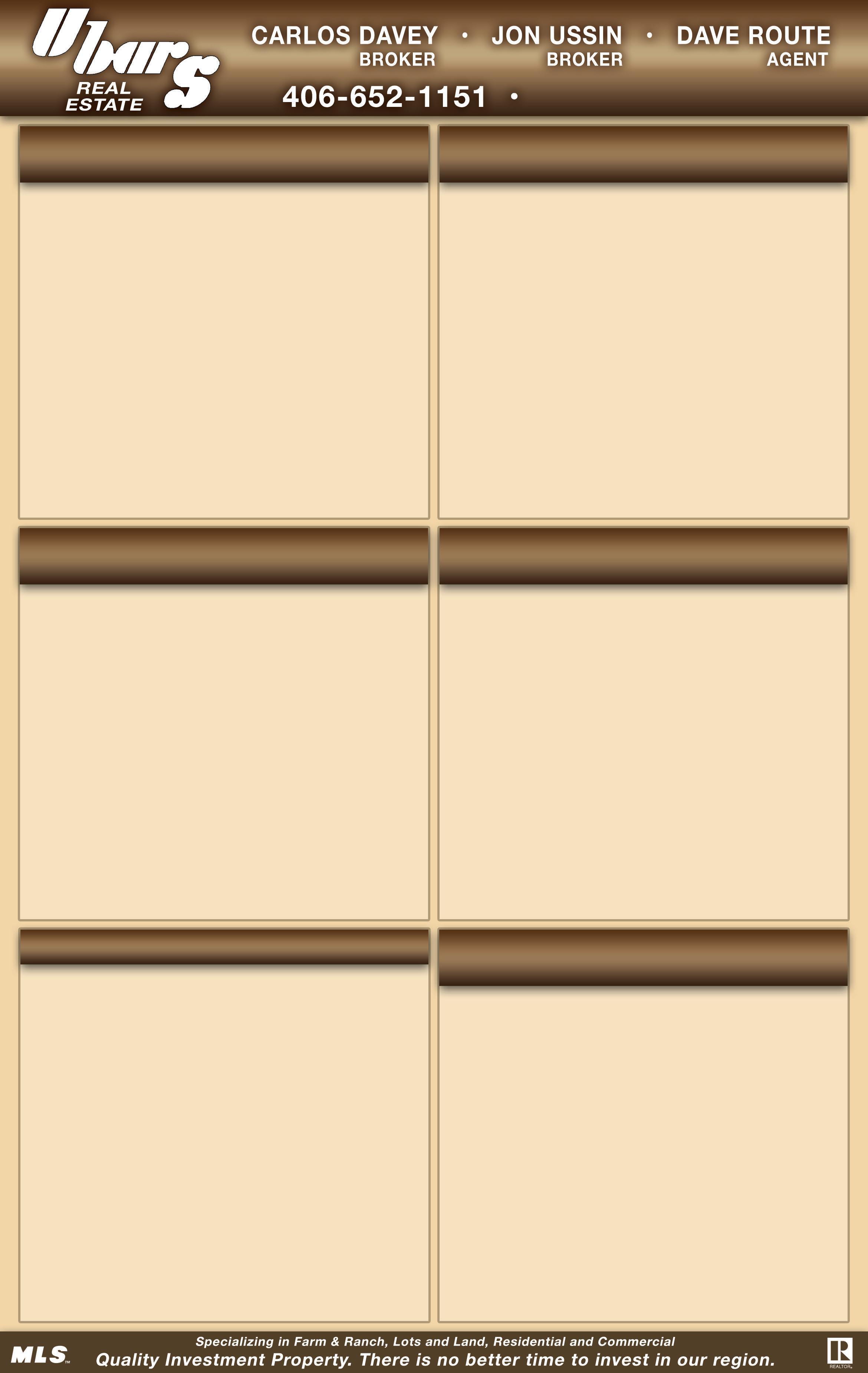 p 25 WWW.UBARS.NET Each unit 24x48, Duplex units-each building 48x48 – Firewall between units. Security entry, “KEY PAD” secure perimeter fence. Annual association fees $600.00/year (includes insurance), Central restrooms. Wood frame buildings w/color metal inside & out. 14 ft high overhead door, 14 ft wide plus a 3 ft walk in door. All metal lined inside. Concrete floor & front apron. Ceiling hung natural gas forced air heater. LED lighting. $95,000 RIDGEVIEW CONDO SHOP/ STORAGE SOUTH FRONTAGE LOT 1 ACRE 1.35 Ac along S Frontage Rd, w/excellent exposure to US Interstate 90. Just 2 miles E of S Billings Blvd exit. Septic tank & drilled well in place. City water & sewer on S Frontage Rd. $329,000 DOWNTOWN BILLINGS-SHOP/ RETAIL BUILDING Shop/retail building in downtown Billings, MT. Excellent exposure on a corner lot. Approx. 3,342 sqft of shop, concrete floors, 3 14x12 overhead doors & 2 man doors, 14 ft ceiling height, LED lighting, & bath. Retail/Office space is approx. 796 sqft, open space concept & att. bath. Parking lot has LED lighting. $825,000 BILLINGS/DOWNTOWN RETAIL/AUTO Retail location in Downtown Billings, MT. 3 lots providing exposure to 4 heavy traffic streets. Frontage exposure: Montana Ave 117 ft, 1st Ave N 239 ft, Division St 99 ft & N 36th St 206 ft. Sales office is approx. 2,818 sqft, has 3 private offices, a lg sales room & bath in the main level, add’l bath & lg storage area in the lower level. $1,200,000 PRIME COMMERCIAL PROPERTY 5 ACRES Approx. 4.6 ac in a prime west end location. 800 ft of road frontage along S Frontage Rd. Provide excellent exposure to Interstate 90 – approx. 28,000 annual average daily traffic. New commercial approach from S Frontage Rd. 24 ft in progress. Improvements include: Newly updated home by master carpenter, shop w/approx. 3,176 sqft heated/insulated, add’l shop that is approx. 1,380 sqft, det office space, & 3 drilled wells. $1,050,000 FIRST TIME ON THE MARKET 19.9 ACRES! First time on the market, 2 parcels of land on S. Frontage Rd, just E of the S Shiloh Rd overpass & half a mile from the Zoo Dr Exit I90. This Premier site is serviced by Exit 443 (Shiloh/Zoo Dr.) 586 ft of frontage w/outstanding I-90 exposure. Property has 2 access, one on Frontage Rd & one on Wise Ln. 2 tracts totaling 19.9 ac. Zoning CX - Heavy Commercial. Approx. 1,436 sqft Log Building/office, built in 1997. Approx. 8 irrigated ac. Billings is the regional hub & the largest city in a 500-mile radius. This location has become the destination for commercial & retail development. Its proximity to a major entry point to the West End of Billings provides this property endless opportunities. Real Estate Taxes: $8,737.27 $4,600,000
