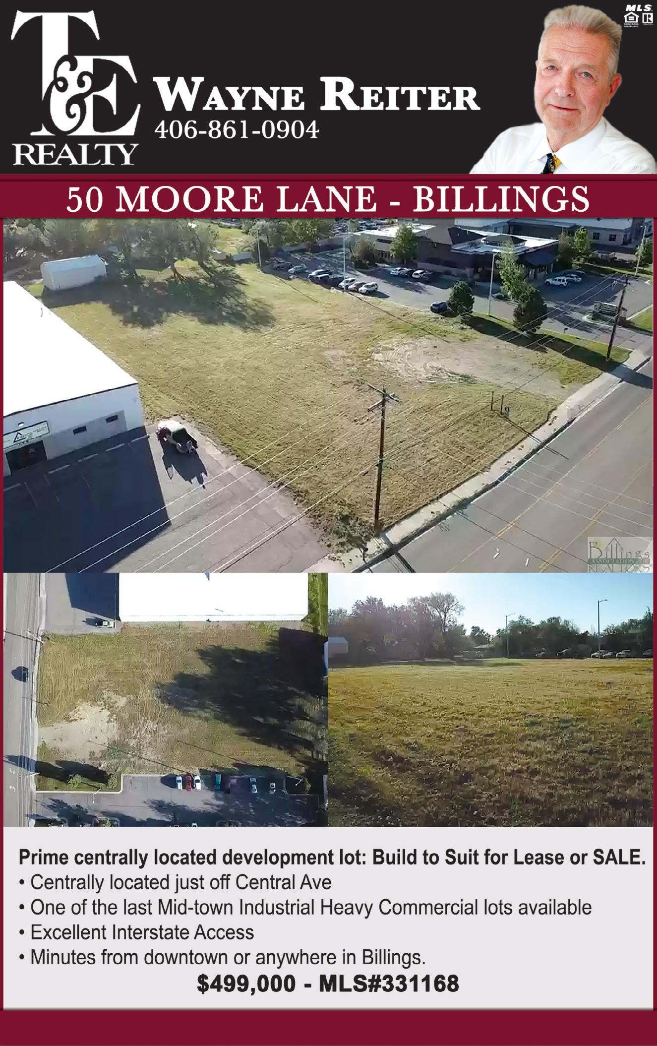 UNIQUE OPPORTUNITY! PRIME LOCATION! 510 PEMBERTON LANE • BILLINGS, MONTANA 811 2ND AVE N BILLINGS, MONTANA • For Sale or Lease Fantastic shop space in central Billings Located in city limits • Good office space for support staff • New 60 mil roof in 2021 • 3 phase power • Located in EBURD (tax increment district) • 2 overhead doors $3,250/month plus utilities $495,000 - MLS# 328533 Dave@billingscommercialrealestate.com • 1.59 Acres • Zoned CMU-1 • Electricity to the property • 2 access points to property $135,000 UNDER CONTRACT! 24 NIGHTINGALE BILLINGS, MONTANA • Unique Opportunity for builders/developers. Empty canvas of a building that can be renovated into a house. • 2 more lots that could be built on. • Zone change required, but very doable. • Call with questions $285,000 - MLS# 331956 FANTASTIC SHOP SPACE