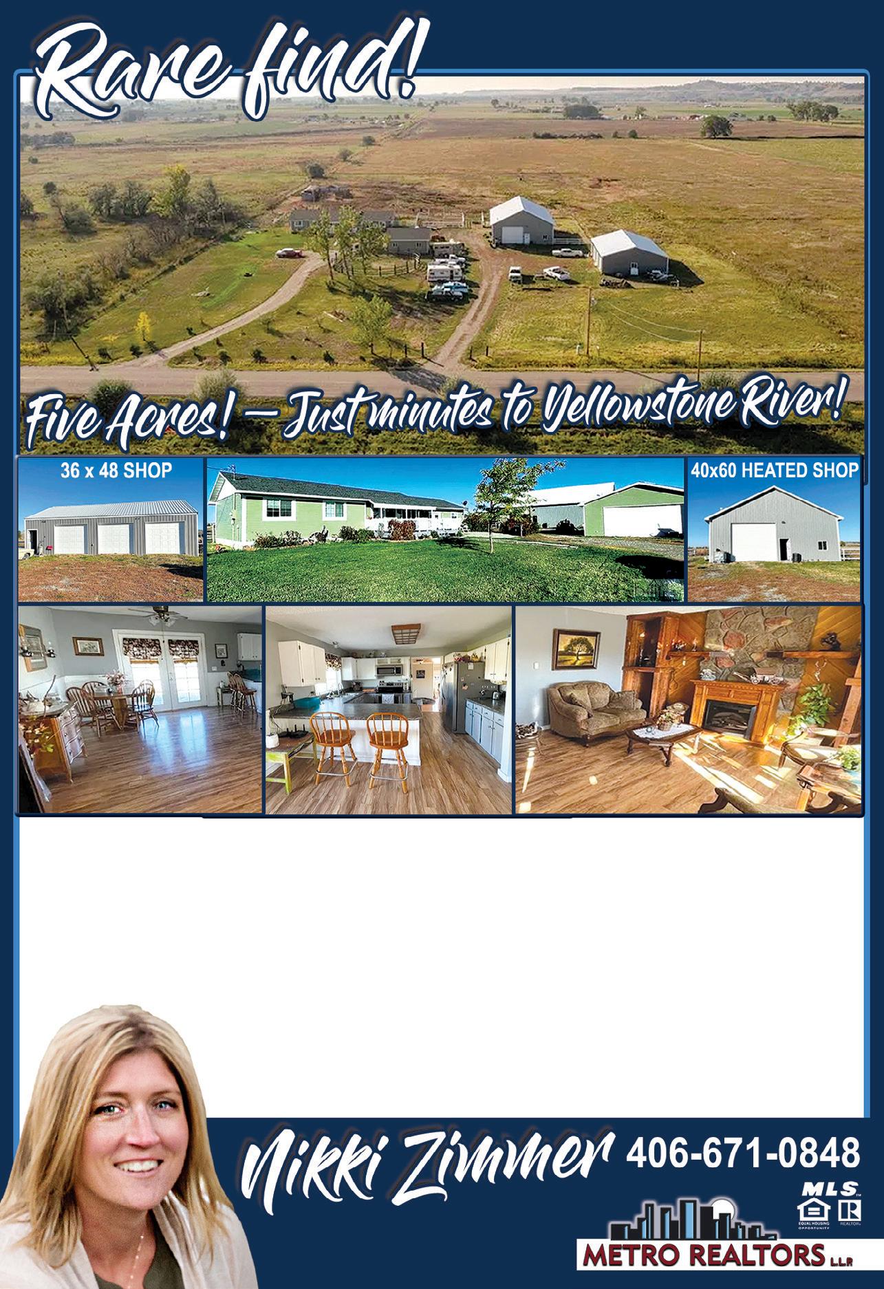 Rare find! 5-acre property minutes from Yellowstone River with beautiful sunset views. Need shops? 40 x 60 heated shop with 14’ tall doors, car hoist & office area is a working mechanic’s shop that can include all equipment! 36 x 48 shop with 3 doors can fit 6 cars easily. Another oversized double garage! No restrictions & plenty of water for livestock. One great producing well feeds the house, lawn & anything else needed. Perimeter fenced with separated pastures & round pen. Updated 1-level house with newer countertops, appliances & flooring. Newer electric heat plus electric fireplace & propane gas fireplace. All appliances stay, including washer/dryer. Propane tank owned. Roads paved & easy access from Hwy 312. Only 30 minutes to Billings. Take a look at this great place and enjoy the peace and quiet.