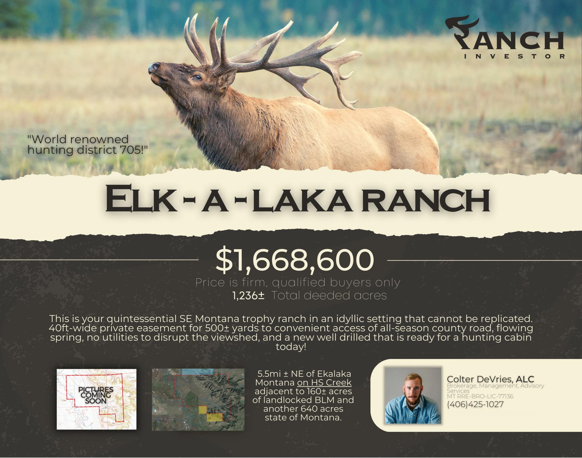 If you like to hunt this 1432.25 ac ranch is a must see. Heavy timber on the south end of the ranch holds mule deer & elk. There’s almost 2 miles of diked hay meadows for the cattle & it is a magnet for the deer & elk. The ranch is set up for cows w/a lg steel building, corrals & feedlot. Living is easy in a nice mobile home & an older partially remodeled 2 story home & bunk house. Water is plentiful w/4 wells & 3 reservoirs. One of the stock dams is quite lg & holds Canada Geese & Mallard Ducks additional birds are grouse & turkeys $2,400,000 w/possible owner financing.