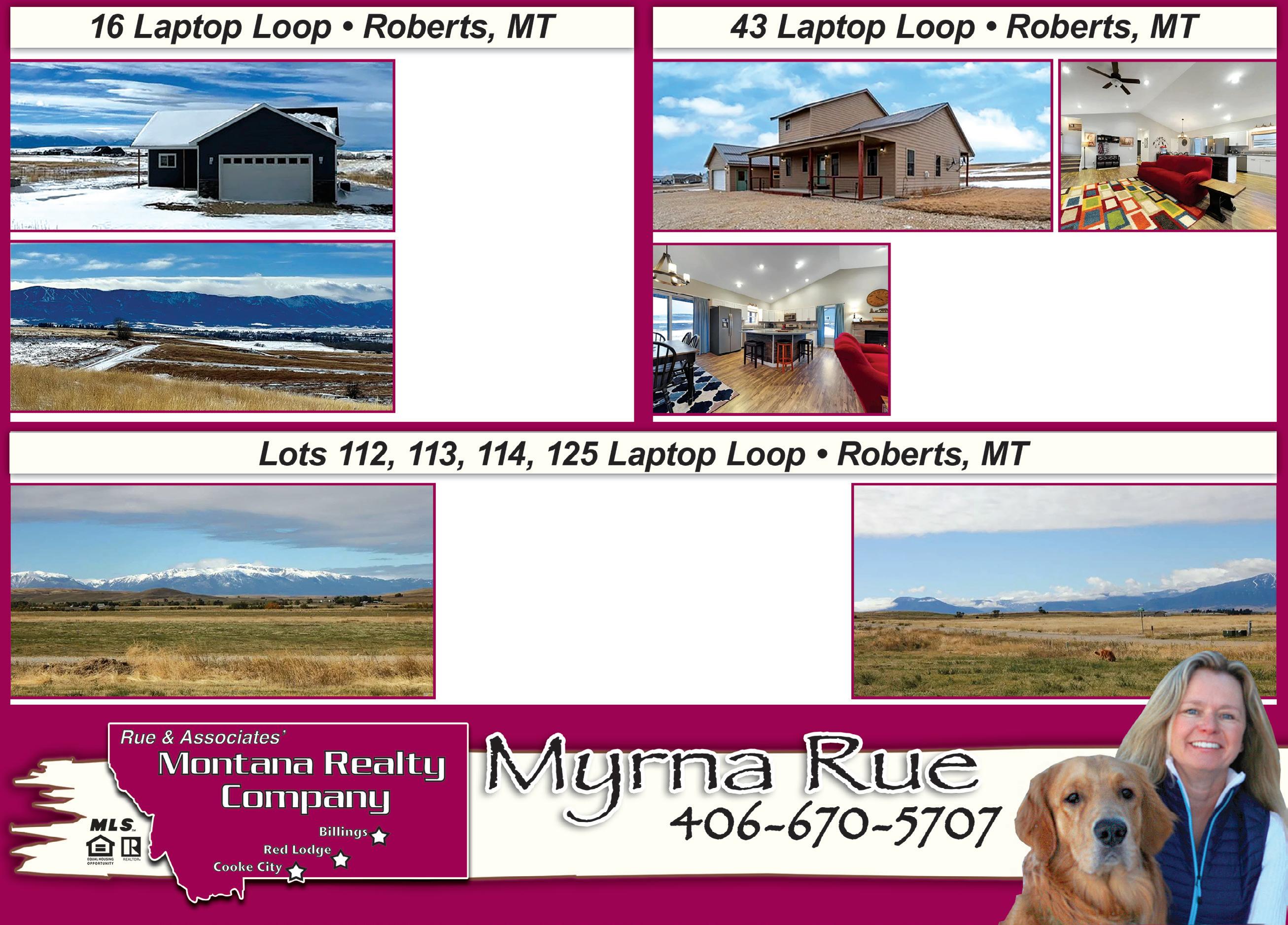 Fantastic view lots in the Dot Calm Subdivision. Close to the bus route for the fantastic Roberts (K-12) school and only 15 minutes to Red Lodge and 40 minutes to Billings. Lots 112 and 114 also available for a larger contiguous lot! Owner financing encouraged!