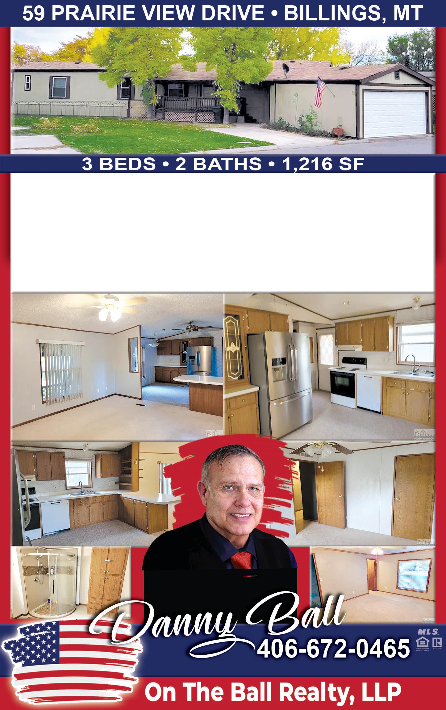 LAZY D RANCH • LOT 9 BRIDGER, MT 15.11 ACRES MLS# 333567 • $225,000 SKYLER KETOLA 406-290-4286 3D TOUR https://tinyurl.com/4jvjcr87 P R I C E D R O P P R I C E D R O P 17 KING ARTHUR DRIVE BILLINGS, MT This cute home is ready for it’s new owners! Meticulously maintained mobile home with a completely remodeled kitchen, complimenting the large open living spaces! Large bedrooms and separate laundry space. $90,000 | MLS# 337194 KALLI WESCOTT 406-850-7426 404 MAIN STREET WINIFRED, MT 3 bedroom home on Mainstream in Winifred, great potential for back yard. 2 living rooms and a large laundry/mudroom. Close to the Winifred school. $79,000 | MLS# 337185 CHANEY BOWEN 406-633-5479 3D TOUR: https://tinyurl.com/3vpcphah NEW LISTING! NEW LISTING! 1033 CONSTITUTION AVENUE BILLINGS, MT Spacious ranch style home with unique floor plan offering 3 bedrooms, 2 full baths and 1/2 bath off utility room. Features hardwood flooring, sitting room to patio, formal dining and main floor utility with washer and dryer staying. Two sliding doors to stamped concrete patio with hot tub, mature landscaped back yard backing up to open space for added privacy! $400,000 | MLS# 335588 LOWELL COOKE 406-661-5140 P R I C E D R O P OPEN SUNDAY, DEC. 4TH • 2:00-4:00 OPEN SUNDAY, DEC. 4TH • 11:00-1:00 3D TOUR: https://tinyurl.com/49cf4ydf P R I C E D R O P