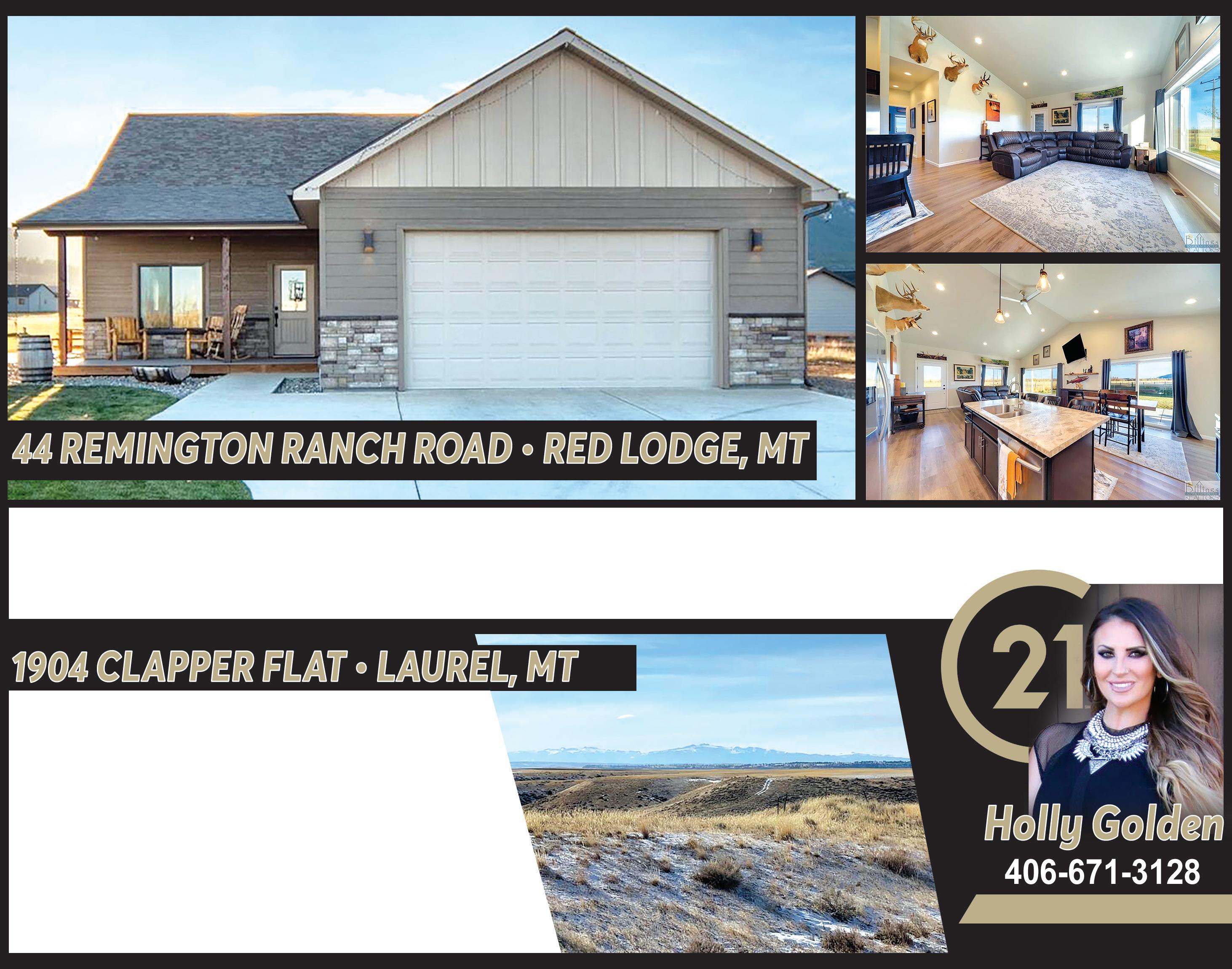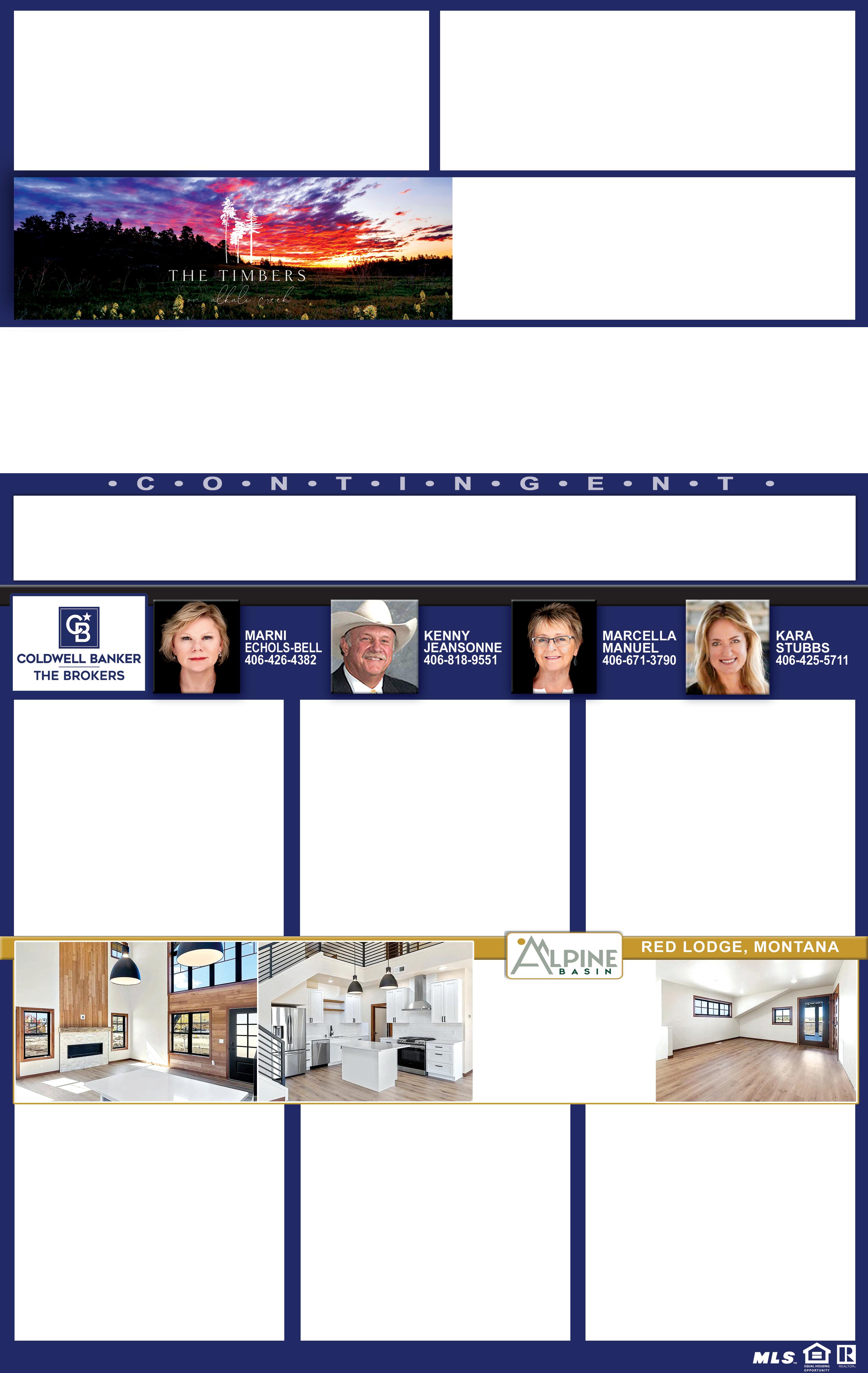 PG. 15 RE AL E S TATEPortfolio weekly www.BillingsRealEstate.org BLUE CREEK LAND BILLINGS, MT 1.08 AC • MLS# 328769 • $30,000 1.03 AC • MLS# 328767 • $35,000 1.43 AC • MLS# 328773 • $48,000 1.32 AC • MLS# 328778 • $45,000 2.7 AC • MLS# 328770 • $90,000 BRAD WITTEN 406-698-3829 HARDIN, MT 6.36 AC EACH MLS# 332197 MLS# 332198 $56,900 EACH CLINT SCHULTZ 406-860-2703 BUCKSKIN RD ROUNDUP. MT 55 AC MLS#331378 $177,000 TAITE JOHNSON 307-680-7133 TRENT JOHNSON 307-680-0033 TBD RAPELJE ROAD MOLT / RAPELJE, MT 76 AC • MLS# 333603 $180,000 EACH RACHEL COURT 406-794-9915 TAITE JOHNSON 307-680-7133 TRENT JOHNSON 307-680-0033 CENTER ROAD P R I C E D R O P L O T S F O R S A L E LOTS 1 & 2 MAMMOTH RD SHEPHERD. MT 10.11 AC EACH MLS#337606 & MLS#337607 $185,000 EACH CLINT SCHULTZ 406-860-2703 TBD SAPPHIRE AVENUE BILLINGS, MT $74,000 MIKE LESLIE 406-860-0262 www.Facebook.com /RedLodgeRealEstate 4524 CENTRAL BILLINGS, MT $7,560,000 MLS# 324668 MEGAN VADEN 406-696-8312 1520 HWY 384 HARDIN, MT $375,000 MLS# 328989 MIKE LESLIE 406-860-0262 3027 70TH ST W BILLINGS, MT $395,000 MLS# 337905 TARA CAYKO 406-672-6453 404 MAIN ST WINIFRED, MT $79,000 MLS# 337185 CHANEY BOWEN 406-633-5479 2943 SPRINGFIELD BILLINGS, MT $289,900 MLS# 337521 MEGAN VADEN 406-696-8312 3076 WESTERN BLUFFS BLVD BILLINGS, MT $629,000 MLS# 338356 CLINT SCHULTZ 406-860-2703 2203 E ECHO DRIVE BILLINGS, MT $459,000 MLS# 338427 RACHEL COURT 406-794-9915 539 ANDRICK AVENUE BILLINGS, MT $84,900 MLS# 337105 CLINT SCHULTZ 406-860-2703 TBD MOUNTAIN VIEW RD MOLT / RAPELJE, MT 78.10 AC MLS# 333591 509 N CUSTER HARDIN, MT $139,900 MLS# 3337154 LINDSAY VANDERSLOOT 406-850-5225 101 FEATHER LN LAVINA, MT $1,500,000 MLS#335984 TAITE JOHNSON 307-680-7133 3919 HIGH TRAIL RD BILLINGS, MT $525,000 MLS# 334970 BRAD WITTEN 406-698-3829 1204 LAKE ELMO DRIVE BILLINGS, MT $299,900 MLS# 335452 MEGAN VADEN 406-696-8312 58 HORSESHOE TRAIL ROBERTS, MT $1,950,000 Ι MLS# 331613 MARNI ECHOLS-BELL 406-426-4382 21 WOLFE DRIVE RED LODGE, MT $699,900 Ι MLS# 337144 MARCELLA MANUEL 406-671-3790 501 S WORD AVENUE RED LODGE, MT $695,000 Ι MLS# 326783 KENNY JEANSONNE 406-818-9551 87 EVENING STAR RED LODGE, MT $5,400,000 Ι MLS# 33146 MARCELLA MANUEL 406-671-3790 3014 ELDERBERRY AVENUE RED LODGE, MT $729,000 Ι MLS# 335477 MARCELLA MANUEL 406-671-3790 1409 SILVER CIRCLE RED LODGE, MT $529,000 Ι MLS# 338198 MARCELLA MANUEL 406-671-3790 64 ALPINE BASIN LOOP 3 BED • 3 BATH • 2,996 • SF 2 CAR GARAGE $899,900 Ι MLS# 337765 ALPINE BASIN TRAIL 3 BED • 2.5 BATH • 2,084 SF 2 CAR GARAGE $729,900 TO $739,900 MARCELLA MANUEL 406-671-3790 FOR MORE INFO: www.TimbersMT.com LAZY D RANCH LOT 9 BRIDGER, MT 15.11 ACRES MLS# 333567 $225,000 SKYLER KETOLA 406-290-4286 3D TOUR: https://tinyurl.com/4jvjcr87