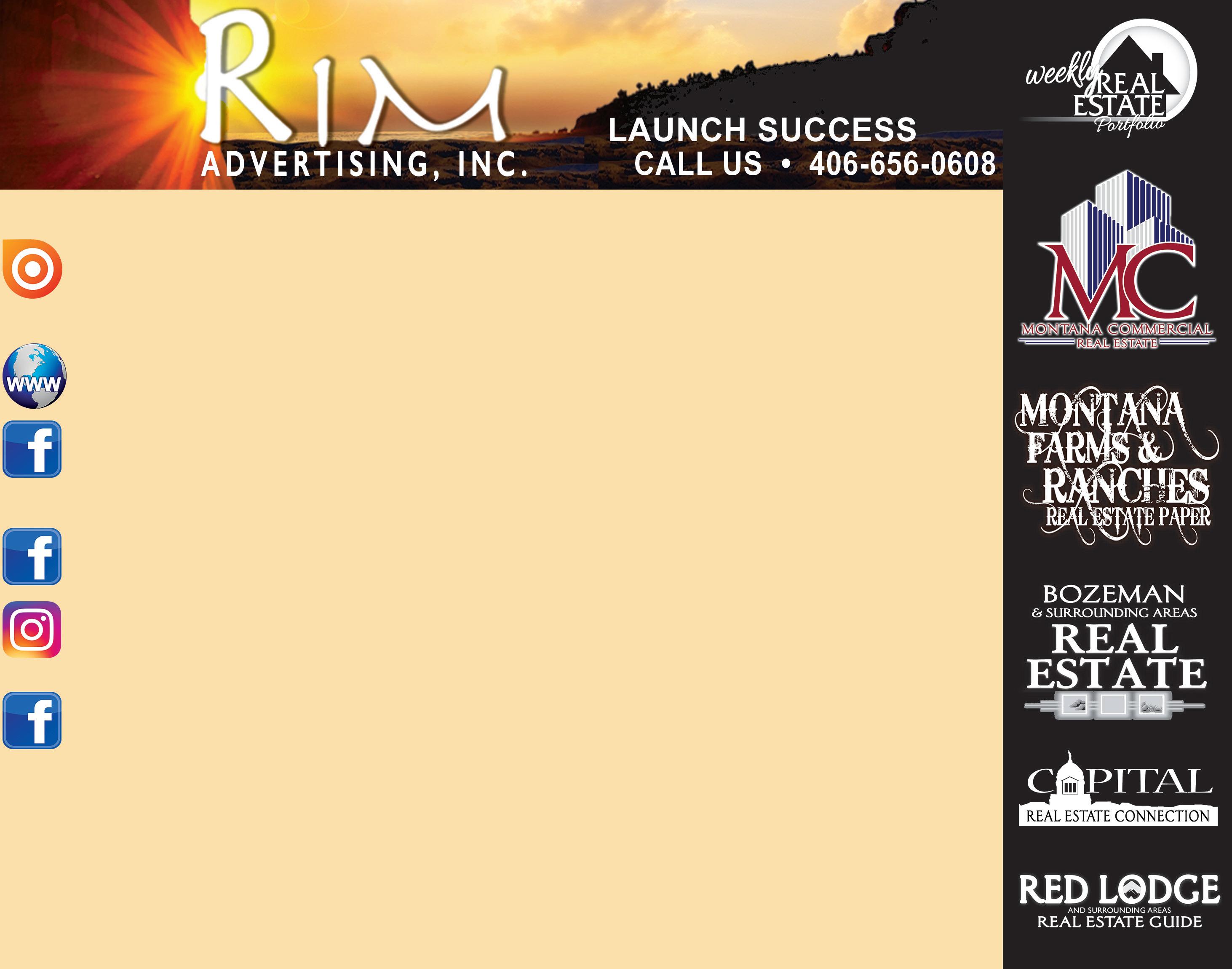 LIKE OUR FACEBOOK PAGE! www.facebook.com/MontanaCommercialRealEstate LIKE OUR FACEBOOK GROUP! https://www.facebook.com/groups/montanaforsale CHECK OUT THE MONTANA COMMERCIAL WEBSITE! YOU CAN LOOK AT THE LATEST ISSUE! PICK UP A PRINTED COPY OR READ A DIGITAL COPY ON OUR WEBSITE! check us out online: www.montanacommercialrealestate.com LIKE OUR FACEBOOK PAGE & GROUP! www.facebook.com/MontanaCommercialRealEstate https://www.facebook.com/groups/montanaforsale LIKE OUR INSTAGRAM PAGE! https://www.instagram.com/rimadvertisingmt/ CHECK OUT THE MONTANA COMMERCIAL WEBSITE!
