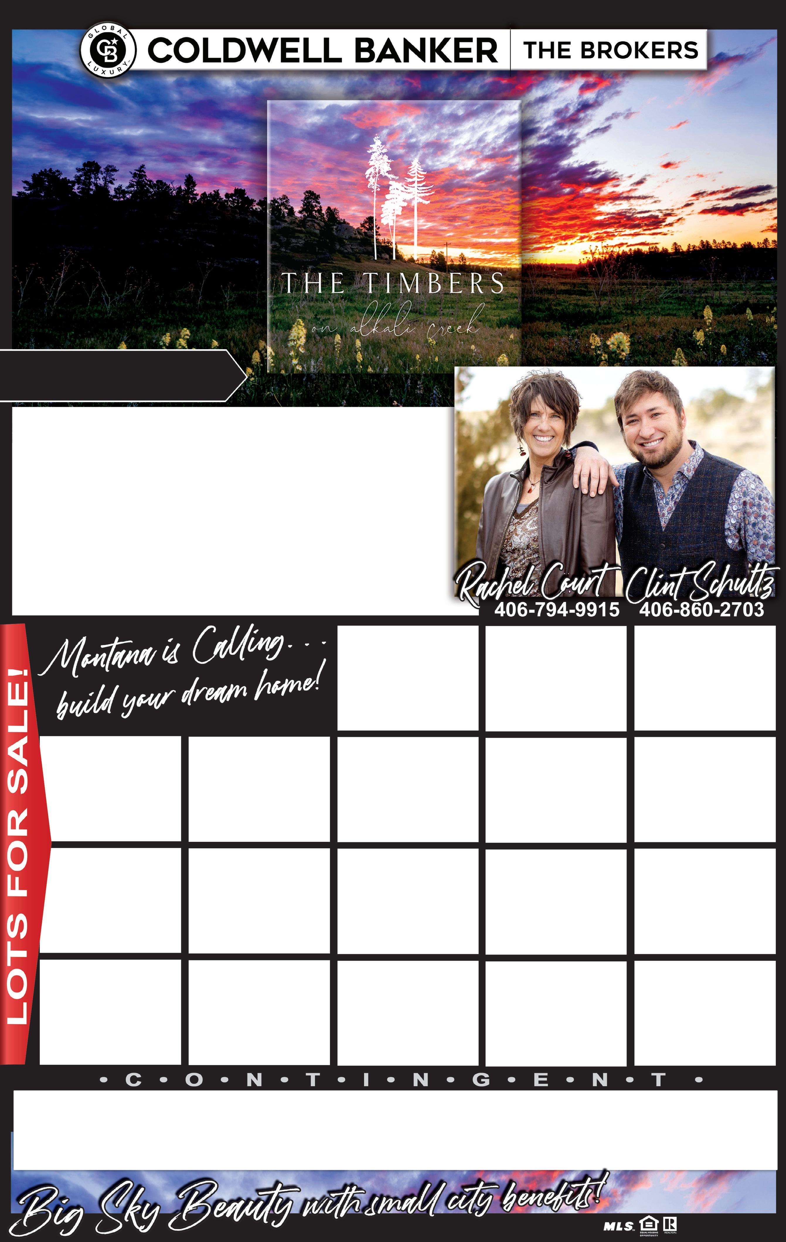 PG. 19 RE AL E S TATEPortfolio weekly www.BillingsRealEstate.org FOR MORE INFO: www.TimbersMT.com THE TIMBERS ON ALKALI CREEK Welcome to the Timbers on Alkali Creek, one of Billings’ Newest Land Developments. Bring your builder and build the Montana Home of Your Dreams! The Timbers on Alkali Creek has over 200 acres in which to choose a premium lot. Open landscapes to inspire you, wilderness adventures at your back door, and a community you can count on. The soon-to-come Inner-Belt Loop make this location prime for quick access to Billings’ Westend. Major infrastructure improvements to provide Billings Public Utilities for water and sewer to begin in the spring of 2022. You’ll find yourself among timbers with varied terrain, a small creek, hiking and biking trails. BLACK FIG COURT BILLINGS, MT LOT 21 • BLOCK 2 22,148 SF • MLS# 327015 $128,000 TIMBERS BLVD S BILLINGS, MT LOT 6 • BLOCK 2 30,305 SF • MLS# 331860 $130,000 TIMBERS BLVD S BILLINGS, MT LOT 10 • BLOCK 2 24,316 SF • MLS# 327027 $126,000 TIMBERS BLVD S BILLINGS, MT LOT 3 • BLOCK 2 25,805 SF • MLS# 331861 $126,000 GEORGIA PINE LANE BILLINGS, MT LOT 41 • BLOCK 2 23,529 SF • MLS# 333680 $115,000 BLACK FIG COURT BILLINGS, MT LOT 23 • BLOCK 2 22,927 SF • MLS# 327016 $122,000 OLIVE LANE BILLINGS, MT LOT 37 • BLOCK 2 26,219 SF • MLS# 327019 $120,000 OLIVE LANE BILLINGS, MT LOT 34 • BLOCK 2 19,043 SF • MLS# 327018 $99,000 OLIVE LANE BILLINGS, MT LOT 32 • BLOCK 2 18,699 SF • MLS# 331865 $99,000 OLIVE LANE BILLINGS, MT LOT 35 • BLOCK 2 20,396 SF • MLS# 331863 $99,000 TIMBERS BLVD S BILLINGS, MT LOT 29 • BLOCK 2 19,364 SF • MLS# 331862 $99,000 OLIVE LANE BILLINGS, MT LOT 33 • BLOCK 2 18,363 SF • MLS# 331864 $99,000 BLACK FIG COURT BILLINGS, MT LOT 15 • BLOCK 2 22,208 SF • MLS# 327014 $122,000 BLACK FIG COURT BILLINGS, MT LOT 13 • BLOCK 2 23,367 SF • MLS# 327017 $122,000 GEORGIA PINE LANE BILLINGS, MT LOT 42 • BLOCK 2 23,569 SF • MLS# 331866 $118,000 OLIVE LANE BILLINGS, MT LOT 26 • BLOCK 2 17,430 SF • MLS# 327023 $99,000 www.CBtheBrokers.com BLACK FIG CT LOT 22 - BK 2 MLS# 327025 $125,000 TIMBERS BLVD LOT 7 - BLK 2 MLS# 327021 $225,000 TIMBERS BLVD LOT 9 BLK 2 MLS# 327020 $110,000 BLACK FIG CT LOT 16 BLK 2 MLS# 329209 $120,000 TIMBERS BLVD LOT 4 - BLK 2 MLS# 332204 $130,000 GEORGIA PINE LOT 45 - BLK 2 / MLS# 329650 $159,000 BLACK FIG CT LOT 17 BLK 2 MLS# 329210 $165,000 GEORGIA PINE LN LOT 46 - BLK 2 MLS# 331999 $179,000 BLACK FIG CT LOT 18 - BLK 2 MLS# 328944 $185,000 GEORGIA PINE LN LOT 43 • BLK 2 MLS# 331867 $128,000 BLACK FIG CT LOT 20 • BLK 2 MLS# 327026 $165,000 TIMBERS BLVD S BILLINGS, MT LOT 5 • BLOCK1 19,920 SF • MLS# 327010 $126,000 TIMBERS BLVD MLS# 327021 $225,000 LOT 22 - BLK 1 MLS# 332032 $70,000 LOT 1 - BLK 1 MLS# 332077 $70,000 LOT 23 - BLK 1 MLS# 332033 $75,000 LOT 28 - BLK 1 MLS# 332038 $75,000 LOT 24 - BLK 1 MLS# 332034 $78,000 LOT 25 - BLK 1 MLS# 332035 $78,000 LOT 26 - BLK 1 MLS# 332036 $78,000 LOT 27 - BLK 1 MLS# 332037 $78,000 LOT 29- ‘BLK 1 MLS# 332039 $85,000 GEORGIA PINE LN LOT 44 • MLS# 333684 $159,000 BLACK FIG COURT BILLINGS, MT LOT 24 • BLOCK 2 20,564 SF • MLS# 327024 $115,000