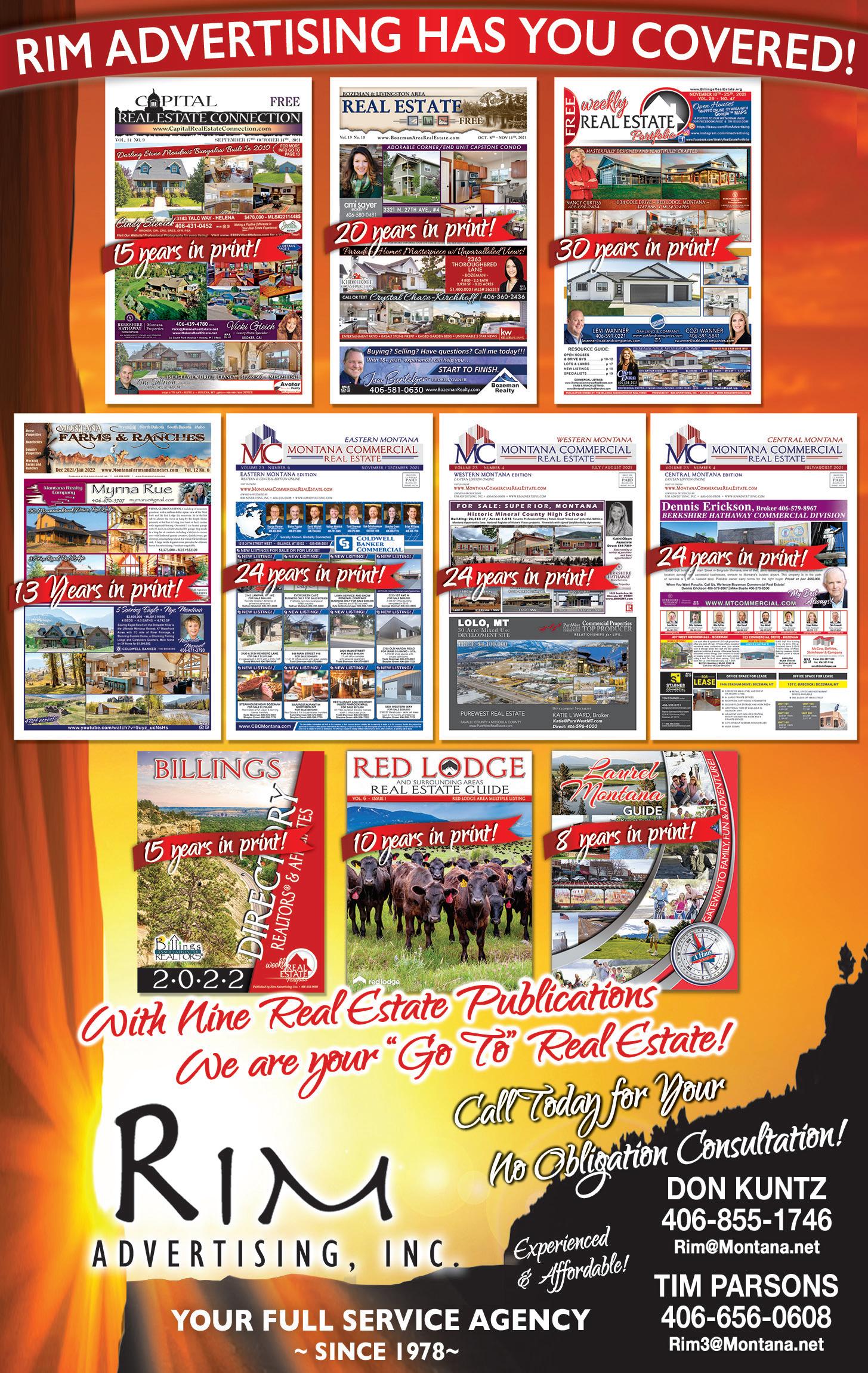 TO VIEW MORE ON THESE HOMES, SEE PAGES 12-13 PUBLICATION OWNED BY: THE BILLINGS ASSOCIATION OF REALTORS® DESIGNED & PRODUCED BY: RIM ADVERTISING, INC. • 406-656-0608 • WWW.RIMADVERTISING.COM COMMERCIAL LISTINGS: www.MontanaCommercialRealEstate.com FARM & RANCH LISTINGS: www.MontanaFarmsAndRanches.com www.BillingsRealEstate.org www.instagram.com/rimadvertising www.Facebook.com/WeeklyRealEstatePortfolio www.Facebook.com/groups/montanaforsale RESOURCE GUIDE: SPECIALISTS p 8 LOTS & LAND p 9 OPEN HOUSES p 12-14 RED LODGE p 20-21 NEW LISTINGS p 22 WINTER PROJECTS p 23 DECEMBER 15 TH thru 21 ST , 2022 VOL. 30 - NO. 50 cwanner@oaklandcompanies.com lwanner@oaklandcompanies.com www.oaklandcompanies.com www.NancySellsMontana.com Nancy@curtissrealestate.com