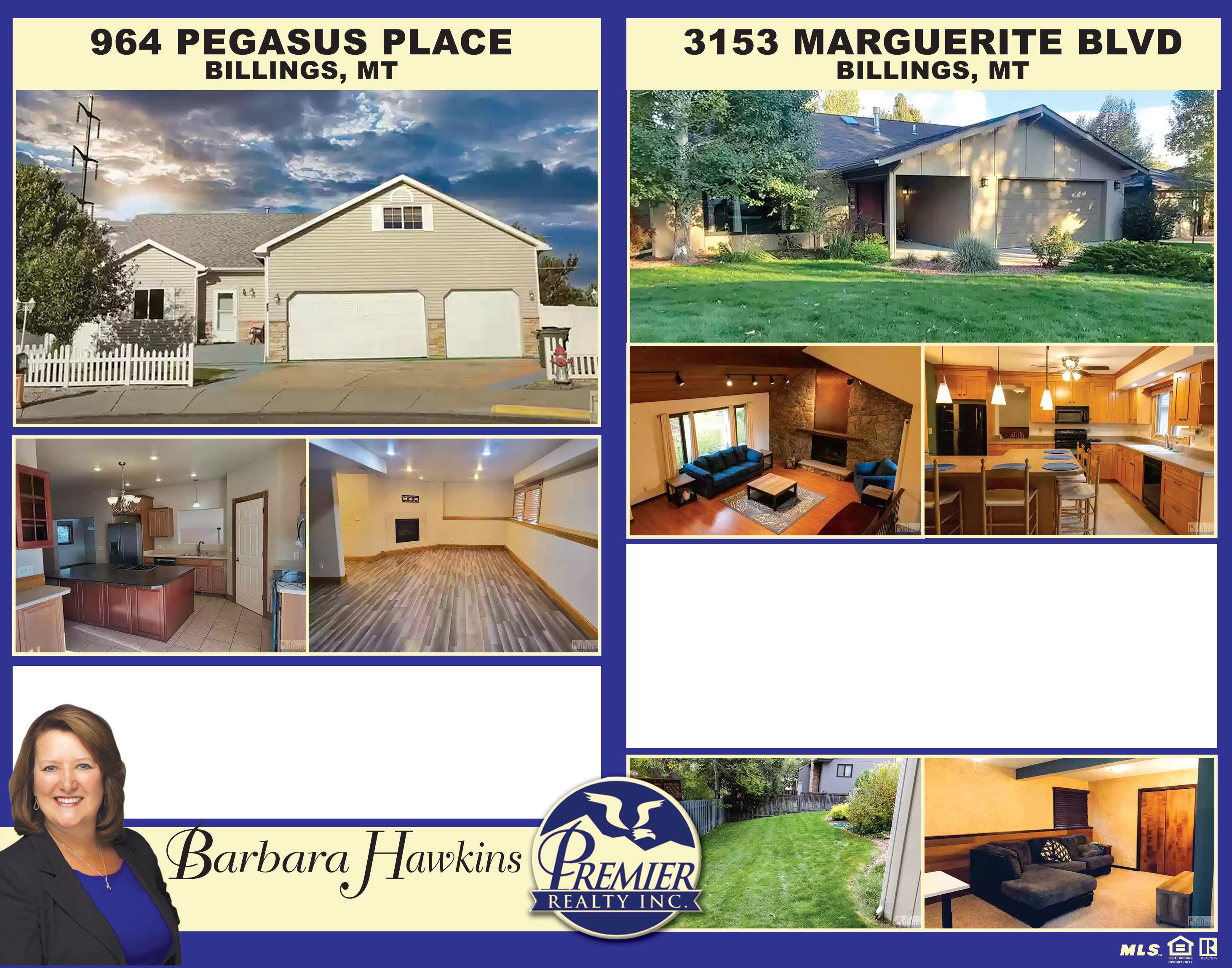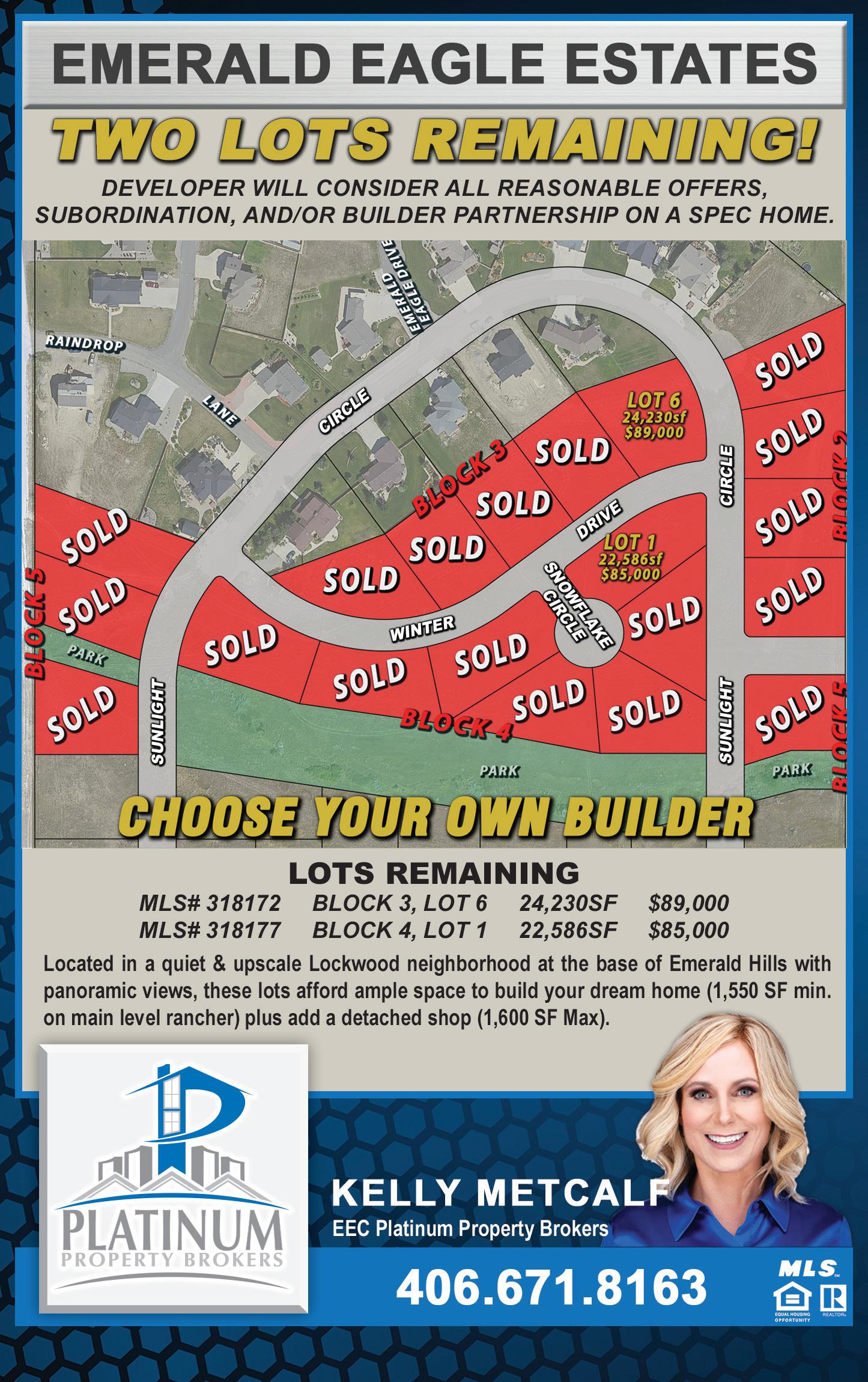 Bed, 3 Bath 2549 SF home on 1.22 acres in Emerald Hills. Nice open floor plan on main level w/vaulted ceilings. Spacious Living Room with several windows to enjoy the views. Kitchen/Dining area have tile floor and patio door to relaxing deck. Master bedroom has private bath w/jetted tub. Lower level has Family room, additional bedroom, bath/ laundry combo w/garage access. New roof in 2021. Double attached tuck garage. 3,000 gallon cistern. 500 gallon propane tank is owned. 6862 COPPER RIDGE LOOP • BILLINGS, MT • $500,000 2 Bed, 1 Bath 924 SF -14x66 mobile home in Casa Village. 3rd Room could be non-egress bedroom/office/bonus. Washer/dryer stay. Fully fenced with above ground sprinkler system on irrigation off of ditch. Security system. Covered front deck area plus storage/bonus area off the back.1-2 car off street parking pad plus share a 2nd 2-car pad w/ neighbor. Lot rent $440/month w/ $20 utility charge (maintenance base fee for water/sewer)-includes access to community outdoor pool, tennis court, basketball court, rec center. Garage & Meeting Space available for rent. Roof-2022, Gutters-2018, A/C-2016, Furnace-2015, Water Heater-2016. Montana living nestled against the pine trees in Emerald Hills! 3 Bed. 2 ½ Bath. 1988 SF home with shop on 7.295 acres. New flooring throughout except bathrooms & laundry. Several new windows and patio doors. Roofing metal shingle in 2014. Walkout family room w/gas fireplace. Master bedroom has private bath w/jetted tub. Dbl att. garage plus 40’x60’ Shop w/16 ft high to peak, 12 ft door and 220 electrical. ONLINE VIRTUAL TOUR: https://vimeo.com/749623039 ONLINE VIRTUAL TOUR: www.propertypanorama.com/instaview-tour/bmt/331397 1 SOMBRERO DRIVE • BILLINGS, MT • $55,000 4723 WILDCAT DRIVE • BILLINGS, MT • $495,000 5137 PRYOR MOUNTAIN VIEW DRIVE • BILLINGS, MT • $595,000 5324 SUNDANCE MOUNTAIN CIRCLE • BILLINGS, MT • $599,900 103 PAVESTONE TRAIL • BILLINGS, MT • $1,300,000