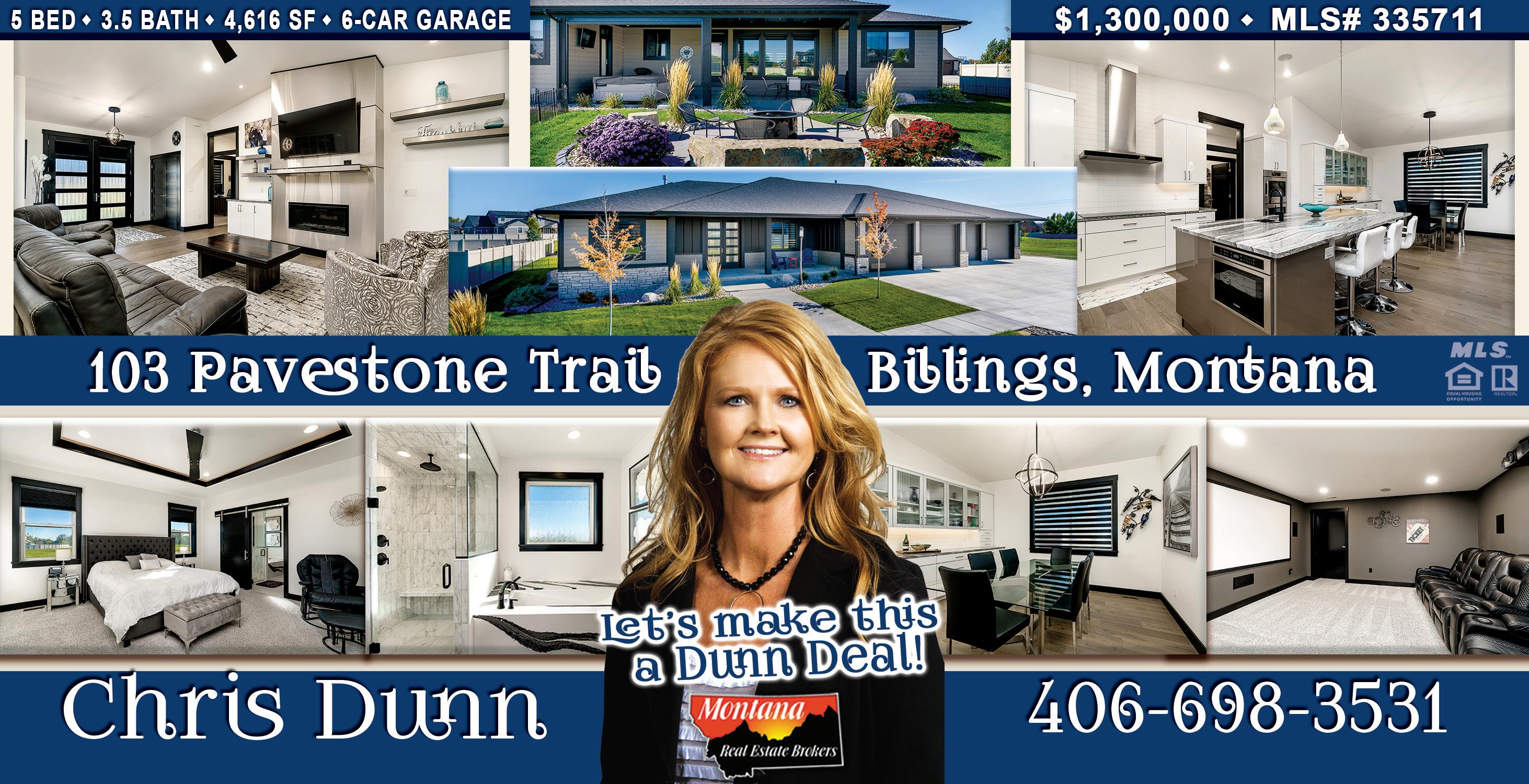 RE AL E S TATEPortfolio weeklyPortfolio PG. 3www.BillingsRealEstate.org www.DunnDeal.us Chris@DunnDeal.us ONLINE TOUR: https://vimeo.com/409592911 5 beds (3 up), 3 bath, 4-level home on Westend w/ vaulted ceilings & recessed lighting. 2,994 SF, Pentecost Construction home w/ open floor plan & lots of light. Cust. kitchen w/crown molding, under cabinet lighting, spacious island, SS appli, door leading to patio & fenced yard. Up: Master suite w/private bath w/ double sink vanity & walkin closet, 2 add’l beds, full bath & laundry rm w/cabinets & sink. Daylight LL: family rm w/recessed lights, electric FP with floor-to-ceiling tile & daylight windows, Plus add’l bed & bath. Lowest level: 5th bed & Lg bonus rm or possible 6th bed. Covered front porch w/recessed lights. Dbl att. garage. UGSP. Prepare to be awestruck by this Red Lodge Home! 5,267 SF, 6 bed, 5 ½ bath, Soaring ceilings, textured walls, hw floors, knotty alder cabinetry & high-end details. LR w/lg windows & gas fireplace w/floor to ceiling stone. Expansive kitchen w/island, gas cooktop, knotty alder cabinets, granite counters, walk-in pantry, dual oven, Miele built-in coffee machine & breakfast nook w/sev. windows w/pristine view. Dining area w/hw floors, wet bar, surround sound & entry to spacious patio. Patio boasts built-in bbq & covered area w/hot tub. Huge laundry rm w/ample storage. Master Suite w/surround sound, see thru gas FP to private bath w/jetted tub, dbl-head steam tile shower, walk-in closet & patio door. Office w/built-in bookshelves, corner desk & surround sound. Up Lev: 4 beds (2 w/priv baths), 2 family rms & balcony. Heated dbl gar. Seasonal creek. ONLINE VIRTUAL TOUR: www.propertypanorama.com/instaview-tour/bmt/329411 SIGNAL PEAK TOWNHOMES 2995 W COPPER RIDGE LP BILLINGS, MT • $439,900 2523 CONSTELLATION TR BILLINGS, MT • $565,000 361 STONEGATE CIRCLE BILLINGS, MT • $369,900 S0LD WITHIN 48 HOURS!! PRICE IMPROVEMENT! Quality custom built townhomes in Northwest Billings Kitchens boast Quartz counter tops, Stainless Steel appliances, under cabinet lighting, tile backsplash & pantry. LVP flooring in entry, kitch, dining & living room. Carpeted, All windows with blinds installed. 2x6 walls w/Rockwool demising insulation between units for sound barrier. Private covered front & back patio area. Anderson Windows. Hardi Siding. Double attached insulated/ sheet rocked garage. HOA Fee of $175 /month includes Lawn, Snow, Water & Exterior Insurance. ONLINE VIRTUAL TOUR: www.propertypanorama.com/instaview-tour/bmt/331397 ONLINE VIRTUAL TOUR: www.propertypanorama.com/instaview-tour/bmt/335638 ONLINE VIRTUAL TOUR: www.propertypanorama.com/instaview-tour/bmt/331397 2 BED 2 BATH 1,063 SF $320,000 3 BED 2 BATH 1,211 SF $360,000 6 BOBCAT LANE • RED LODGE, MT • $2,500,000 Pristine, turnkey 5 bed, 3 bath, 3,262 SF home built in 2015. Main: stylish living rm w/floorto-ceiling tile, gas FP, vaulted ceilings, exposed beam, & recessed lighting, spacious open concept kitchen & dining area. Durable LVP flooring. Kitchen w/pantry, island w/bar seating, under cabinet lighting, & patio door overlooking prof. landscaped yard w/vinyl fencing & gas firepit. Laundry rm w/sink & storage. Master w/carpet, elegant Trayed ceiling, walk-in closet, & full bath w/dual sink vanity & upgraded shower. Low lev: lg entertainment rm plumbed for wet bar & prewired for audio sys, bath,2 bed, & versatile storage area. Soft close cabinets, central air, GFA heating, & all beds wired for cable/internet. Finished/heated 950 SF gar. w/utility sink.