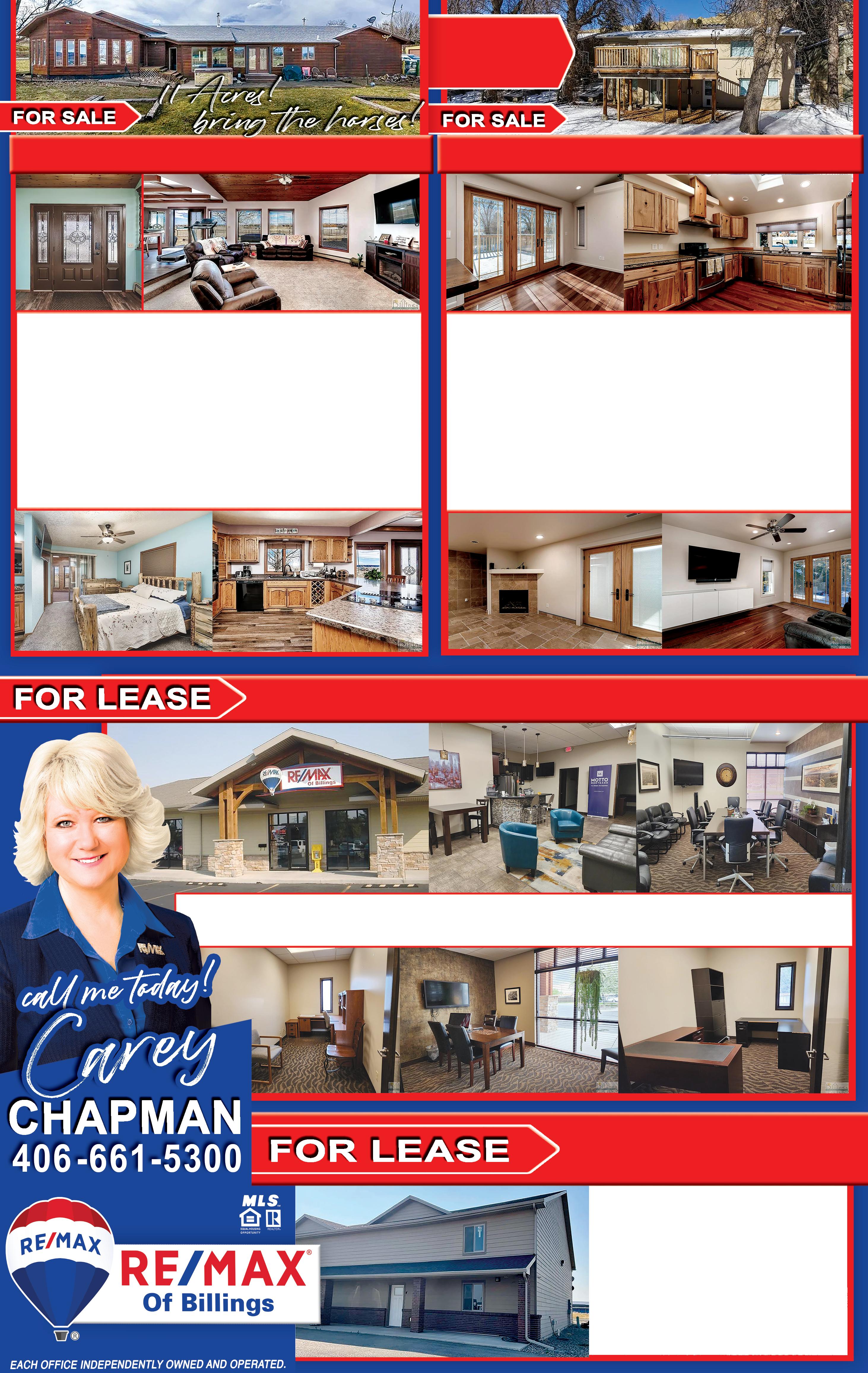 SPECIALISTS IN THEIR FIELDS! The Weekly Real Estate Portfolio is published every Thursday for the Billings Association of REALTORS®. Over 10,000 copies are distributed Free throughout Yellowstone County and the surrounding area. Neither the listing broker nor the publisher will be responsible or liable for misprints, misinformation, typographical errors, etc. The publisher reserves the right to refuse any advertising deemed not to be in the best interest of the publication. Real estate listing space is available to members of the Billings Association of REALTORS® and real estate agents. Published For: Billings Association of REALTORS®, 2021 Overland Avenue, Billings, Montana, 59102, 406-248-7145. Produced and Distributed by: RIM Advertising, Inc., 2048 Overland Ave., Suite 201, Billings, Montana, 59102, 406-656-0608. Correction/addition policy: All ad corrections/additions must be in writing, and submitted no later than 2pm on Wednesday to guarantee posting. Otherwise, the Billings Association of REALTORS® and RIM Advertising, Inc. take NO responsibility for errors or omissions. Materials can be emailed to rim2@montana.net. RE AL E S TATEPortfolio Portfolio weekly PG. 16 www.BillingsRealEstate.org PAINTING SPECIALISTS b.borich@yahoo.com HOME INSURANCE SPECIALISTS agentjaycochran.com HOME LOAN SPECIALIST www.billingsfcu.org HOME INSURANCE SPECIALIST kj@fauthagency.com STEEL SIDING & ROOFING SPECIALIST 406-568-2500 JOSH@valleysteelllc.com • www.ValleySteelLLC.com INSURANCE SPECIALIST DARNIELLE DARNIELLE INSURANCE AGENCY 1320 28th Street West • Billings, MT 59102 • AUTO • HOME • BUSINESS 406•652•4180 • www.darnielle.com INSPECTION SPECIALISTS Mike@MontanaInfrared.com