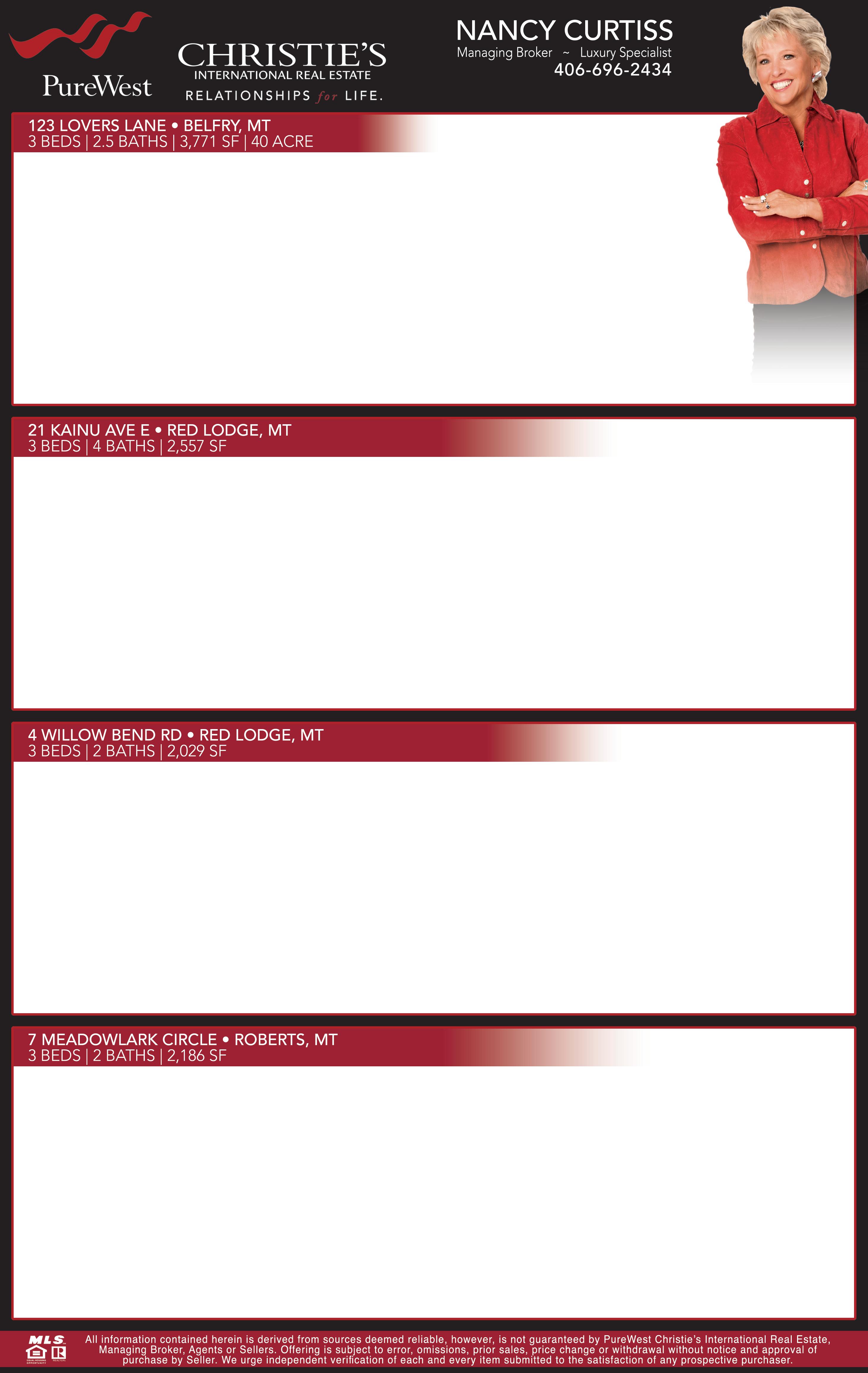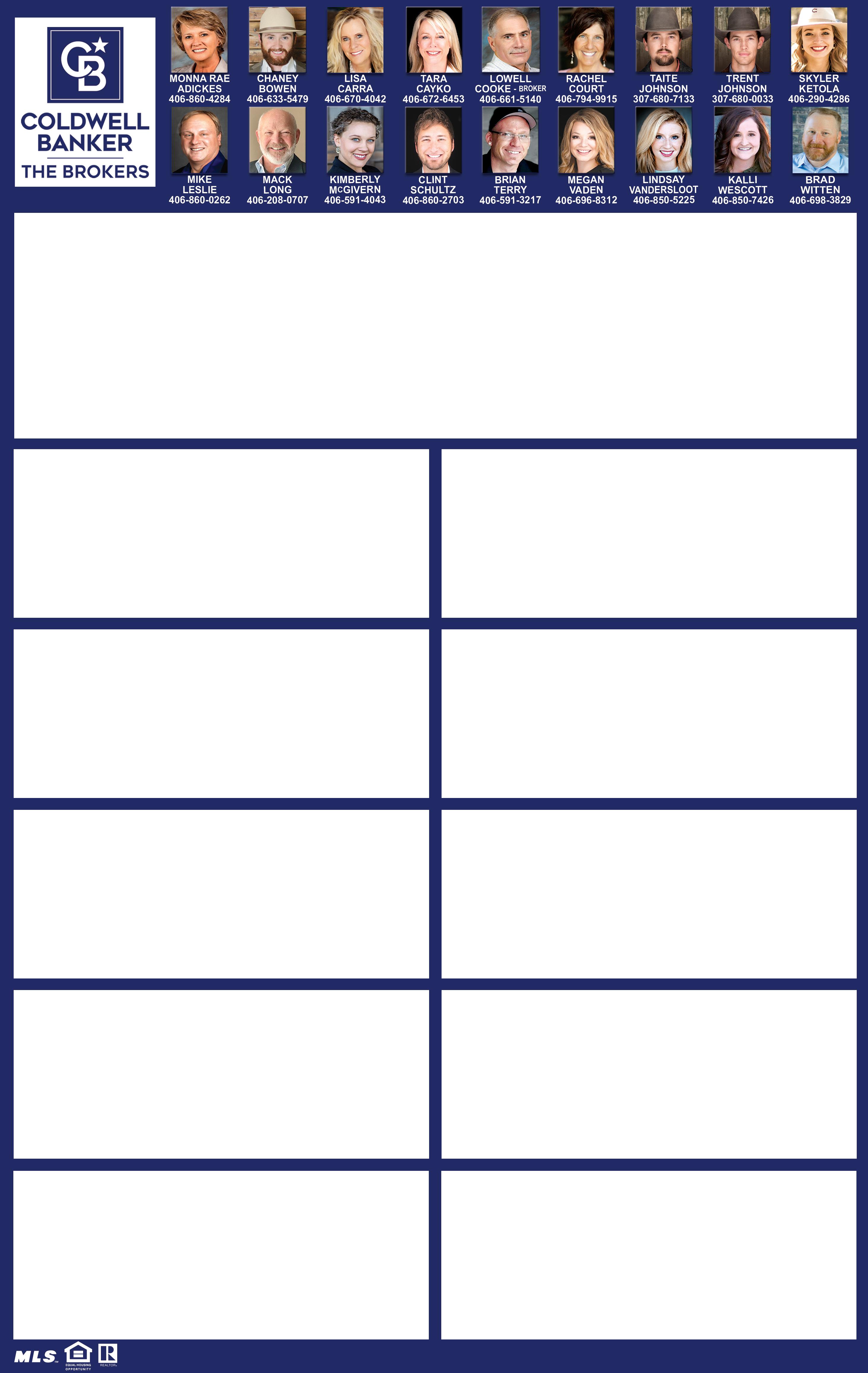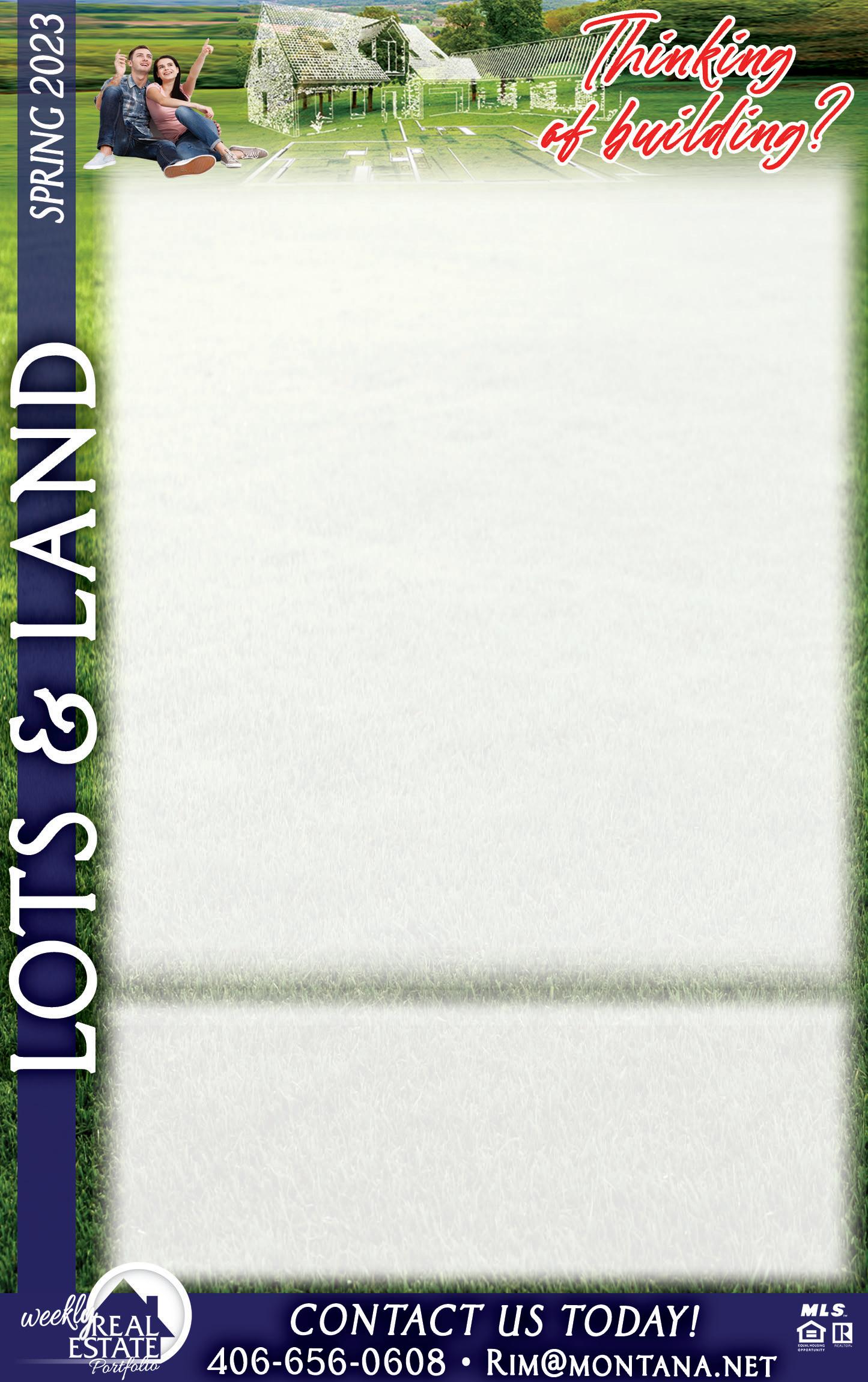 CLINT SCHULTZ 406-860-2703 • RACHEL COURT 406-794-9915 4524 CENTRAL BILLINGS, MT $7,560,000 MLS# 324668 MEGAN VADEN 406-696-8312 1520 HWY 384 HARDIN, MT $375,000 MLS# 328989 MIKE LESLIE 406-860-0262 404 MAIN STREET WINIFRED, MT $79,000 MLS# 337185 CHANEY BOWEN 406-633-5479 TBD MOUNTAIN VIEW MOLT / RAPELJE MLS# 333591 RACHEL COURT 406-794-9915 509 N CUSTER HARDIN, MT $139,900 MLS# 3337154 LINDSAY VANDERSLOOT 406-850-5225 1271 GRUBSTAKE CIRCLE, MT $375,000 MLS# 339012 CLINT SCHULTZ 406-860-2703 3648 GLANTZ DR BILLINGS, MT $450,000 MLS# 338925 RACHEL COURT 406-794-9915 770 ASTEROID BILLINGS, MT $239,000 MLS# 338694 KIMBERLY MCGIVERN 406-591-4043 BUCKSKIN RD ROUNDUP, MT MLS#331378 $177,000 TAITE JOHNSON 307-680-7133 7113 LANCE ST SHEPHERD, MT $399,000 MLS# 338957 KALLI WESCOTT 406-850-7426 5330 ENCAMPMENT ACTON, MT $439,900 MLS# 339090 KALLI WESCOTT 406-850-7426 712 SUMMIT RIDGE BILLINGS, MT $534,900 MLS# 339091 RACHEL COURT 406-794-9915 COTTONWOOD RD SILESIA, MONTANA $1,650,000 MLS# 331769 TAITE JOHNSON 307-680-7133 TRENT JOHNSON 307-680-0033 6146 SANDALWOOD $710,000 MLS# 339227 RACHEL COURT 406-794-9915 7007 MOLT ROAD BILLINGS, MT $394,900 MLS# 339307 LOWELL COOKE 406-661-5140 545 LEOPARD ST BILLINGS, MT $410,000 MLS#339392 KALLI WESCOTT 406-850-7426 6225 HORSETHIEF LANE SHEPHERD, MT $369,900 MLS#339499 LINDSAY VANDERSLOOT 406-850-5225 810 WYOMING AVE LAUREL, MT $230,000 MLS#338589 LINDSAY VANDERSLOOT 406-850-5225 1735 CODY DRIVE BILLINGS, MT $350,000 MLS#339698 MONNA RAE ADICKES 406-860-4284 410 EAST ROSEBUD RIVER ROAD RED LODGE, MT $999,900 Ι MLS# 339535 MARCELLA MANUEL 406-671-3790 BLUE CREEK LAND BILLINGS, MT 1.08 AC • MLS# 328769 • $30,000 1.03 AC • MLS# 328767 • $35,000 1.43 AC • MLS# 328773 • $48,000 1.32 AC • MLS# 328778 • $45,000 2.7 AC • MLS# 328770 • $90,000 BRAD WITTEN 406-698-3829 L O T S F O R S A L E 3D TOUR: HTTPS://TINYURL.COM/4JVJCR87 LOT 1 MAMMOTH ROAD SHEPHERD, MT 10.11 AC • MLS#337606 $185,000 LOT 2 MAMMOTH ROAD SHEPHERD, MT 10.11 AC • MLS#337607 $185,000 CLINT SCHULTZ 406-860-2703 LAZY D RANCH LOT 9 BRIDGER, MT 15.11 AC • MLS# 333567 • $225,000 SKYLER KETOLA 406-290-4286 TBD RAPELJE ROAD MOLT / RAPELJE, MT 76 AC • MLS# 333603 • $180,000 RACHEL COURT 406-794-9915 TAITE JOHNSON 307-680-7133 TRENT JOHNSON 307-680-0033 0 W 14TH • HARDIN, MT $17,000 • MLS# 339150 RACHEL COURT 406-794-9915 TBD SAPPHIRE AVENUE BILLINGS, MT $74,000 • MLS# 337929 MIKE LESLIE 406-860-0262 112 TWO MILE BRIDGE ROAD RED LODGE, MT $1,250,000 Ι MLS# 339811 MARCELLA MANUEL 406-671-3790 N E W L I S T I N G ! N E W L I S T I N G !