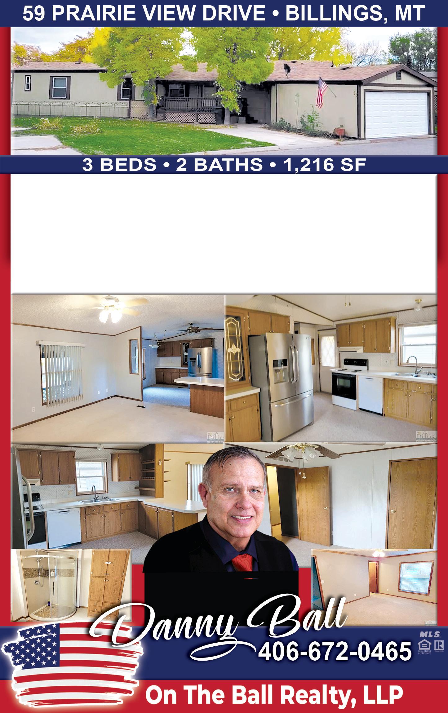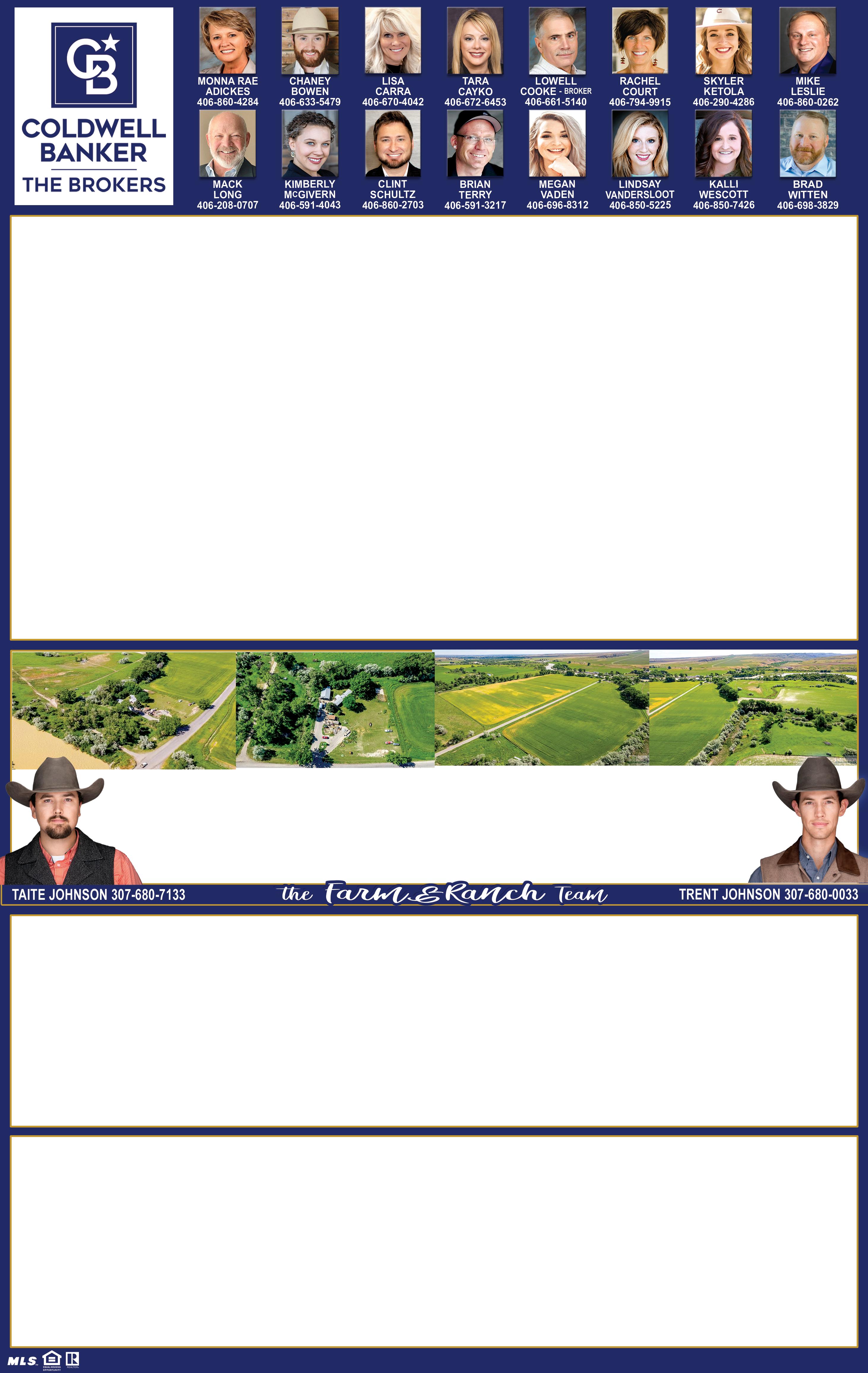 LAZY D RANCH • LOT 9 BRIDGER, MT 15.11 ACRES MLS# 333567 • $225,000 SKYLER KETOLA 406-290-4286 3D TOUR https://tinyurl.com/4jvjcr87 CONTINGENT! P R I C E D R O P P R I C E D R O P 17 KING ARTHUR DRIVE BILLINGS, MT This cute home is ready for it’s new owners! Meticulously maintained mobile home with a completely remodeled kitchen, complimenting the large open living spaces! Large bedrooms and separate laundry space. $90,000 | MLS# 337194 KALLI WESCOTT 406-850-7426 404 MAIN STREET WINIFRED, MT 3 bedroom home on Mainstream in Winifred, great potential for back yard. 2 living rooms and a large laundry/mudroom. Close to the Winifred school. $79,000 | MLS# 337185 CHANEY BOWEN 406-633-5479 3D TOUR: https://tinyurl.com/3vpcphah NEW LISTING! NEW LISTING! 32 BUCKHORN DR • ROUNDUP, MT MONTANA DREAM CABIN! This magnificent 20 acre property in Delphia Pines outside of Roundup, MT, has a bunkhouse and a darling cabin with a front porch overlooking open pasture, sage bush, and pine timber, where you’ll enjoy watching the deer and antelope play. The property has good fencing all around, great for horses or other livestock. The well located on the property produces fantastic water (625 ft). $419,900 | MLS# 331785 RACHEL COURT 406-794-9915 3D TOUR: https://tinyurl.com/29vyskxs P R I C E D R O P P R I C E D R O P