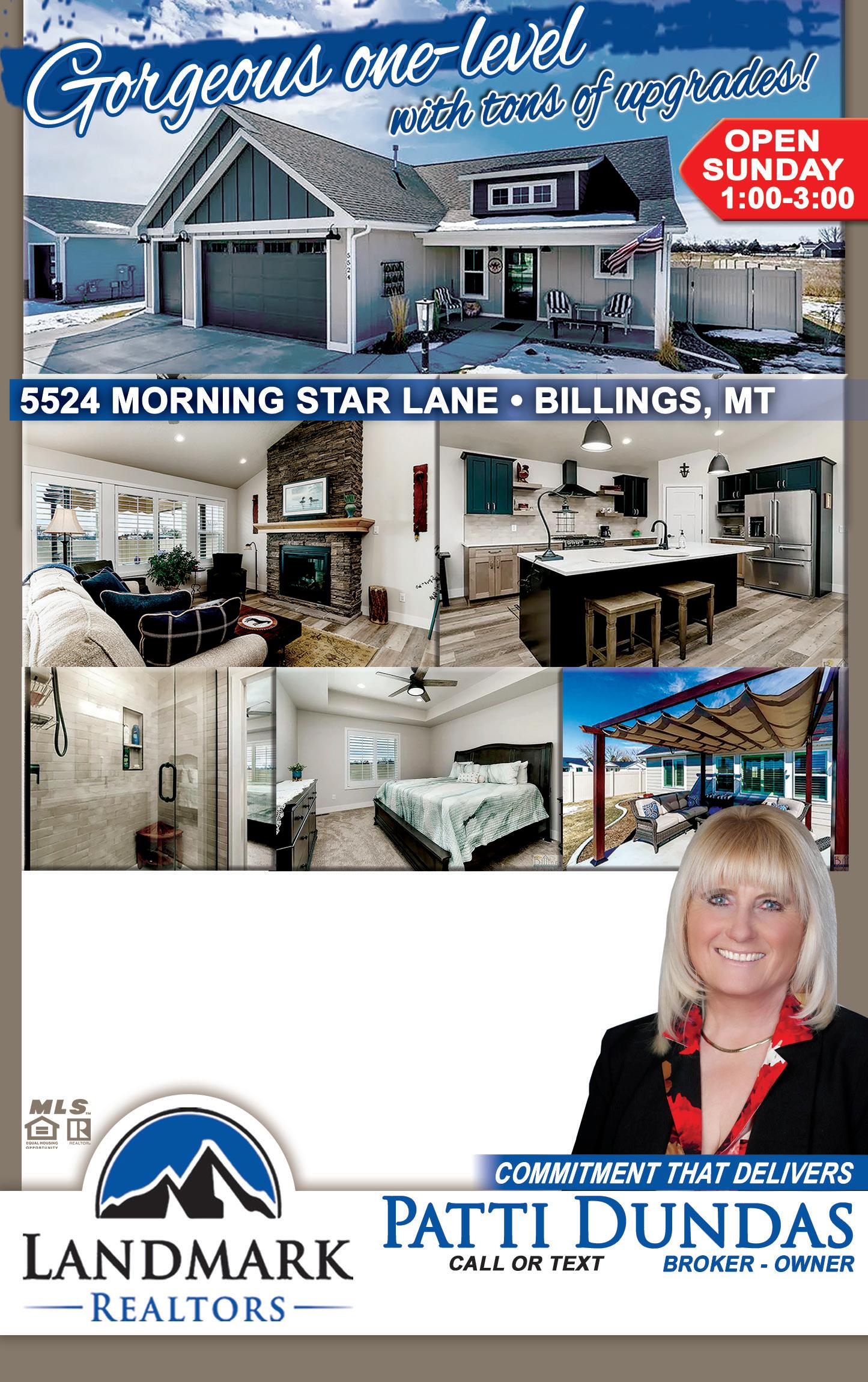 406-248-3641 CALL COZI WANNER 591-5841 OR LEVI WANNER 591-0221 4890 VANDAVEER ROAD - BILLINGS, MT $649,900 - MLS#337504 5 BEDS, 3 BATHS & 3,023 SQFT CALL COZI WANNER 591-5841 OR LEVI WANNER 591-0221 7045 BRONZE BOULEVARD - BILLINGS, MT $579,900 - MLS#338623 3 BEDS, 2 BATHS & 2,888 SQFT OPEN HOUSE SUNDAY 1:30-3:00 CALL COZI WANNER 591-5841 OR LEVI WANNER 591-0221 7031 COPPER SUNSET DRIVE - BILLINGS, MT $549,900 - MLS#338400 4 BEDS, 3 BATHS & 2,752 SQFT OPEN HOUSE THURS - FRI - SAT - SUN 11:00-5:00 CALL COZI WANNER 591-5841 OR LEVI WANNER 591-0221 7019 COPPER SUNSET DRIVE - BILLINGS, MT $529,900 - MLS#335946 4 BEDS, 3 BATHS & 2,752 SQFT OPEN HOUSE THURS - FRI - SAT - SUN 11:00-5:00 CALL COZI WANNER 591-5841 OR LEVI WANNER 591-0221 7025 COPPER SUNSET DRIVE - BILLINGS, MT $505,900 - MLS#338401 3 BEDS, 2 BATHS & 2,053 SQFT OPEN HOUSE THURS - FRI - SAT - SUN 11:00-5:00 CALL COZI WANNER 591-5841 OR LEVI WANNER 591-0221 7067 SHINY PENNY WAY - BILLINGS, MT $499,900 - MLS#338021 3 BEDS, 2 BATHS & 2,888 SQFT CALL COZI WANNER 591-5841 OR LEVI WANNER 591-0221 921 EL RANCHO - BILLINGS, MT $484,900 - MLS#338624 3 BEDS, 2 BATHS & 3,360 SQFT OPEN HOUSE SUNDAY 1:30-3:00 CALL COZI WANNER 591-5841 OR LEVI WANNER 591-0221 7052 COPPER VIEW WAY - BILLINGS, MT $449,900 - MLS#338328 3 BEDS, 2 BATHS & 1,623 SQFT CALL COZI WANNER 591-5841 OR LEVI WANNER 591-0221 870 EL RANCHO DRVE - BILLINGS, MT $409,900 - MLS#337751 3 BEDS, 2 BATHS & 1,576 SQFT CALL COZI WANNER 591-5841 OR LEVI WANNER 591-0221 979 ANACAPA LANE - BILLINGS, MT $339,900 - MLS#338902 3 BEDS, 2 BATHS & 1,349 SQFT