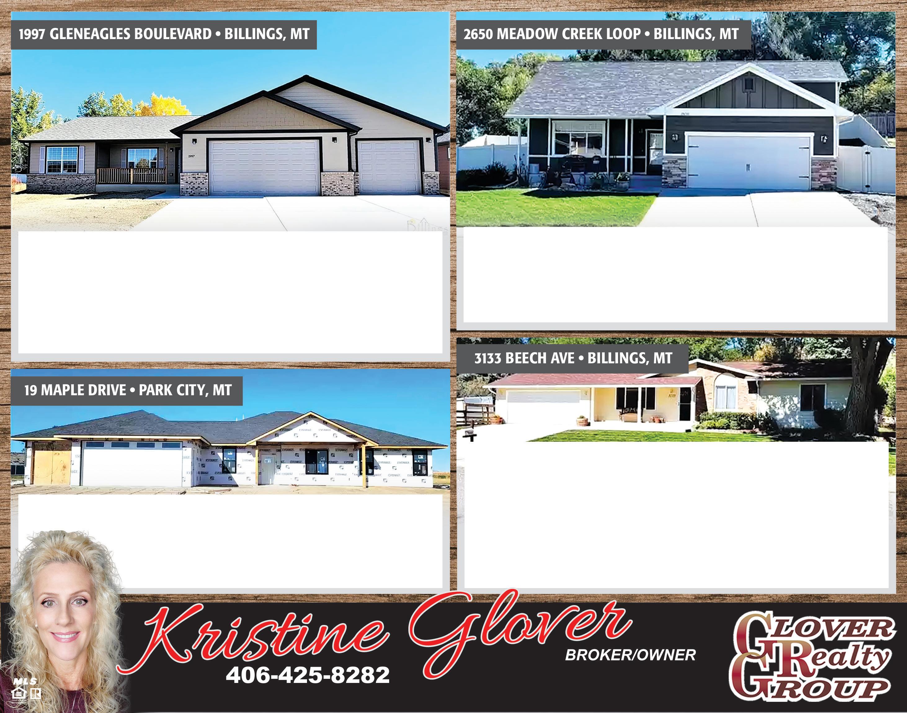 RE AL E S TATEPortfolio weeklyPortfolioPG. 2 www.BillingsRealEstate.org 7141 HELFRICK ROAD – BILLINGS, MT Lovely horse property in move-in condition. Only minutes from Billings. Escape the hustle & bustle of the city while being convenient for work & play. This home features spacious 1-level living. Large eat-in kitchen with island & generous pantry. Both a living & a family room for all of your entertaining needs. Oversized primary suite with walk-in closet, en-suite with separate tub & shower, as well as an additional space for an office or cozy reading nook. This home sits on 20 acres, fenced for livestock, with a seasonal stock well. This property has 2 large cisterns, a circular driveway for easy accessibility, new corrals, & loafing sheds. There’s an oversized double garage for our chilly Montana Winters, as well as plenty of extra space for toys and hobbies. In the Summer enjoy the expansive views from the front porch, back patio, or under the gazebo while grilling. $475,000 – MLS#335863 www.MilesCityForSale.com Amazing HillBrook Subdivision 4th Phase 1-acre New Construction Home By Elite construction!! Amazing view, 4-bedroom, 2 bath home with Gorgeous granite counters, rocked fireplace, open floor plan with vaulted ceilings just to name a few. Get in early and pick out wall paint color, lighting, flooring and plumbing fixtures. 10 minutes from Laurel and shopping 15 minutes from Billings. $585,000 – MLS# 331654 www.GloverRealtyGroupMT.com Kristine@gloverrg.com Gorgeous home located in highly desirable west end neighborhood. 5 bdrms, 3 bths, 2 car garage, egress windows, huge pantry plus to many extras to list. Entire home has been remodeled or updated. Includes separate, newly built unattached heated shop with powered roll up door, custom neoprene tile flooring and easy access from side alley where there is more than adequate parking for work vehicles or RV. Shop also includes new 375 plus Sq foot dwelling space with its own A/C, heat, kitchen and full bath. Suitable for large office, guest area, work out space and more! This bonus area is ready to become a rentable studio should you choose to make it one. Enjoy evenings by the natural gas fire pit in the stunning back yard with nearly 1000 sqft pf custom decking. Or relax while the shade from the beautiful trees and stamped concrete cool you down after a hot MT summer day. Truly a dream home priced to sell!!! $474,900 – MLS# 335381 WOW! Beautiful Home In BITTERROOT HEIGHTS. Updated designer paint, beautiful stainless appliances, double oven stove, wonderful pantry, Outstanding daylight basement with egress bedrooms. Wonderful family room, and that’s just for starters! Then step out on a love deck for coffee or a BBQ. Large patio for entertaining beautiful front yard landscape and did I mention EXTRA parking? Behind a secure gate! An absolutely Lovely place to call home! $409,000 – MLS# 335704 NEW CONSTRUCTION!! welcome Home....” One level” living at it finest in the fabulous Lake Hills Subdivision. Step into this newly constructed home that has comfort and Quality written all over it. large Vaulted Livingroom into a kitchen that just flows. Great center island for convenience and lovely stainless appliances. The master bedroom is on its own separate side of the house with a large master bath double sinks and a large walk-in closet. even the crawl space was done with absolute efficiency with easy access and lighting for amazing storage! The new home is easy to show and available to show right away set up your tour today!! $429,900 – MLS# 335805