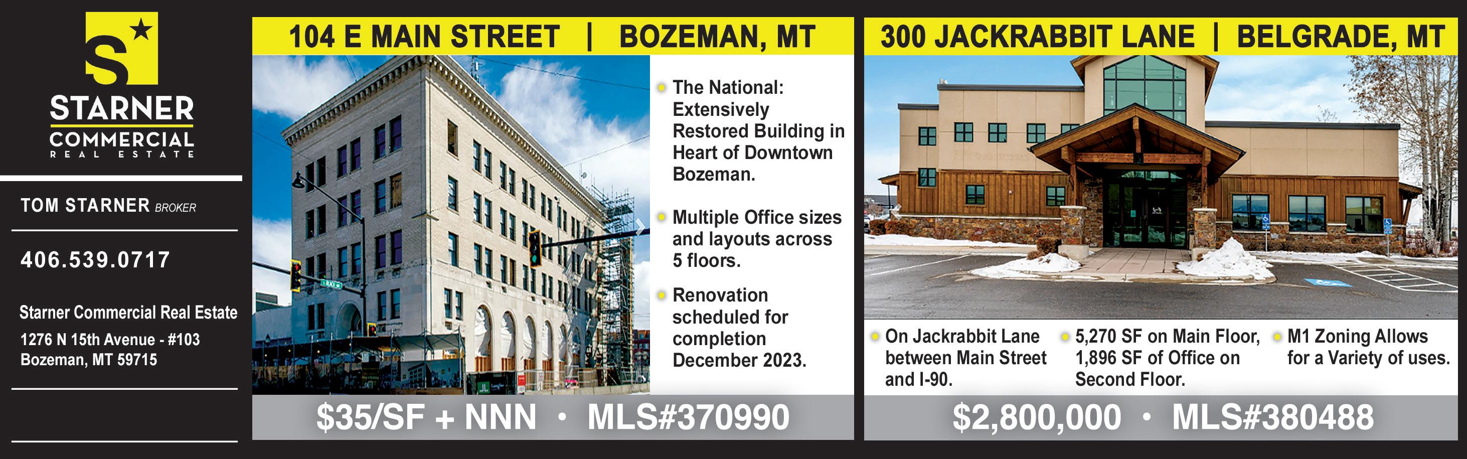 CENTRAL MONTANA edition EASTERN EDITION ONLINE VISIT US ONLINE: www .M ontana C o MM er C ial r eal e state . C o M OWNED & PRODUCED BY: RIM ADVERTISING, INC. • 406-656-0608 • WWW.RIMADVERTISING.COM MAY \ JUNE 2023 VOLUME 25 NUMBER 3 PRSRT STD U.S. POSTAGE PAID BILLINGS MT PERMIT NO.749 etmccaw@gmail.com mikedevries55@gmail.com russella17@gmail.com natedyk3@hotmail.com clkurowski@gmail.com eddiesteinhauer@gmail.com This +/- 27 ac is priced to sell. +/- 2,100 ft of highway frontage & in the path of progress. Great for a single user that needs some acreage for space. Could be a great location for a commercial Minor subdivision. No known covenants. $1,999,000 | MLS#376695 Call Mike DeVries 406-580-2345 TBD WEAVER ROAD – BELGRADE, MT 22 S GRAND AVE – BOZEMAN, MT Great opportunity for turn-key main floor office space. Featuring 11 private offices, conference room, kitchenette, reception area, & 2 baths + a lg open area for multiple workspaces & storage. The location & layout of this unique office building provide a flexible opportunity for your growing business. $15,166.68/mon gross | MLS#376540 Call Eddie Steinhauer 406-580-1456 rjungersma@gmail.com THORPE COMMERCIAL CENTER IN BELGRADE, MT Commercial Lots for sale.Excellent central location for your business or investment. Lots will have 3 phase power, natural gas, domestic water & paved access & stub for fire suppression. Commercial covenants w/flexibility for live/work. Don’t miss your opportunity to grab one of these. Final plat expected July 2023. $500,000.00-$999,000.00 MLS#380983, 380981, 380978, 380977, 380975, 380974, 380959 Call Mike DeVries 406-580-2345 WWW.BOZEMANHOMEFINDER.COM COMMERCIALMT.COM SOLD! SOLD! SOLD! SOLD! tom@starnercommercial.com www STARNERCOMMERCIAL.com
