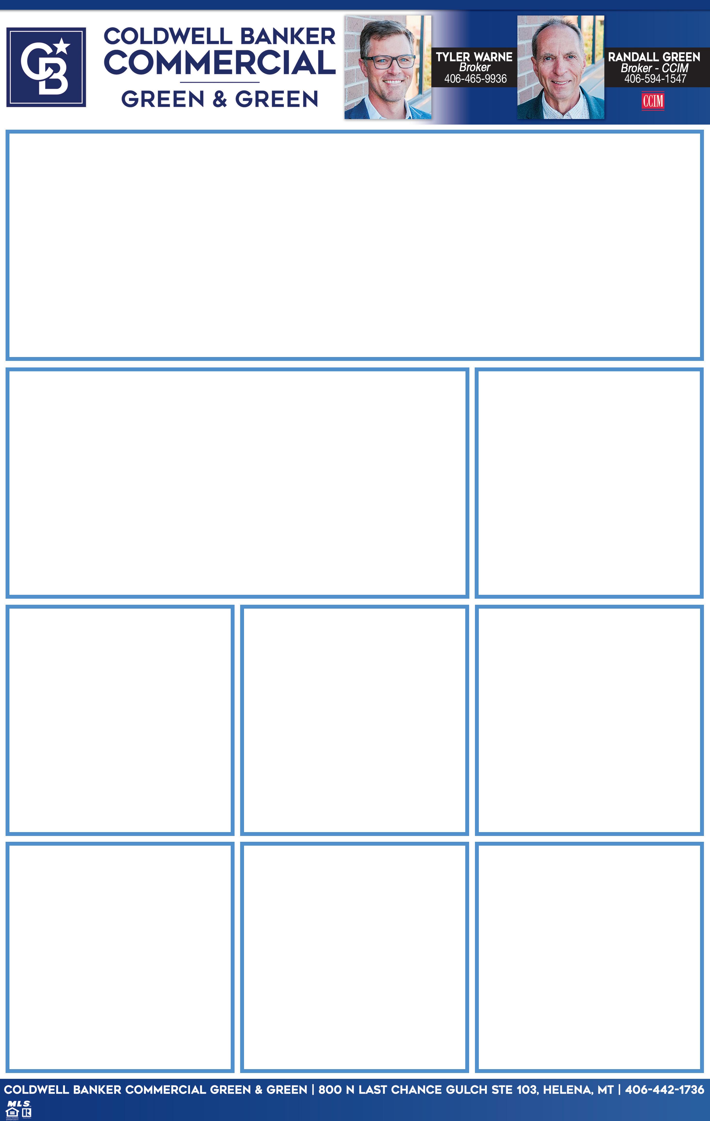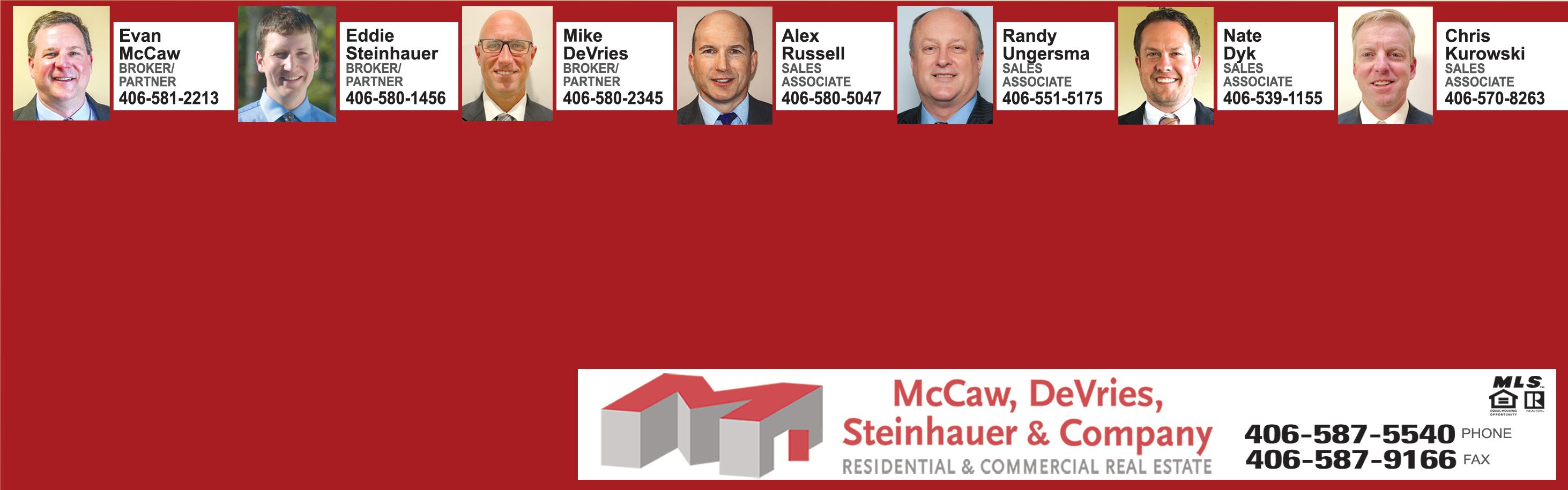 p 8 etmccaw@gmail.com eddiesteinhauer@gmail.com mikedevries55@gmail.com www.McCawAndCompany.com russella17@gmail.com natedyk3@hotmail.com clkurowski@gmail.com 1220 SIERRA • HELENA, MT Excellent location on this 2.5 ac lot on the north side of Helena. Ready to build whatever you need for your business or investment. Listing agent is related to the seller. $795,000 | MLS#367248 CALL MIKE DEVRIES 406-580-2345 TBD BOWLINE BLVD • BOZEMAN, MT 16 Ac R-4 Development ground in Belgrade w/future sewer capacity of over 300 units. Property is annexed & zoned R-4. Property is just North of new Story Creek Elementary school $6,000,000 | MLS#369314 CALL MIKE DEVRIES 406-580-2345 5555 THORPE ROAD BELGRADE, MT 10 Ac/435,600 Sqft. High Traffic Location. No Zoning, No Covenants, Out of the Belgrade City Limits. Square shaped parcel. In a growing high traffic intersection. Self Storage, Commercial, retail options. Sellers are Montana Real Estate Licensees. $3,500,000 | MLS#36357 CALL EVAN MCCAW 406-581-2213 AVAILABLE NOW! TBD WEAVER ROAD BELGRADE, MT This +/- 27 ac is priced to sell. +/2,100 ft of highway frontage & in the path of progress. Great for a single user that needs some acreage for space. Could be a great location for a commercial Minor subdivision. No known covenants. $1,999,000 | MLS#376695 CALL MIKE DEVRIES 406-580-2345 NEW LISTING! 22 S GRAND AVENUE • BOZEMAN, MT Great opportunity for turn-key main floor office space in Downtown Bozeman. Featuring 11 private offices, conference room, kitchenette, reception area, & 2 baths plus a lg open area for multiple workspaces & storage. The location & layout of this unique office building provide a flexible opportunity for your growing business. PRICE $15,166.68/ MONTH GROSS | MLS#376540 CALL EDDIE STEINHAUER 406-580-1456 OFFICE SPACE • BOZEMAN DOWNTOWN! FOR LEASE! rjungersma@gmail.com THORPE COMMERCIAL CENTER IN BELGRADE, MT Commercial Lots for sale.Excellent central location for your business or investment. Lots will have 3 phase power, natural gas, domestic water & paved access and stub for fire suppression. Commercial covenants w/flexibility for live/work. Don’t miss your opportunity to grab one of these. Final plat expected July 2023. PRICE $500,000.00$999,000.00 MLS#380983, 380981, 380978, 38097, 380975, 380974, 380959 CALL MIKE DEVRIES 406-580-2345