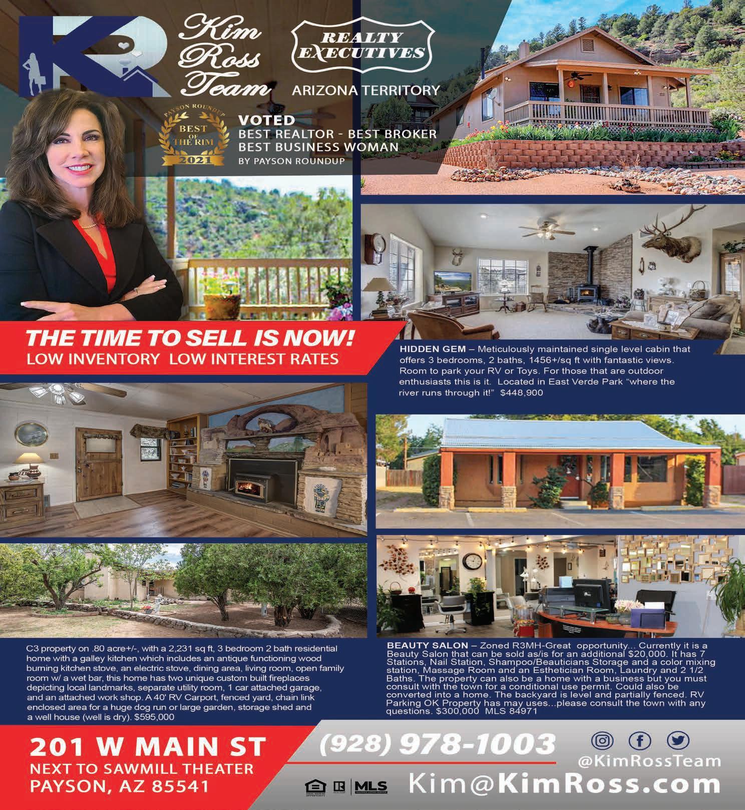 3 View On-Line at RimCountryReview.Com Tour on the Web at www.SuzyTubbs.Com Suzy Tubbs, REALTOR® Young Realty & Investment, Payson Office (928) 978-3256 • (928) 474-4554 See More Inside on Page 28 ERA REAL ESTATE SM EACH ERA® OFFICE INDEPENDENTLY OWNED AND OPERATED 306 N Grapevine Drive, Chaparral Pines: Custom elegance! 3BRs, 3 baths, ±2780 sf, ±0.53-acre parcel in a private, guard-gated golf community. Recently updated top to bottom, from the island kitchen and the master bath to the beautifully cantilevered wrap-around deck with breathtaking mountain views. Home office, media room, covered patio and gazebo. $999,000 (89892) © 19932024 The Onyx Group • V (928) 476-4333 • M (928) 951-2602 • POB 2262 • Payson AZ 85547-2262 • eMail: RimCountryReview@gmail.com • Web: www.RimCountryReview.com Richard Pfister REALTOR® Shayla Pfister Radio Personality Guy & Vi Pfister REALTOR® & Transaction Expert God, Family & Community Discover your dream home here in the Rim Country! Call us Today! (928) 978-2838 or (928) 951-4268 This is where Faith meets Community, and where you'll find your perfect home! www.PaysonGuy.com (928) 978-1003 Kim@KimRoss1.com ARIZONA TERRITORY Kim Ross Team www.KimRoss.com 27 YEARS' EXPERIENCE