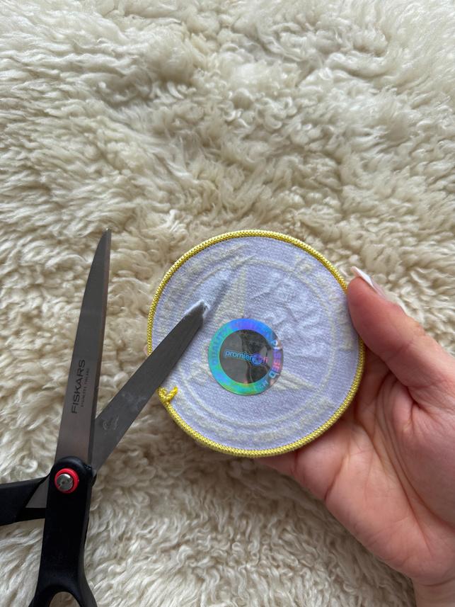 Irroita haalarimerkistä takakangas, jotta merkistä tulee joustavampi, ja se on helpompi ommella.