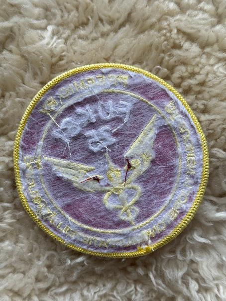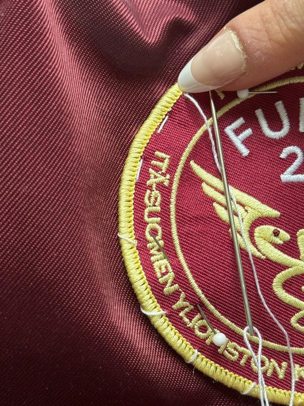 Tee ensimmäinen pisto haalarimerkin takapuolelta, jotta solmu jää piiloon