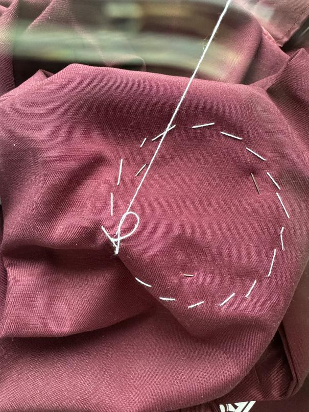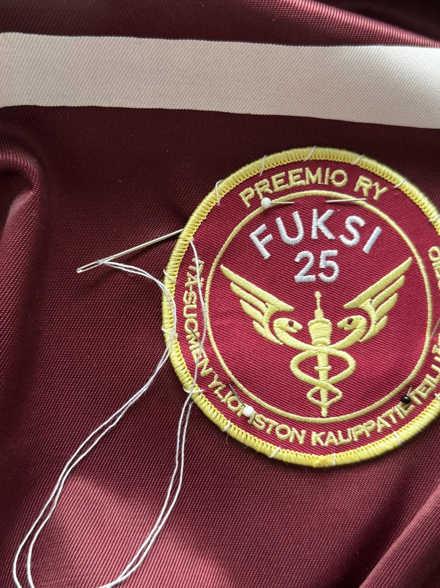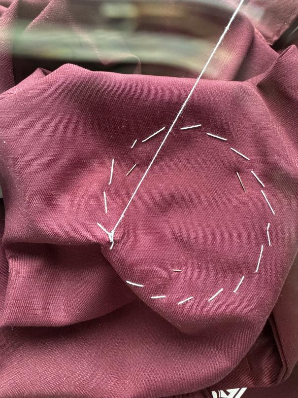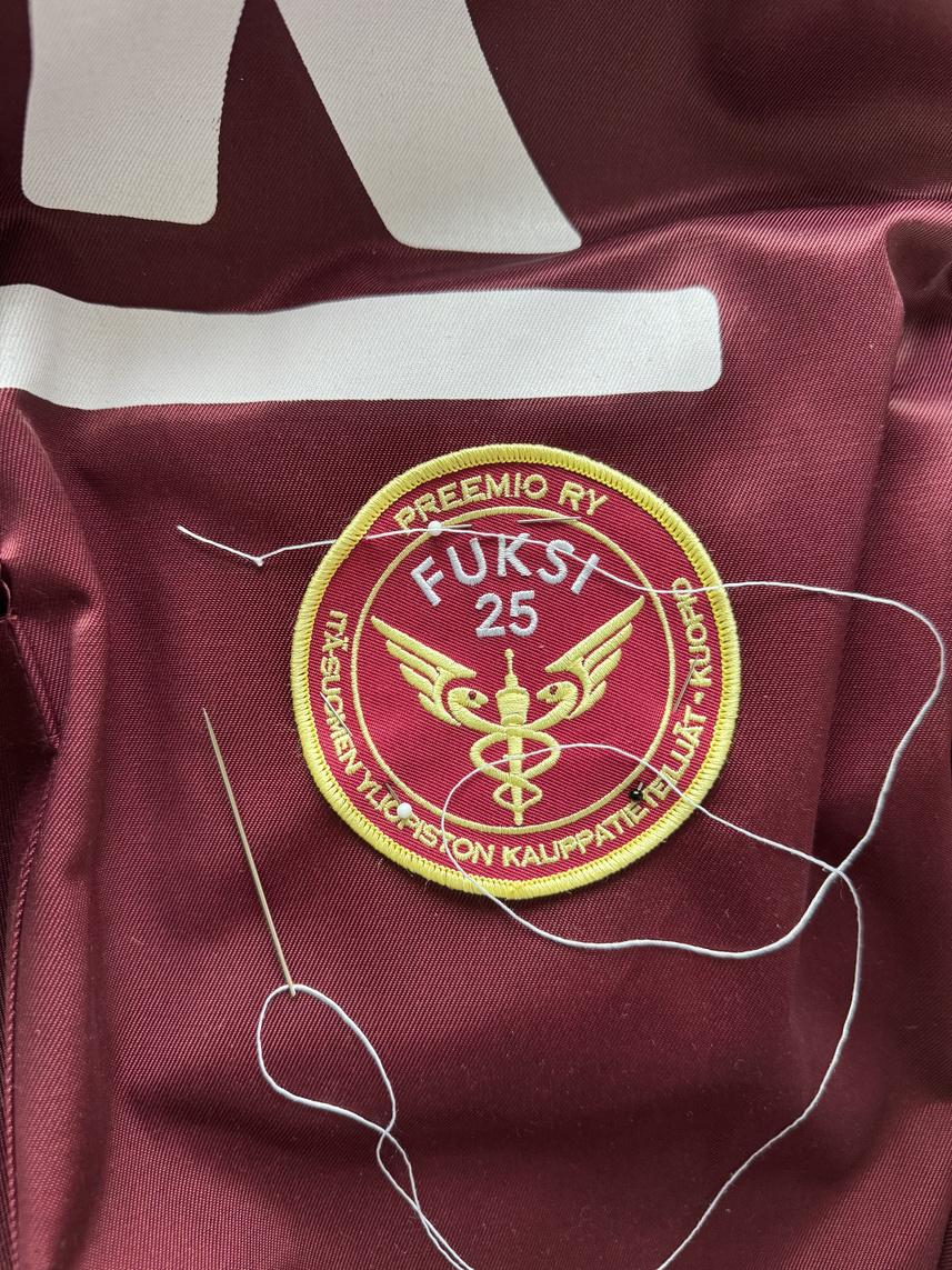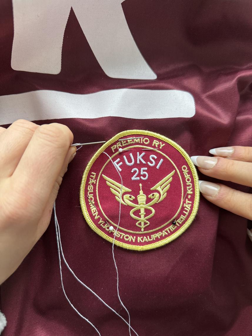 Kun merkki on ommeltu, pistä viimeinen pisto nurjalle puolelle haalareiden sisään.