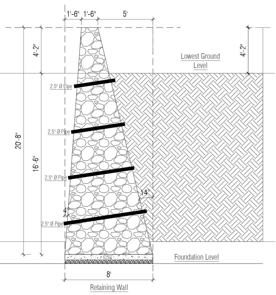 Here, the diagram above illustrates the details of the retaining wall. These retaining walls incorporate weep holes designed to alleviate the pressure and moisture exerted by the retained soil against the wall. As the wall's height increases, it gradually tapers down in size This intentional design minimizes the risk of the wall bending or toppling under the inuence of soil pressure, ensuring structural stability.