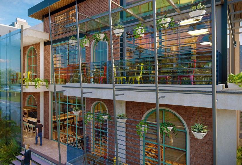 The rst oor of the restaurant has been thoughtfully laid out to p r o v i d e a v e r s a t i l e a n d enjoyable dining experience. It divides the space into two distinct dining halls and a central main hall, with a strategically positioned stage that serves m u l t i p l e p u r p o s e s , a c c o m m o d a t i n g s m a l l meetings, conferences, and intimate concerts while ensuring unobstructed views from all angles, including the primary dining area Glass partitions between these areas maintain a sense of separation while allowing for easy circulation. A balcony dining area adds charm and offers diners scenic views, and restrooms are conveniently located on the eastern side of the oor for guest comfort. This well-planned arrangement not only maximizes functionality but also creates an aesthetically p l e a s i n g a n d a d a p t a b l e atmosphere, catering to a range of dining preferences and event needs, making it an attractive destination for both residents and visitors.