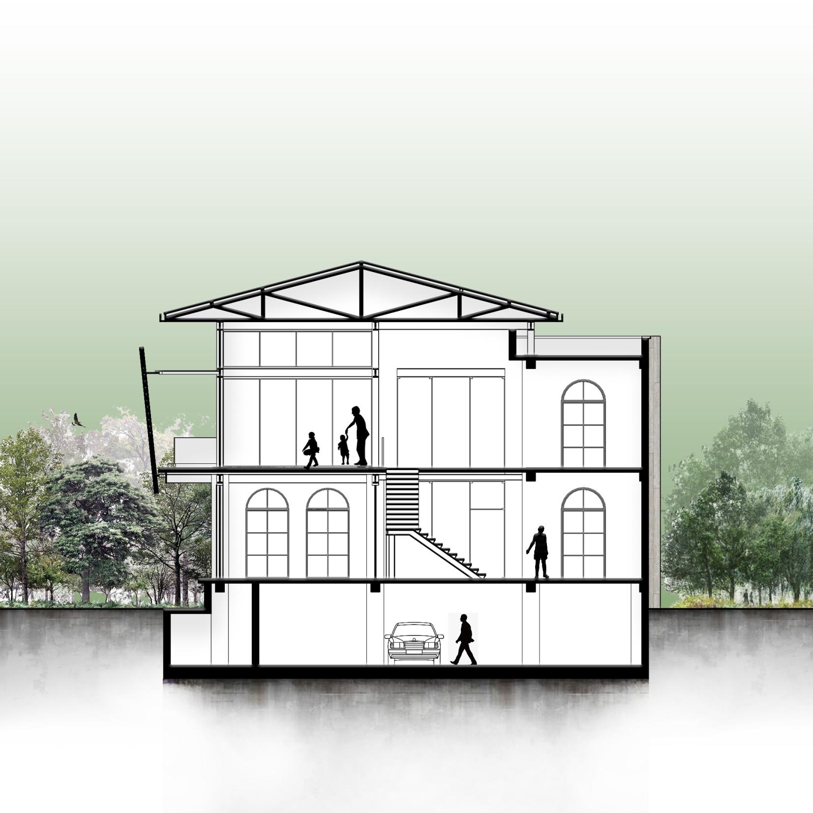 In the section, it's apparent that the basement serves a dual purpose, accommodating both parking spaces and service facilities. Furthermore, the inclusion of a metal staircase is noticeable, enhancing access within the structure. An interesting cost-saving measure is being implemented on the rst oor, where the original four columns are undergoing replacement with steel columns and beams, demonstrating an intention to economize on construction expenses while maintaining structural integrity.