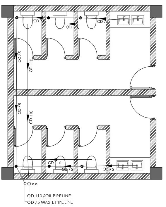 The soil pipes in this system are designed to transport blackwater, which includes wastewater from toilets and urinals. The pipes have a slope of 1:100, ensuring efcient ow. To facilitate smooth transport, they are turned at a 45-degree angle. These pipes consist of an outer layer made of HDPE (150mm) for durability and an inner layer made of PVC (110mm) to effectively transport the wastewater. This combination of materials and design ensures the reliable and efcient disposal of soiled water from the sanitation xtures.