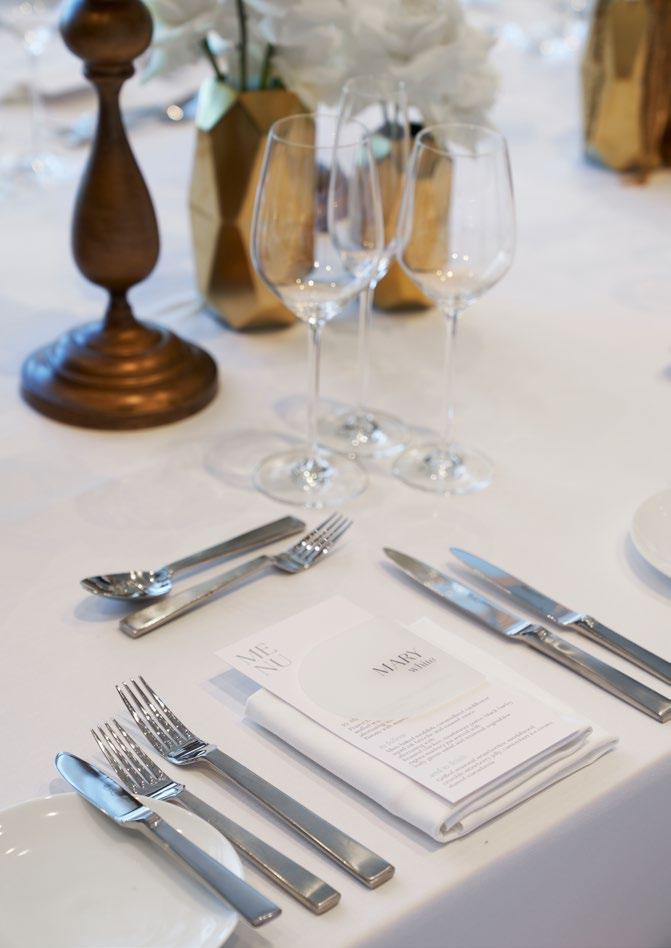 – Deluxe table linen and napkins in black or white with glassware, crockery,cutlery andwhiteMilanochairs