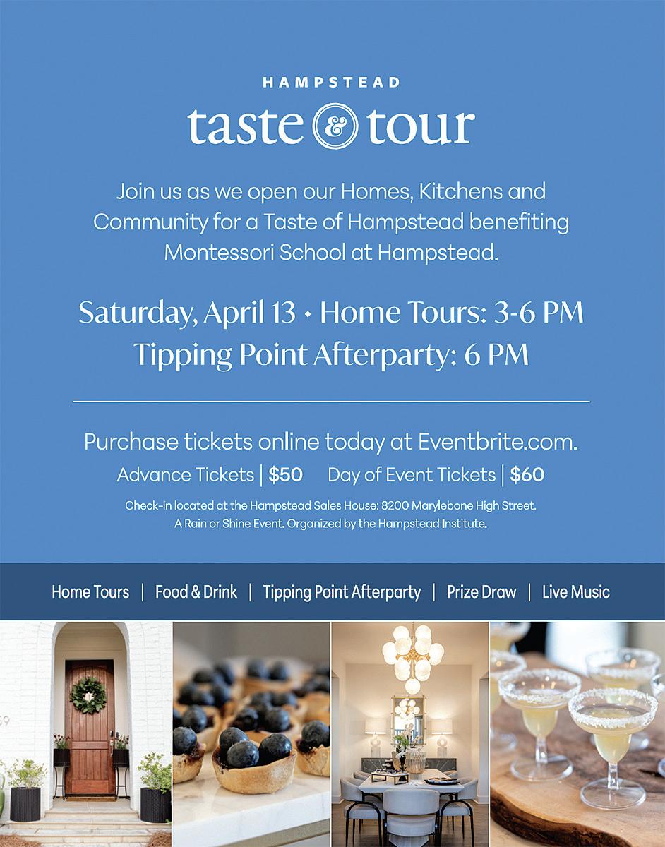 Hampstead Taste & Tour returns Saturday, April 13 with our biggest and best event of the year! Purchase your tickets online now to tour our beautiful private homes with food, drinks, and an after-party at the Tipping Point on Saturday April 13 from 3-6 pm. Showing a variety of house plans, the doors will open for guests to enjoy themed complimentary light bites and refreshments / cocktails while touring design and décor elements. The tour will conclude at The Tipping Point with giveaways and live music from 6 pm. Ticket Sales and Event Sponsorships benefit The Montessori School at Hampstead - including a major announcement for our community school!