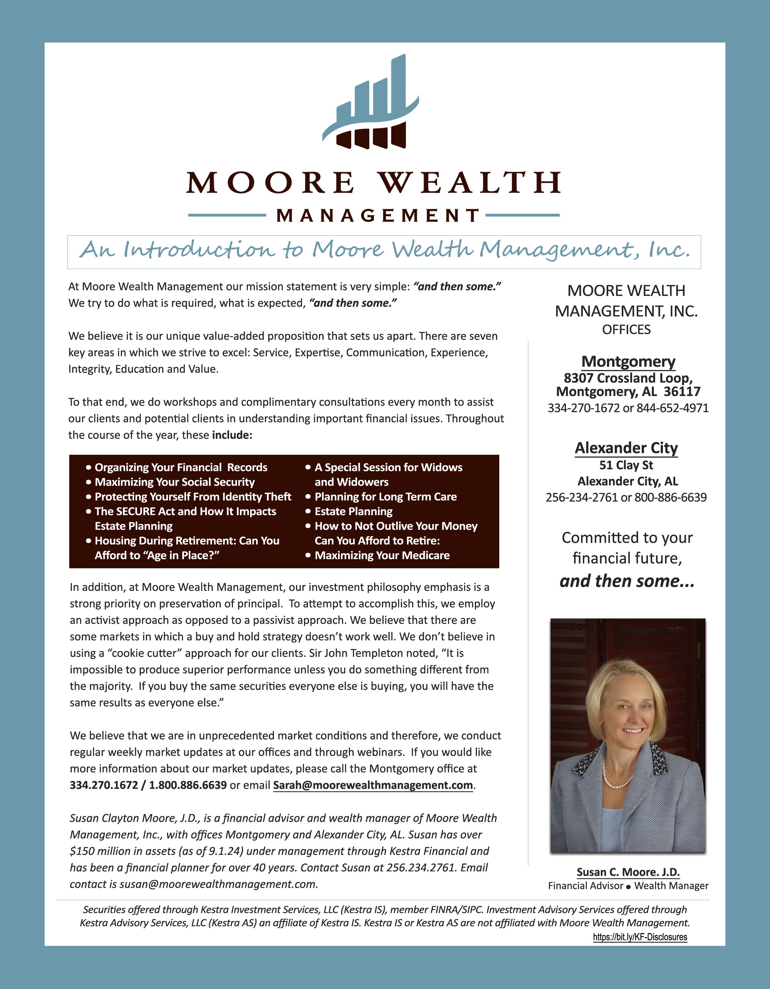 Susan Clayton Moore, J.D., is a financial advisor and wealth manager of Moore Wealth Management, Inc., with offices Montgomery and Alexander City, AL. Susan has over $150 million in assets (as of 9.1.24) under management through Kestra Financial and has been a financial planner for over 40 years. Contact Susan at 256.234.2761. Email contact is susan@moorewealthmanagement.com.