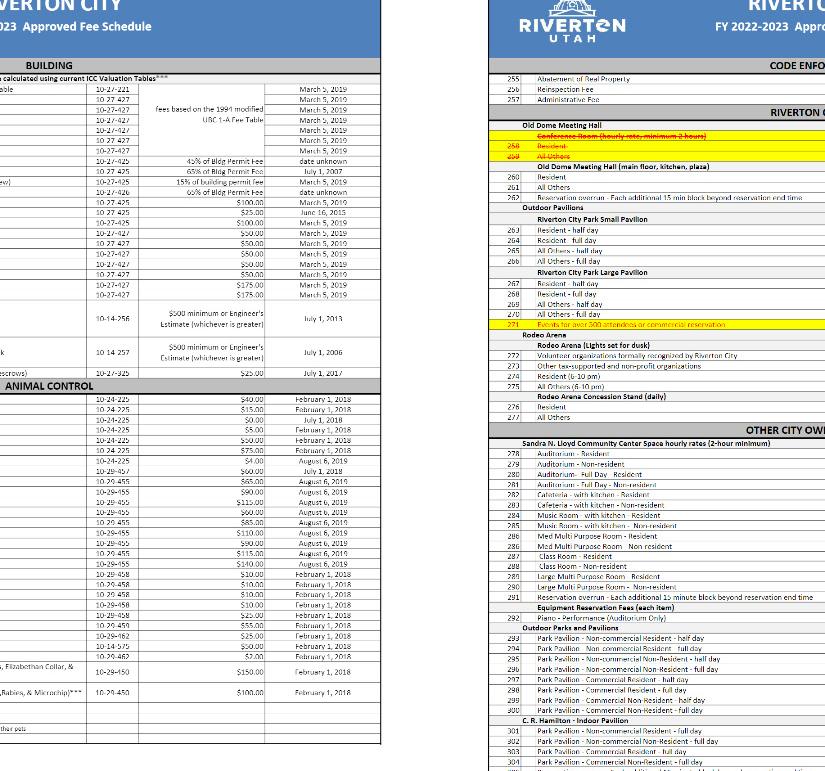 FY 2023‐2024 Approved Fee Schedule 255Abatement of Real Property 10‐33‐530 Contracted CostJune 16, 2015 256Reinspection Fee 10‐33‐530 $50.00July 1, 2003 257Administrative Fee 10‐33‐530 $100.00July 1, 2003 258Resident 10‐31‐424 $600.00April, 9 2015 259All Others 10‐31‐424 $1,200.00April, 9 2015 260Reservation overrun ‐ Each additional 15 min block beyond reservation end time 10‐36‐690 $50.00July 1, 2017 Riverton City Park Small Pavilion 261 Resident ‐ half day 10‐31‐425 $35.00January 1,2019 262Resident ‐ full day 10‐31‐425 $50.00January 1,2019 263All Others ‐ half day 10‐31‐425 $60.00January 1,2019 264All Others ‐ full day 10‐31‐425 $90.00January 1,2019 Riverton City Park Large Pavilion 265Resident ‐ half day 10‐31‐425 $75.00April, 9 2015 266Resident ‐ full day 10‐31‐425 $125.00April, 9 2015 267All Others ‐ half day 10‐31‐425 $125.00April, 9 2015 268 All Others ‐ full day 10‐31‐425 $200.00April, 9 2015 269Events for over 500 attendees or commercial reservation 10‐31‐425 $1,000.00January 1, 2023 Rodeo Arena (Lights set for dusk) 270Volunteer organizations formally recognized by Riverton City 10‐31‐477 No ChargeJuly 1, 2010 271Other tax‐supported and non‐profit organizations 10‐31‐477 $10.00July 1, 2017 272Resident (6‐10 pm) 10‐31‐477 $60.00July 1, 2019 273 All Others (6‐10 pm) 10‐31‐477 $120.00July 1, 2019 Rodeo Arena Concession Stand (daily) 274Resident 10‐31‐477 $100.00 July 1, 2016 275All Others 10‐31‐477 $200.00 July 1, 2016 Sandra N. Lloyd Community Center Space hourly rates (2‐hour minimum) 276C101 (Old Cafeteria) ‐ Resident 10‐28‐479 $45.00March 19, 2024 277 C101 (Old Cafeteria) ‐ Non resident 10‐28‐479 $90.00March 19, 2024 278C102 (Old Multipurpose) ‐ Resident 10‐28‐479 $45.00March 19, 2024 279C102 (Old Multipurpose) ‐ Non resident 10‐28‐479 $90.00March 19, 2024 280M101 (Old Music Room) ‐ Resident 10‐28‐479 $45.00March 19, 2024 281M101 (Old Music Room) ‐ Non resident 10‐28‐479 $90.00March 19, 2024 282Auditorium (includes lobby, balcony and green rooms) ‐ Resident 10‐28‐479 $80.00March 19, 2024 283Auditorium (includes lobby, balcony and green rooms) ‐ Non resident 10‐28‐479 $160.00March 19, 2024 284Auditorium ‐ Full Day ‐ (includes lobby, balcony and green rooms) ‐ Resident 10‐28‐479 $600.00March 19, 2024 285Auditorium ‐ Full Day ‐ (includes lobby, balcony and green rooms) ‐ Non resident 10‐28‐479 $1,200.00March 19, 2024 286Back Plaza (includes pavilion and room C101) ‐ Resident 10‐28‐479 $160.00 March 19, 2024 287Back Plaza (includes pavilion and room C101) ‐ Non resident 10‐28‐479 $320.00March 19, 2024 288Back Plaza ‐ Full Day ‐ (includes pavilion and room C101) ‐ Resident 10‐28‐479 $600.00March 19, 2024 289Back Plaza ‐ Full Day ‐ (includes pavilion and room C101) ‐ Non resident 10‐28‐479 $1,200.00March 19, 2024 290Reservation overrun ‐ Each additional 15 minute block beyond reservation end time 10‐36‐690 $50.00 July 1, 2017 Equipment Reservation Fees (each item) 291Piano ‐ Performance (Available for rent in the auditorium only) 10‐31‐422 $20.00July 1, 2010 292Park Pavilion ‐ Non‐commercial Resident ‐ half day 10‐31‐420 $35.00January 1,2019 293Park Pavilion ‐ Non‐commercial Resident ‐ full day 10‐31‐420 $50.00January 1,2019 294Park Pavilion ‐ Non‐commercial Non‐Resident ‐ half day 10‐31‐420 $60.00January 1,2019 295Park Pavilion ‐ Non‐commercial Non‐Resident ‐ full day 10‐31‐420 $90.00January 1,2019 296Park Pavilion ‐ Commercial Resident ‐ half day 10‐31‐420 $38.00January 1,2019 297Park Pavilion ‐ Commercial Resident ‐ full day 10‐31‐420 $57.00January 1,2019 298Park Pavilion ‐ Commercial Non‐Resident ‐ half day 10‐31‐420 $75.00January 1,2019 299Park Pavilion ‐ Commercial Non‐Resident ‐ full day 10‐31‐420 $113.00January 1,2019 C. R. Hamilton ‐ Indoor Pavilion 300Park Pavilion ‐ Non‐commercial Resident ‐ full day 10‐31‐421 $300.00January 1,2019 301Park Pavilion ‐ Non‐commercial Non‐Resident ‐ full day 10‐31‐421 $600.00January 1,2019 302Park Pavilion ‐ Commercial Resident ‐ full day 10‐31‐421 $300.00January 1, 2017 303Park Pavilion ‐ Commercial Non‐Resident ‐ full day 10‐31‐421 $600.00January 1, 2017 304Reservation overrun ‐ Each additional 15 minute block beyond reservation end time 10‐36‐690 $50.00 July 1, 2017 RIVERTON