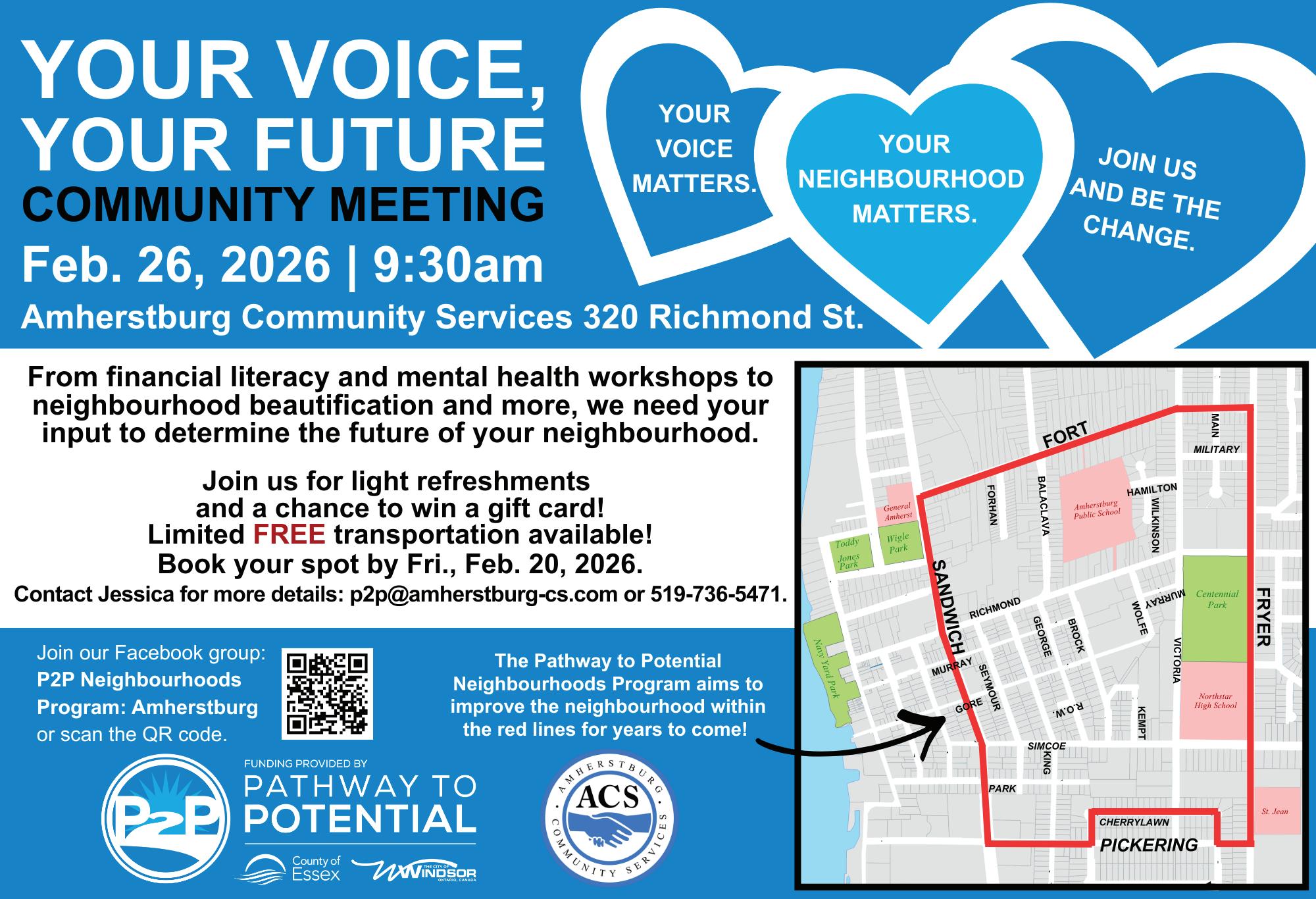AMHERSTBURG COMMUNITY SERVICES; Located at 320 Richmond St., 519-7365471. Meals on Wheels, CareLink Accessible Transportation, Senior Support, Keep The Heat, Ontario Energy Support Program & more. Please call to see how we can help! Food bank runs Tuesday, Thursday, Friday with curbside pickup available.